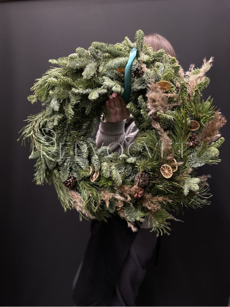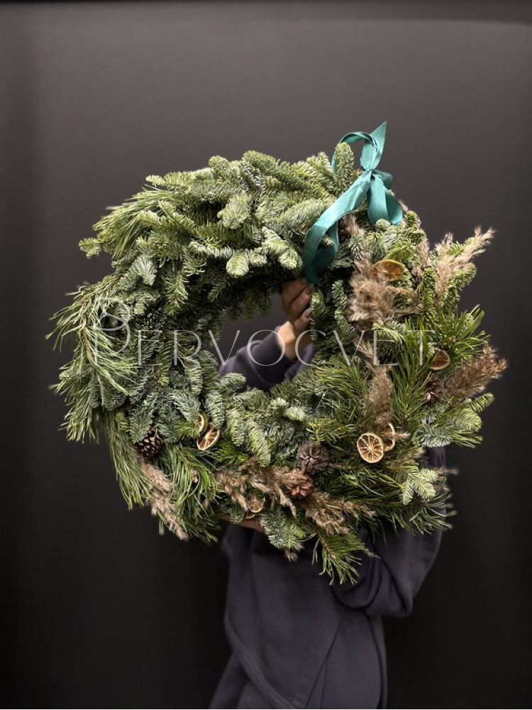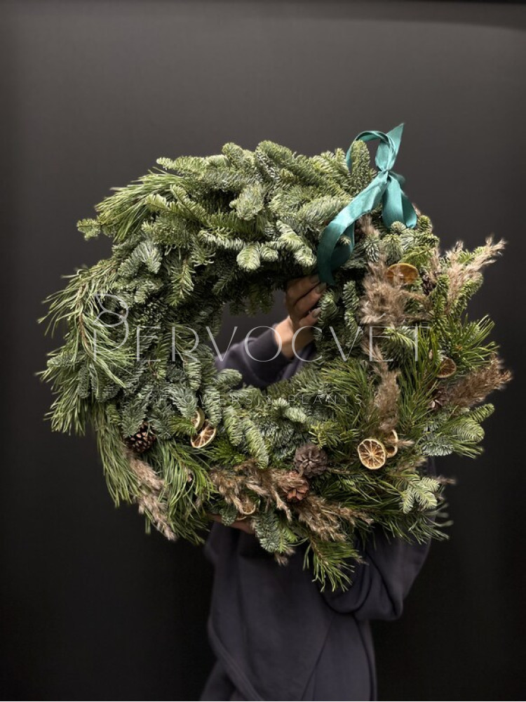 Венок новогодний из натуральной пушистой пихты Нобилис, с натуральном декором из местных сухоцветов - пампасной травы и долек лайма (мандарина). Идеальное решения для украшения как входной зоны, так и интерьера.