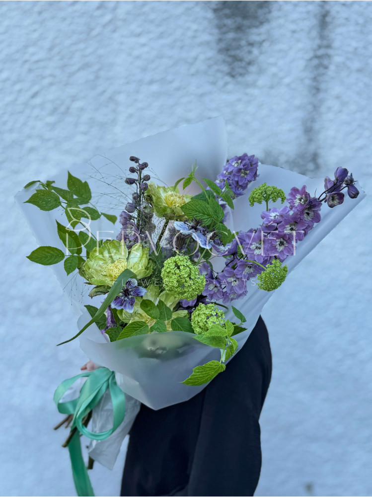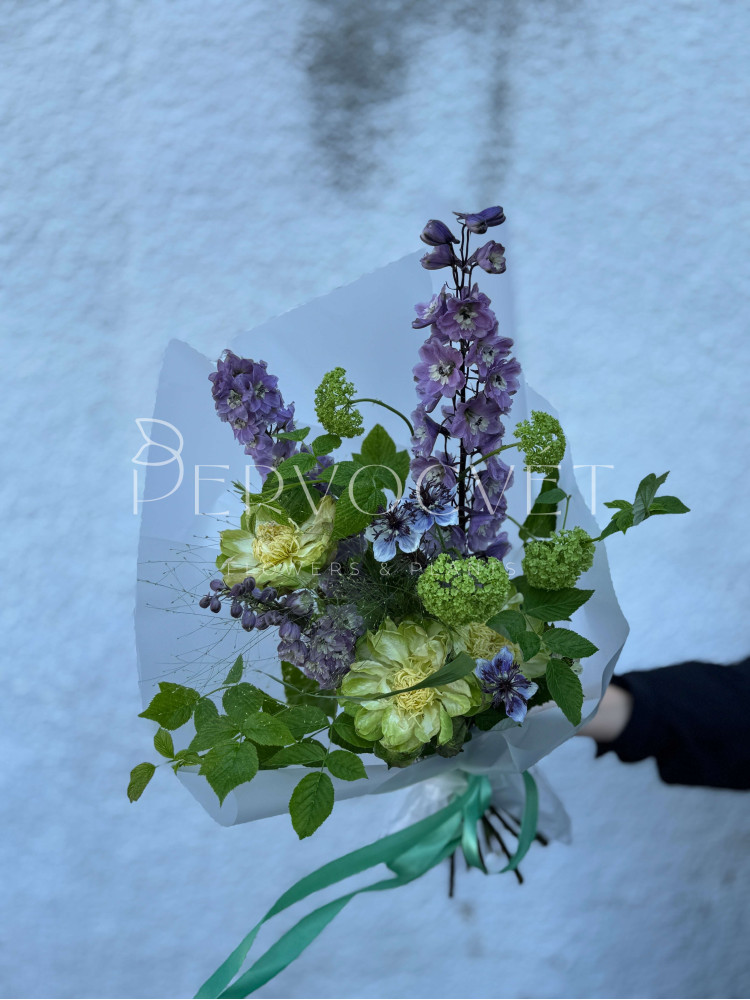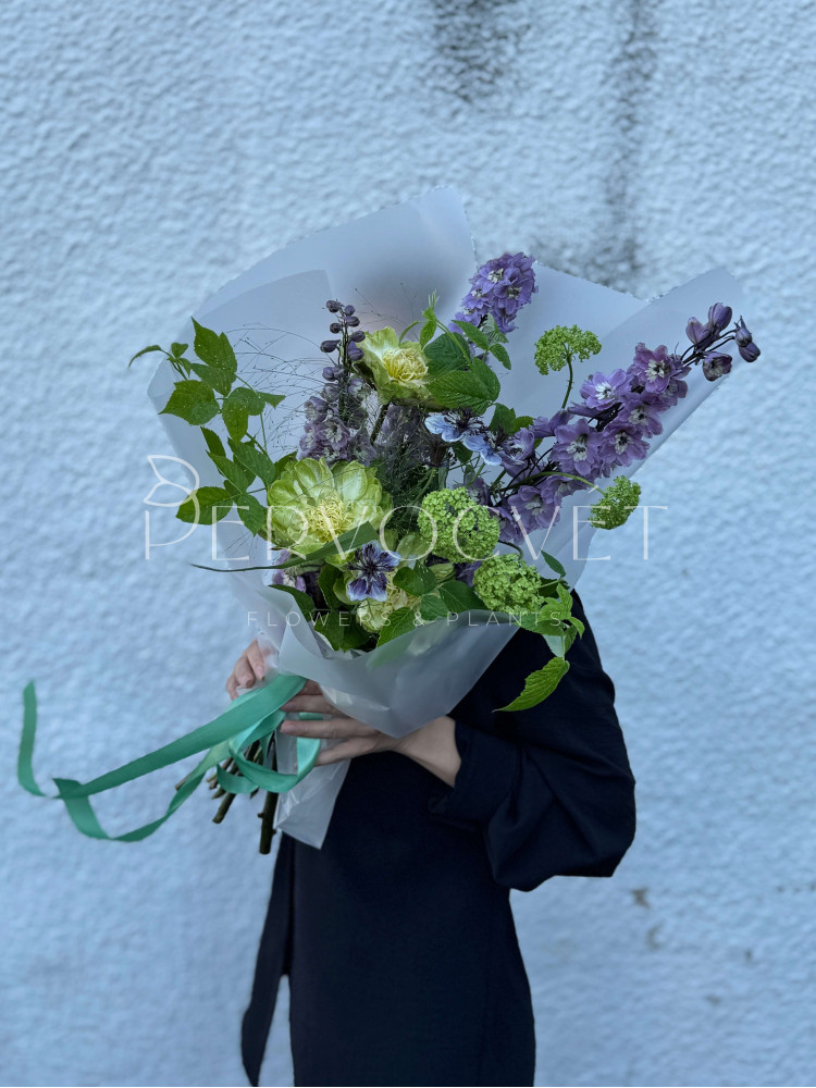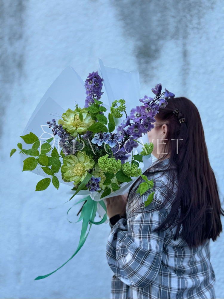 Зеленые розы и сиреневый дельфиниум - самое редкое в одном садовом букете, с веточками малины, злаками паникума и синей нигелы. Раскидистый букет как охапка самого прекрасного и необычного. Для необычной девушки, которая ценит редкие букеты !