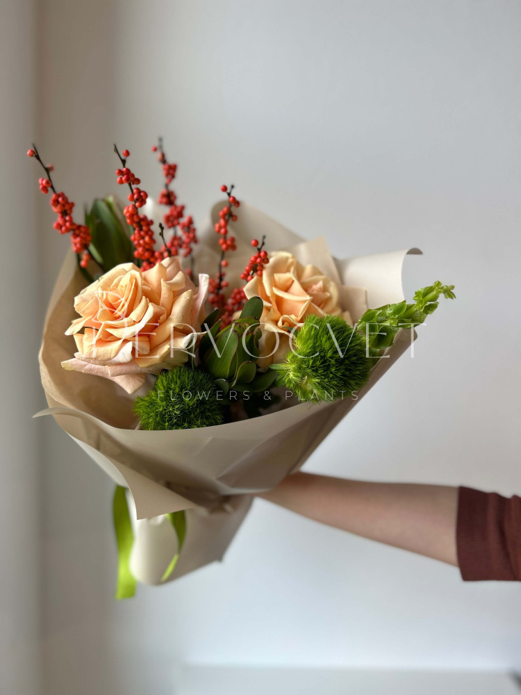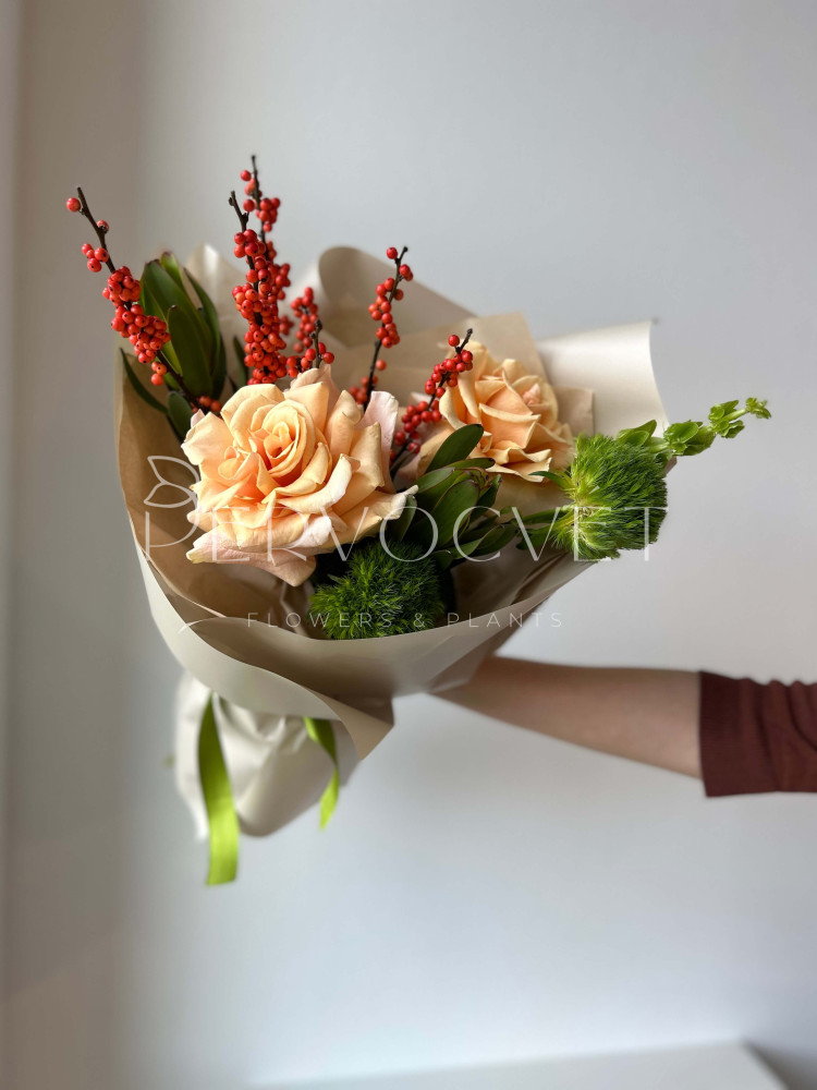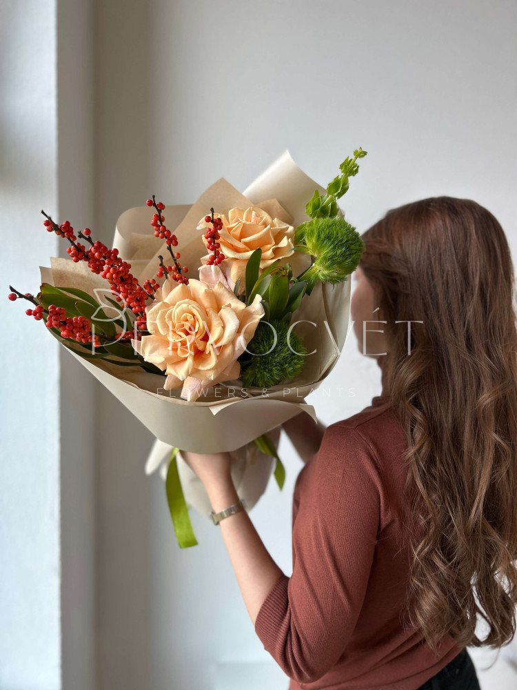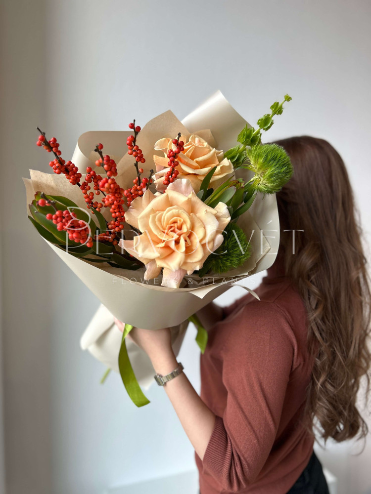 Осенний или зимний сад ?! Стойкий состав уникального сада: французская роза в оттенке персика, ягоды красного илекса, редкая гвоздика Грин Трик и зеленые леукодендроны. Красивый яркий банч, для настроения в домашней вазе в этом сезоне!