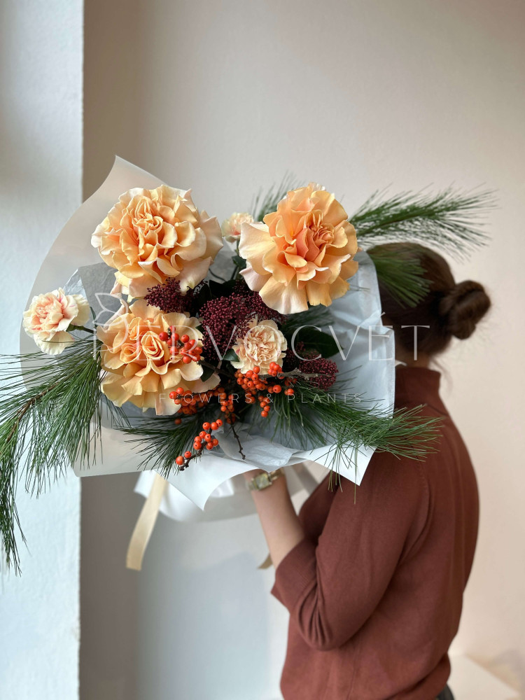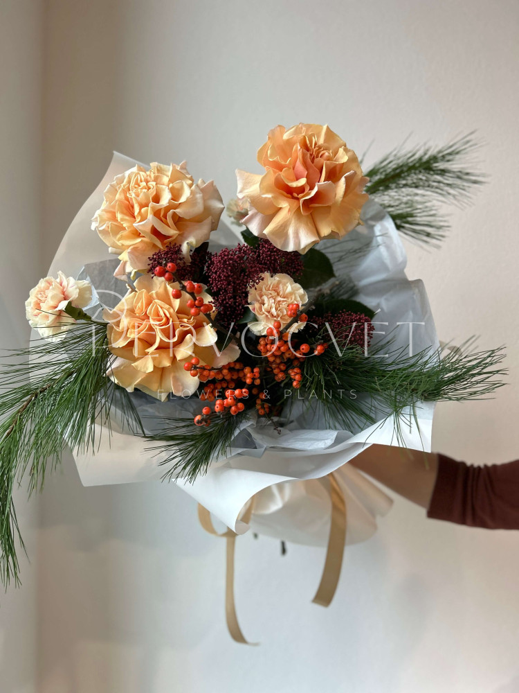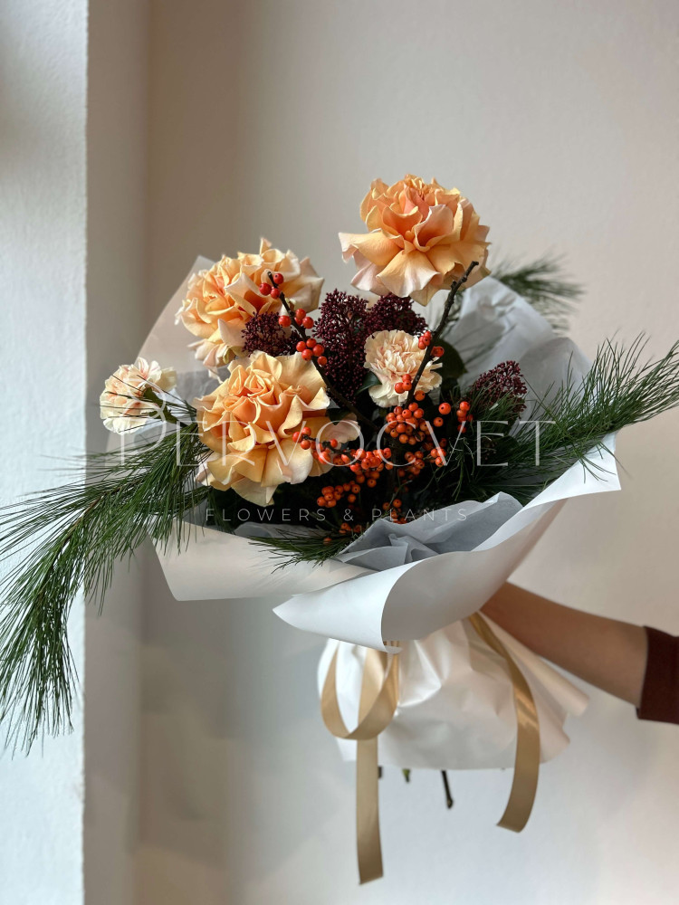 Новинка зимы 2025-26 ! Персиковая французская роза, сосновые веточки, стойкие диантусы и ягоды Илекса. Зимнее настроение обеспечено.