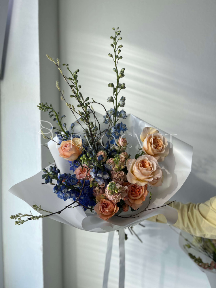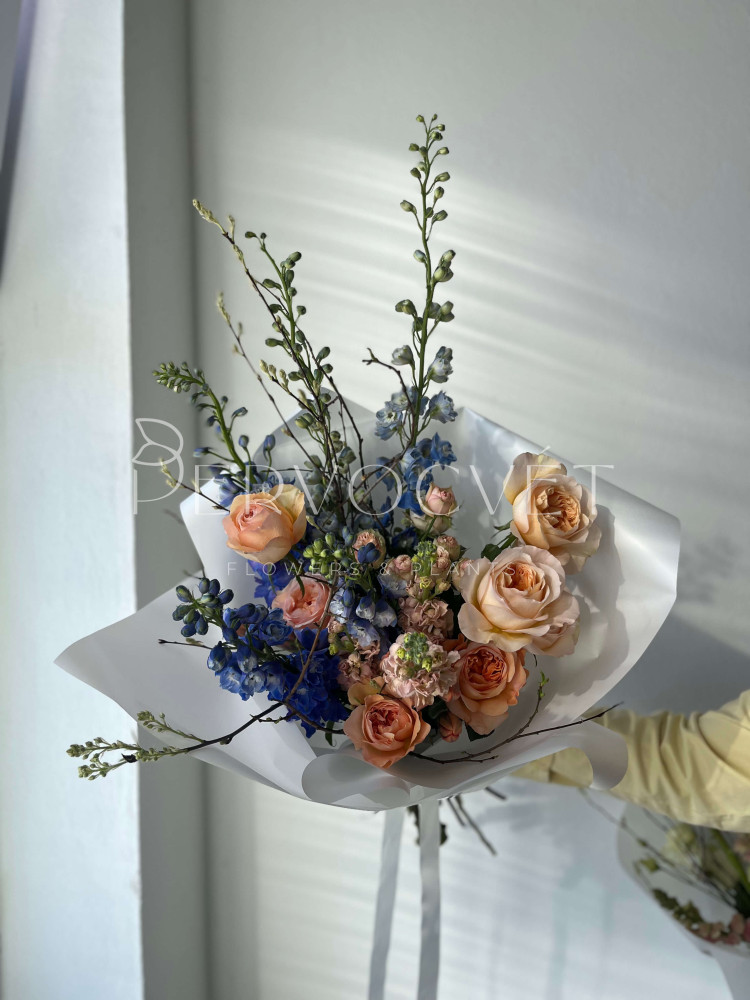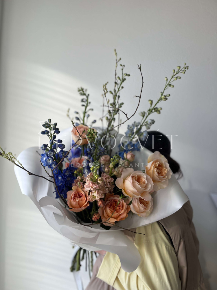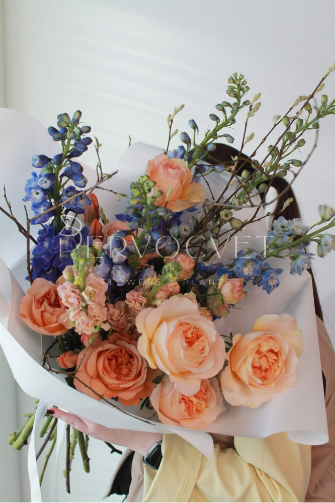 состав: дельфиниум 5, пионовидная роза 7, тюльпан импорт 5, маттиола 3, кустовая пионовидная роза 1, цветущие ветви (вишня или персик), фисташка (тех.зелень)