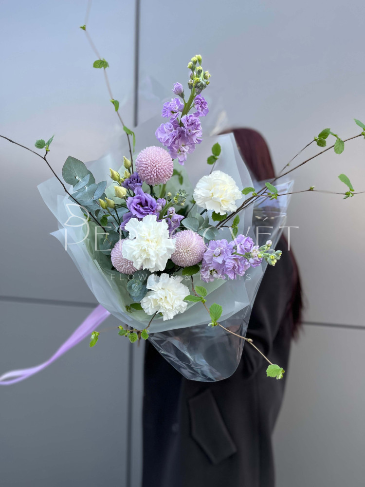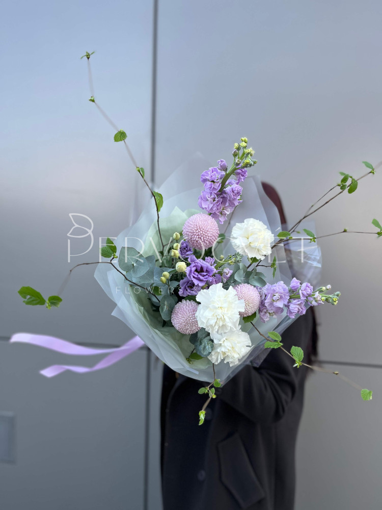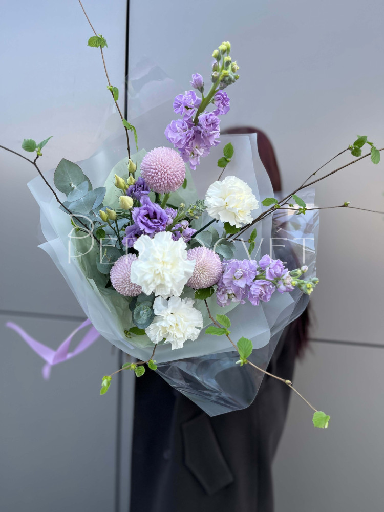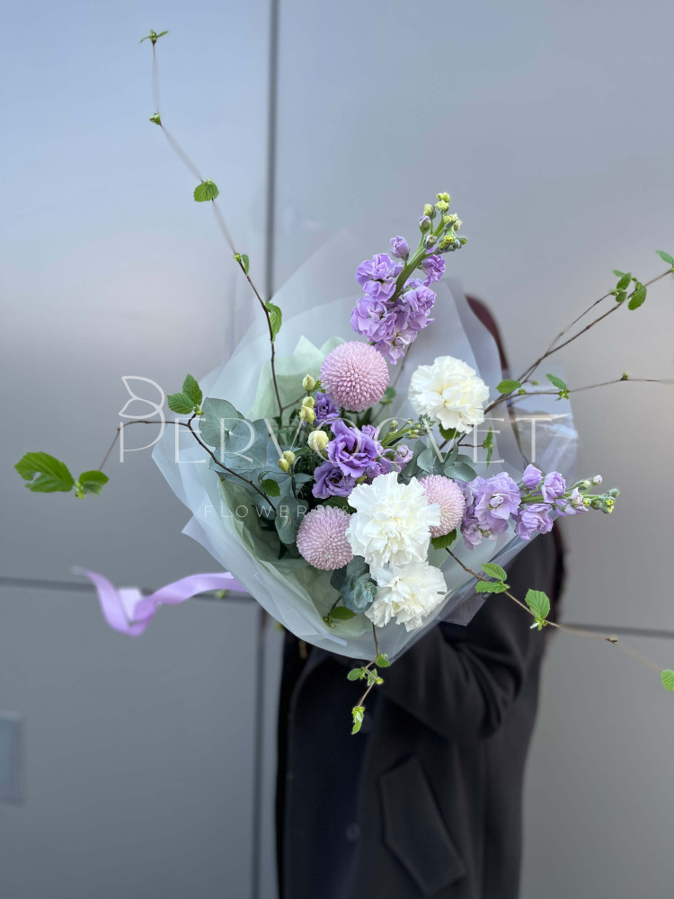 Сиреневый сад, с ароматом весны! Фиолетовая маттиола и белый диантус дарят аромат, хризантемы Момоко - передают фактуру, а разная зелень создают идеальную композицию в её вазе.