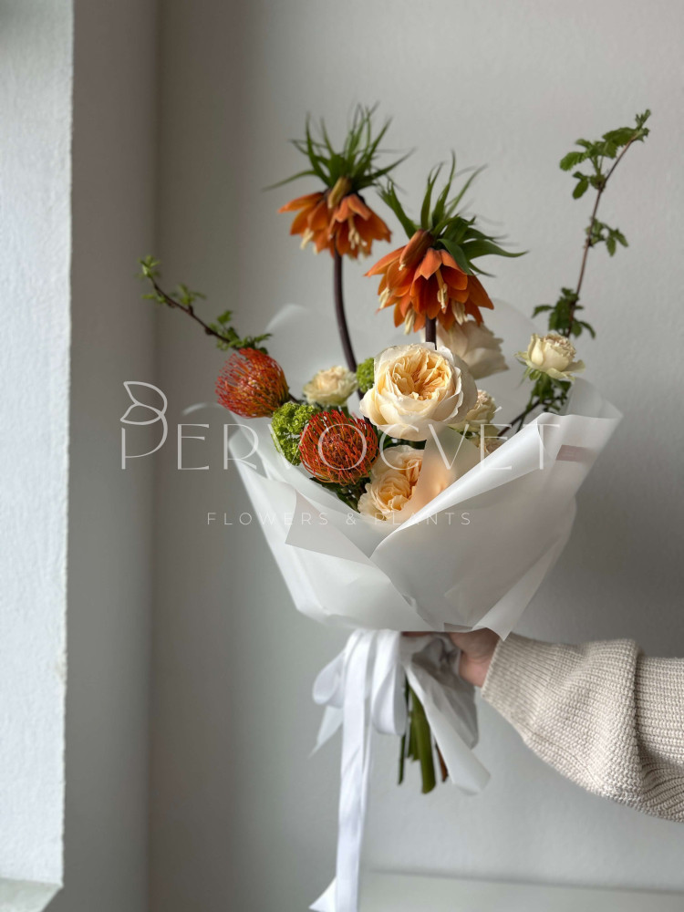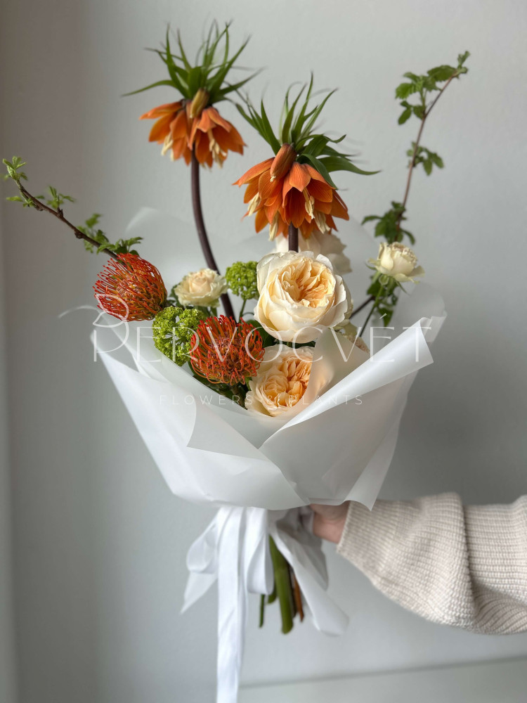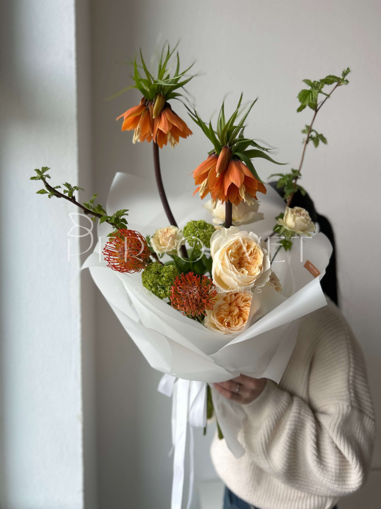 Лилейные фриттилярии и садовые розы - такой родной и такой экзотический сад! Идеальный букет для той кто не терпит классики. Этот ей точно понравится! Только уникальные сорта и оттенки спокойной весны.