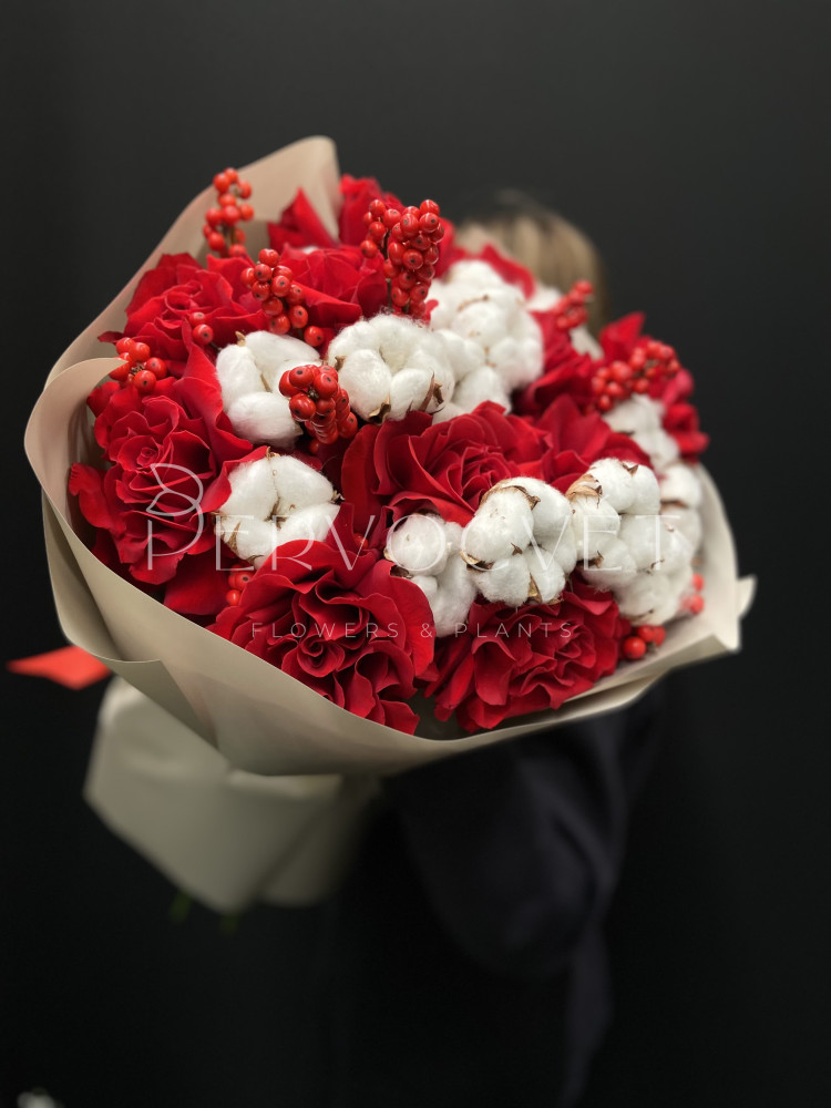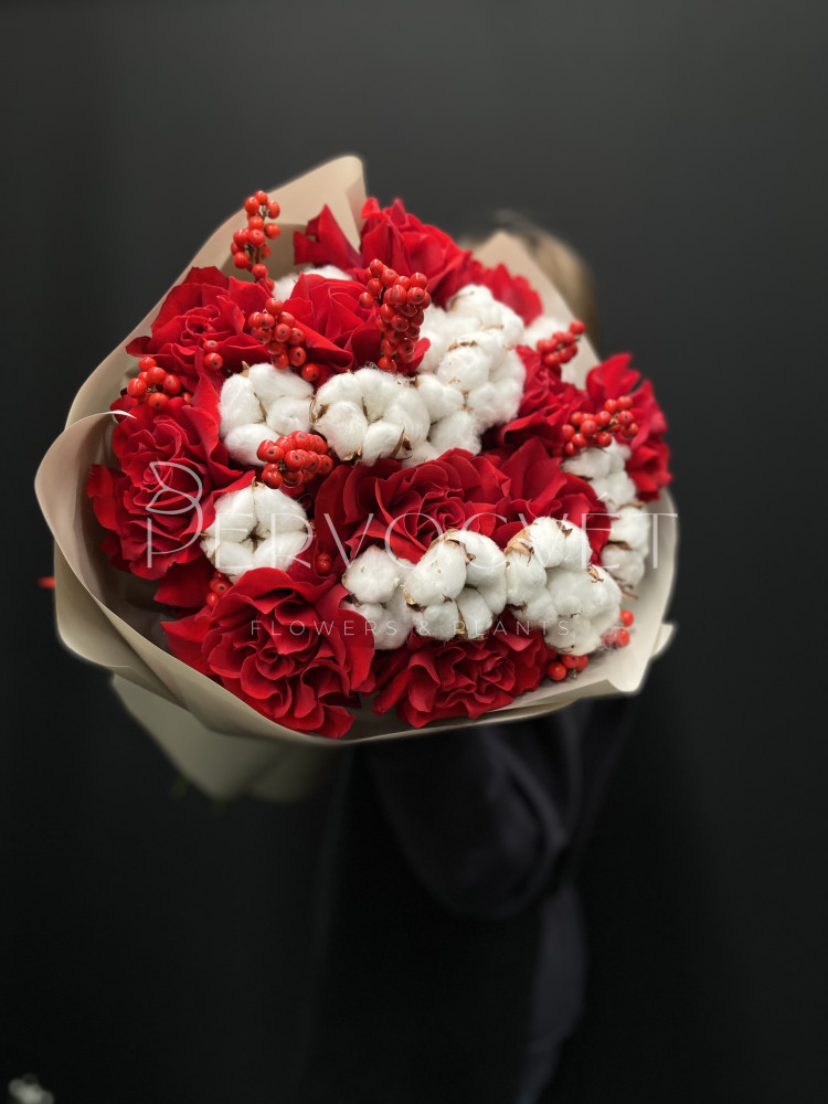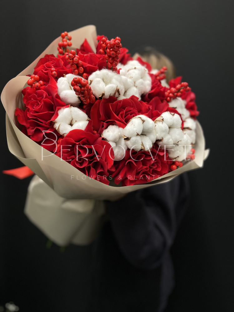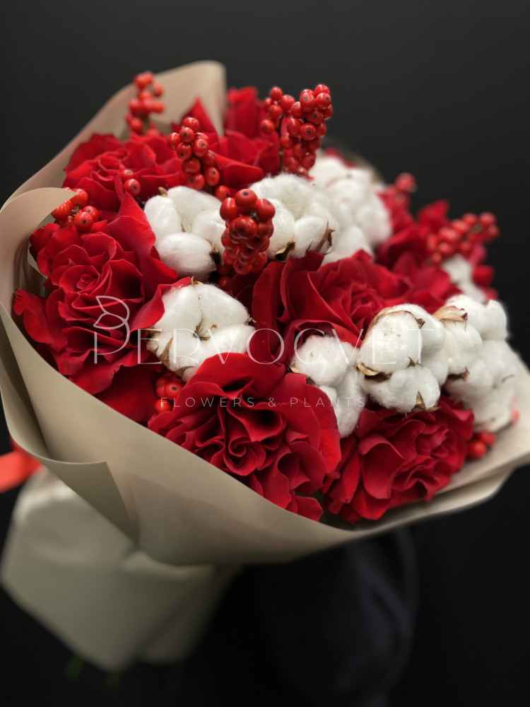 Яркий сочный букет из алых французских роз, коробочек хлопка и ягод красного илекса. Яркость в зимние дни!
