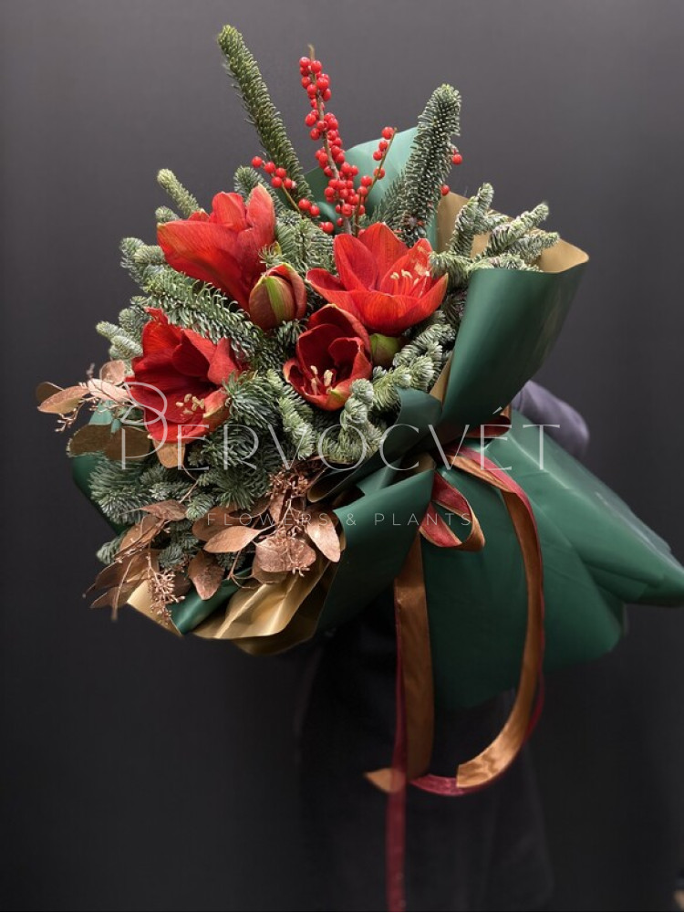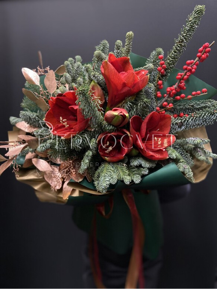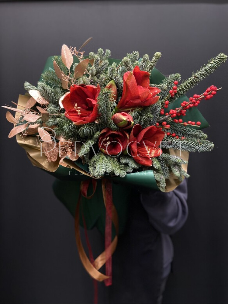 Красочный зимний букет с пихтой Нобилис, красным Амариллисом, яркими ягодами красного Иллекса и золотым эвкалиптом (или скиммией). Интересный и стойкий букет, который точно удивит!