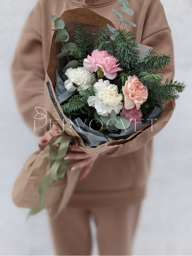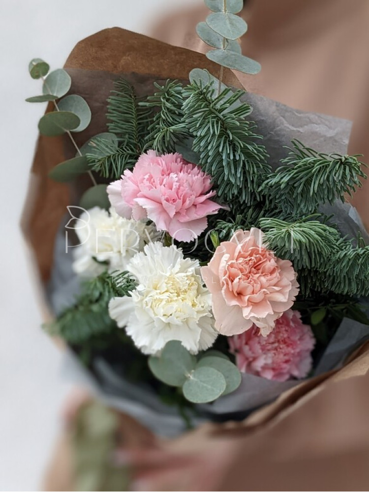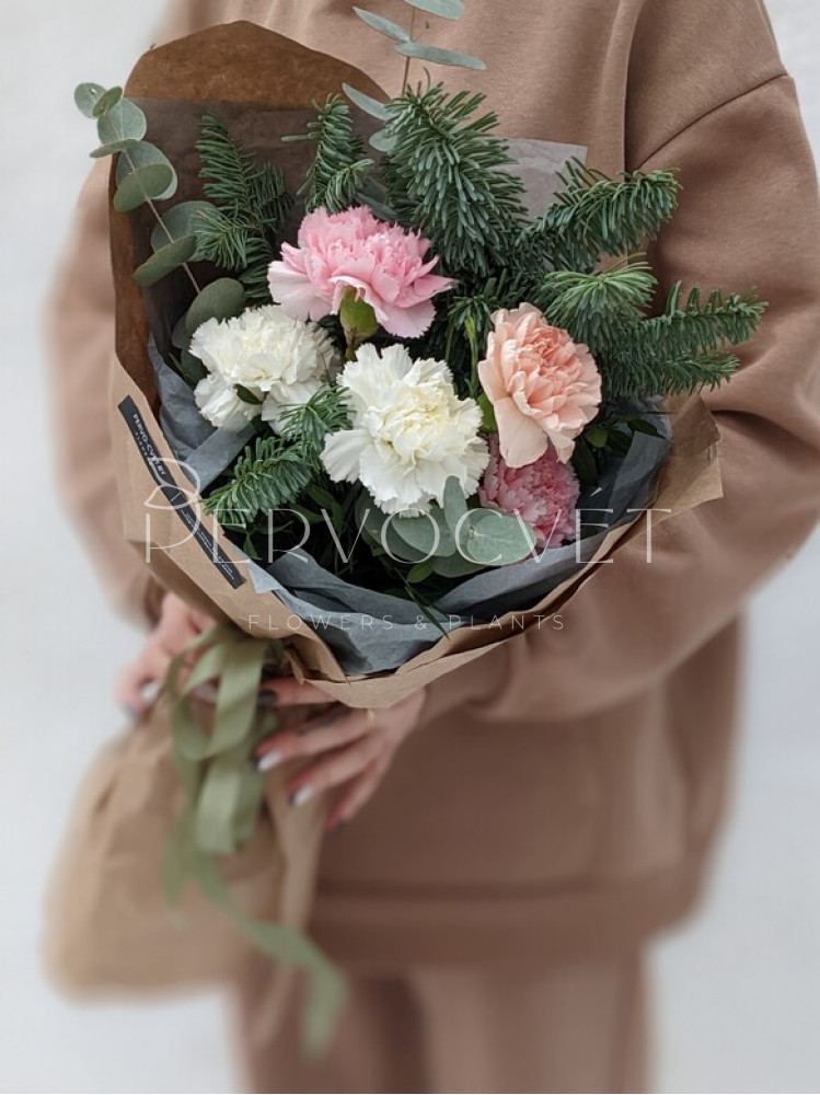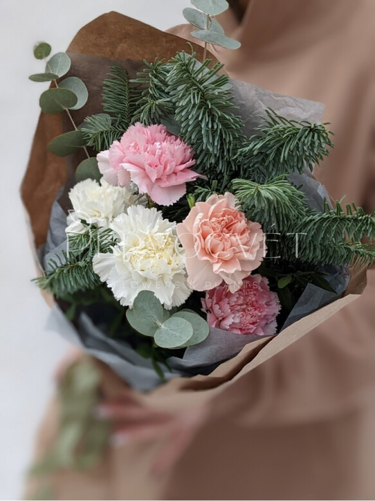 Зимний букет из самых стойких диантусов разных оттенков, натуральной пихты Нобилис и эвкалипта. Идеальное сочетание для стойкого зимнего букета!