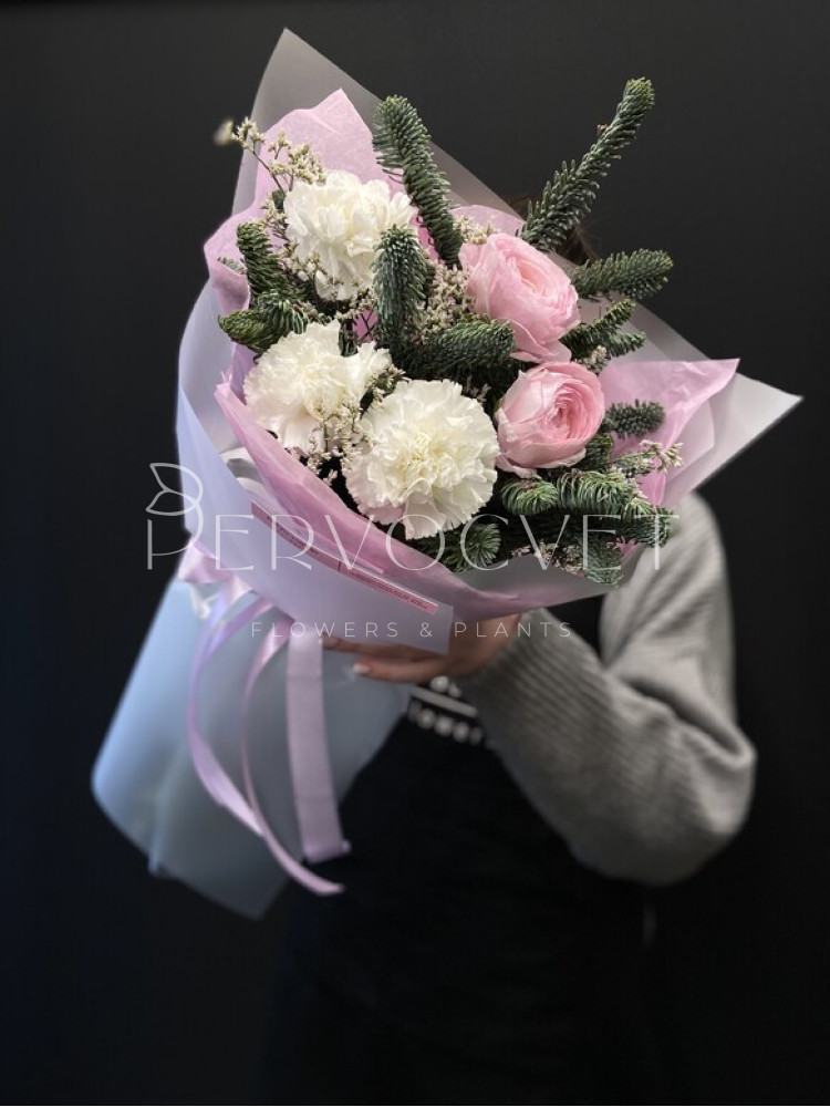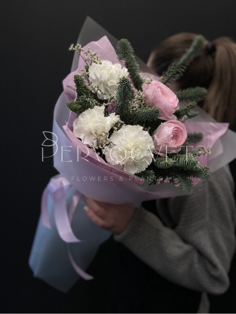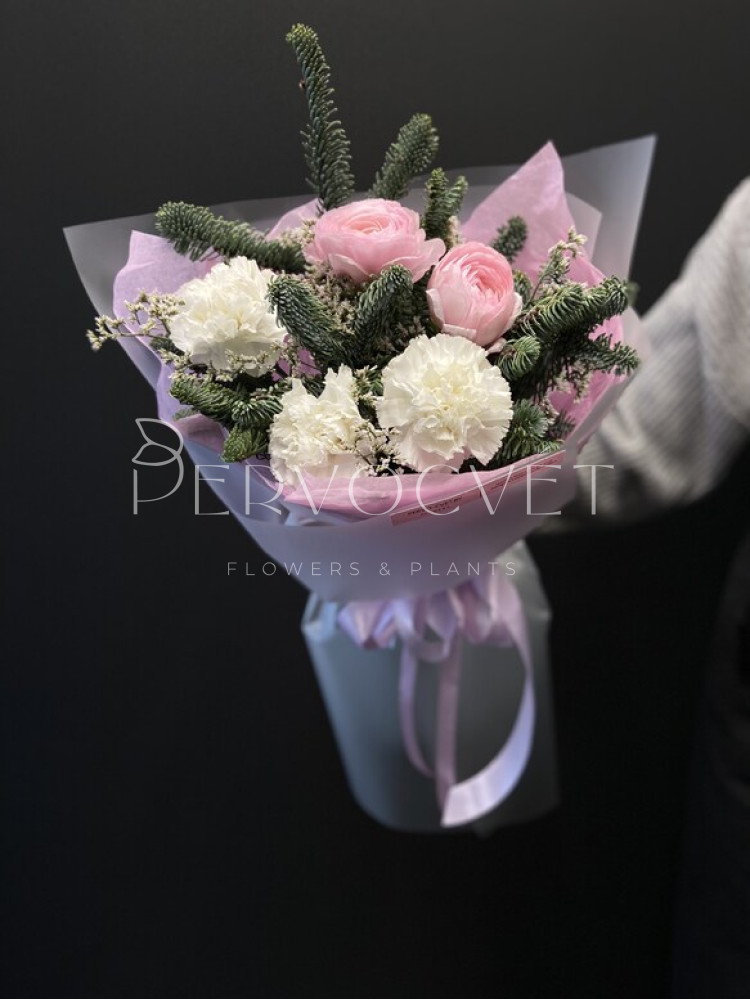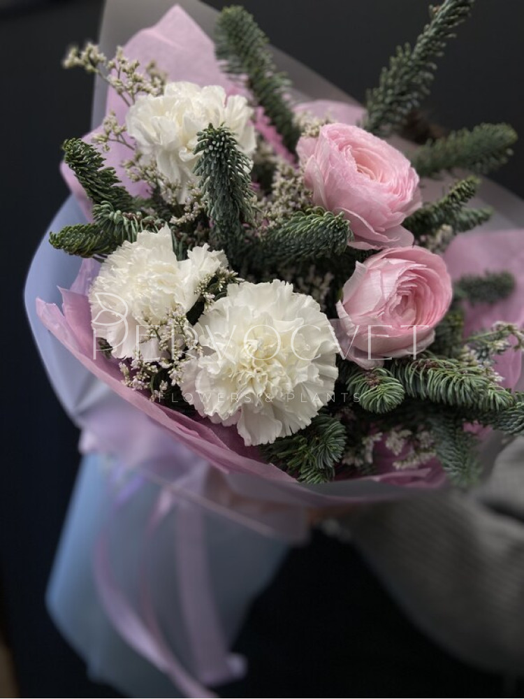 Новогодний нежный букет с пихтой Нобилис и розовыми ранункулюсами! Сезонное сочетание пушистой хвои и нежных лютиков, в дополнении с диантусами и лимониумом. Нежная и трогательная зима!