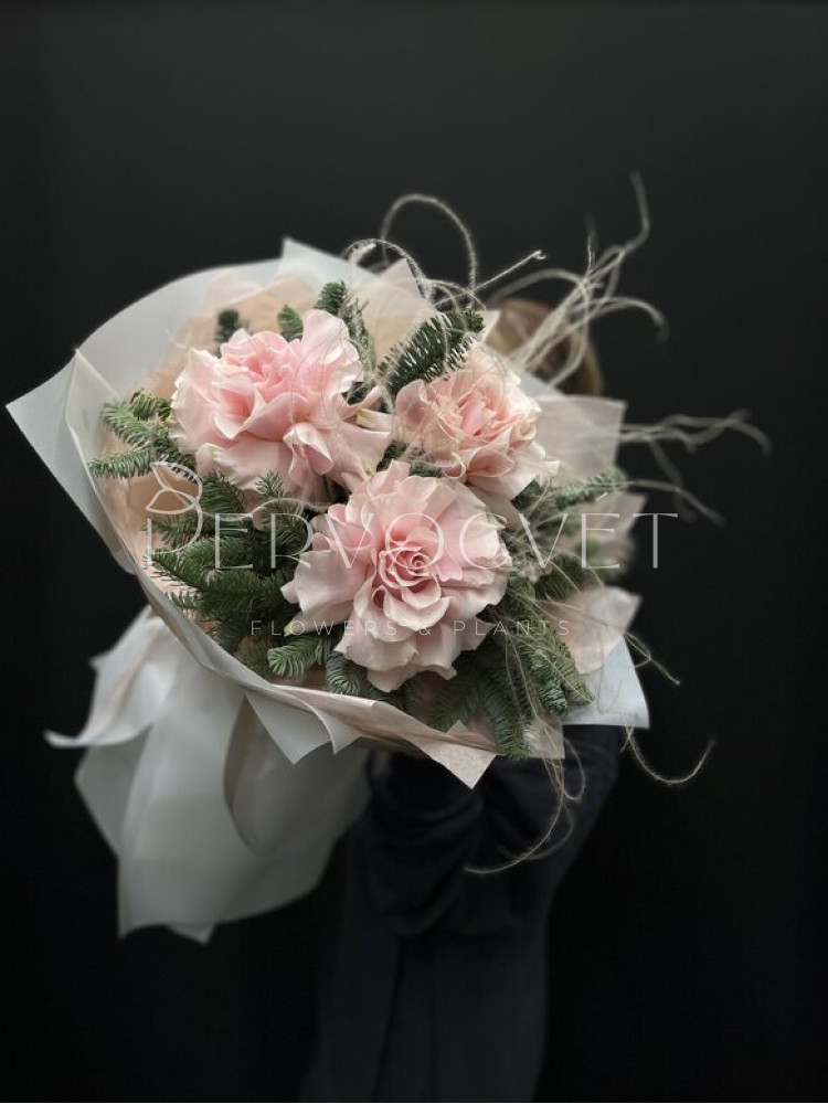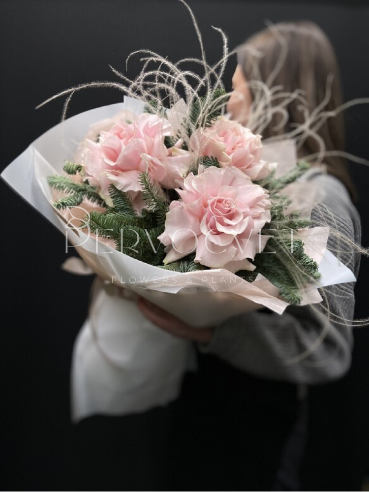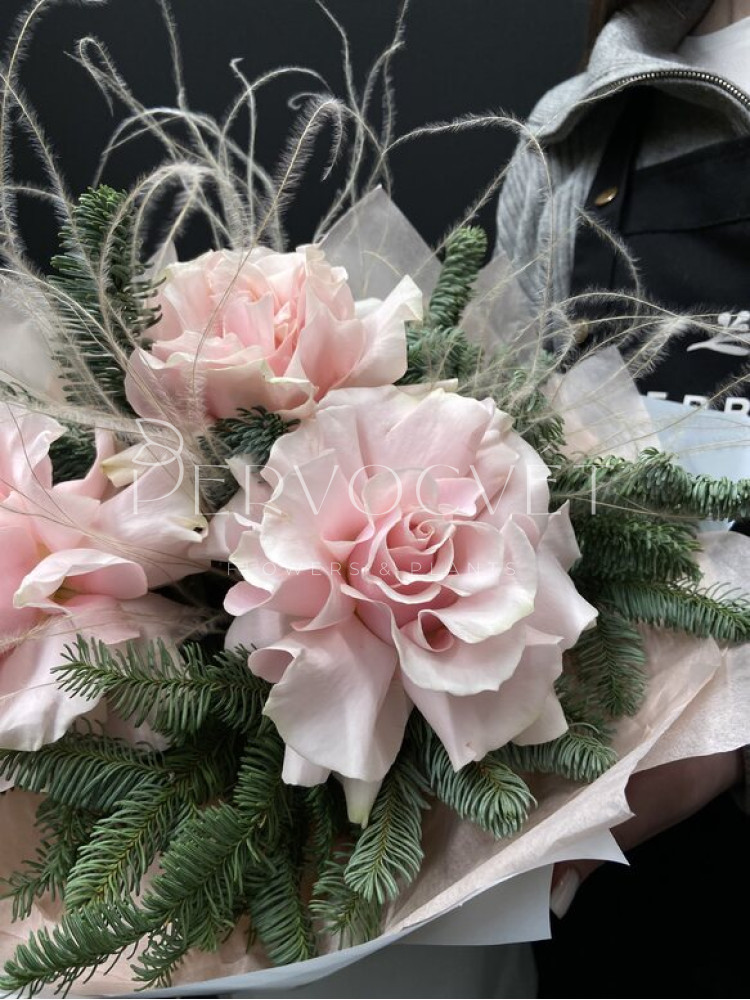 Зимний букет из пушистых веток пихты Нобилис с французской розой сорта Мондиаль и пушистой стипой. Нежное сочетание цветов и хвои. Аромат хвои и розы!