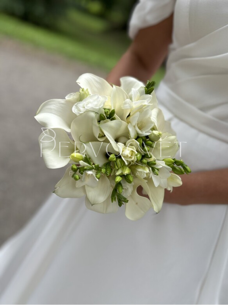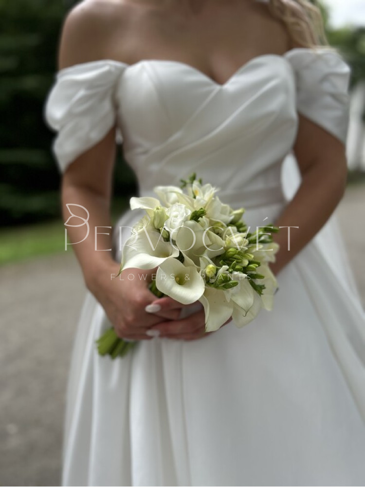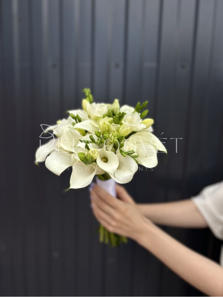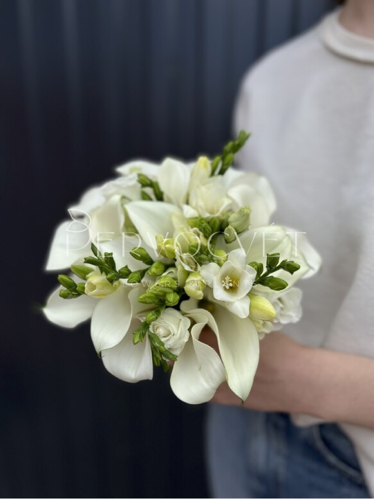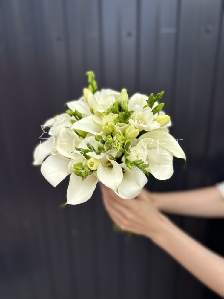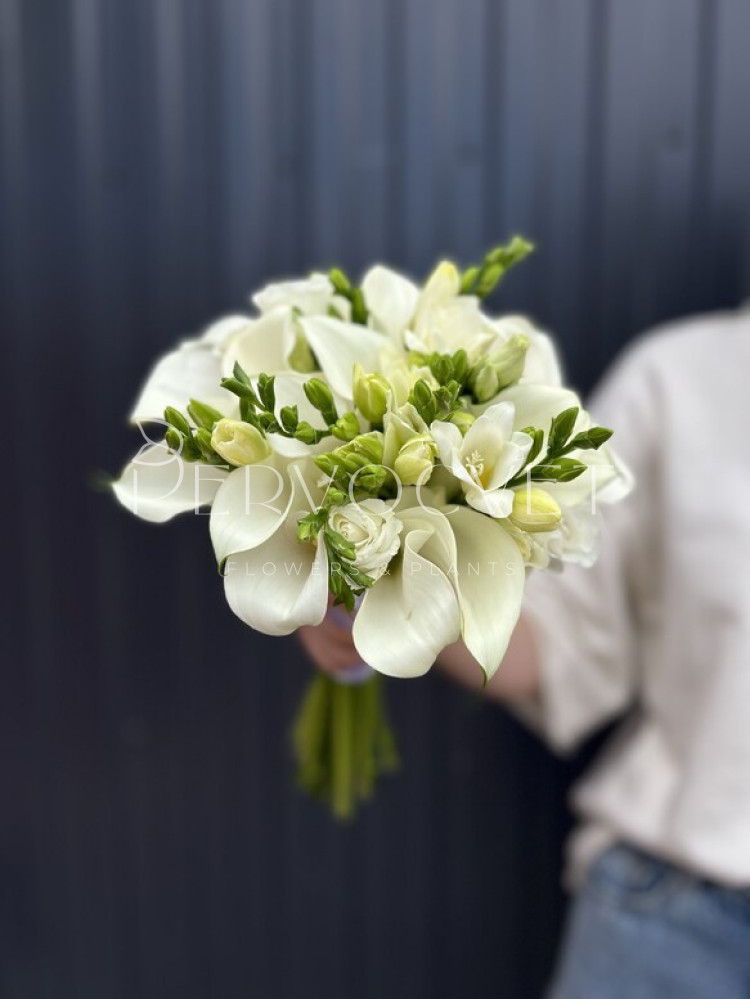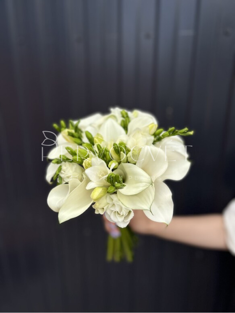 Элегантный букет из калл и фрезий, в дополнении с белой эустомой - стойкий и ароматный аксессуар. Букет доступен к заказу в любое время года и подходит для свадьбы любого сезона!