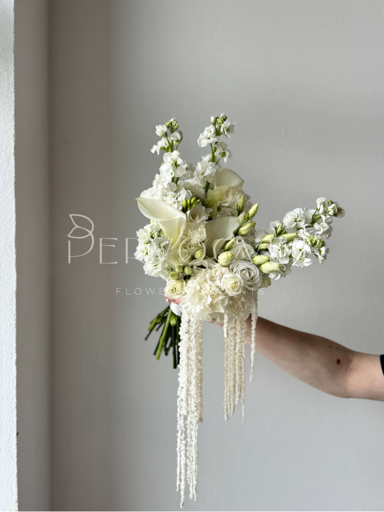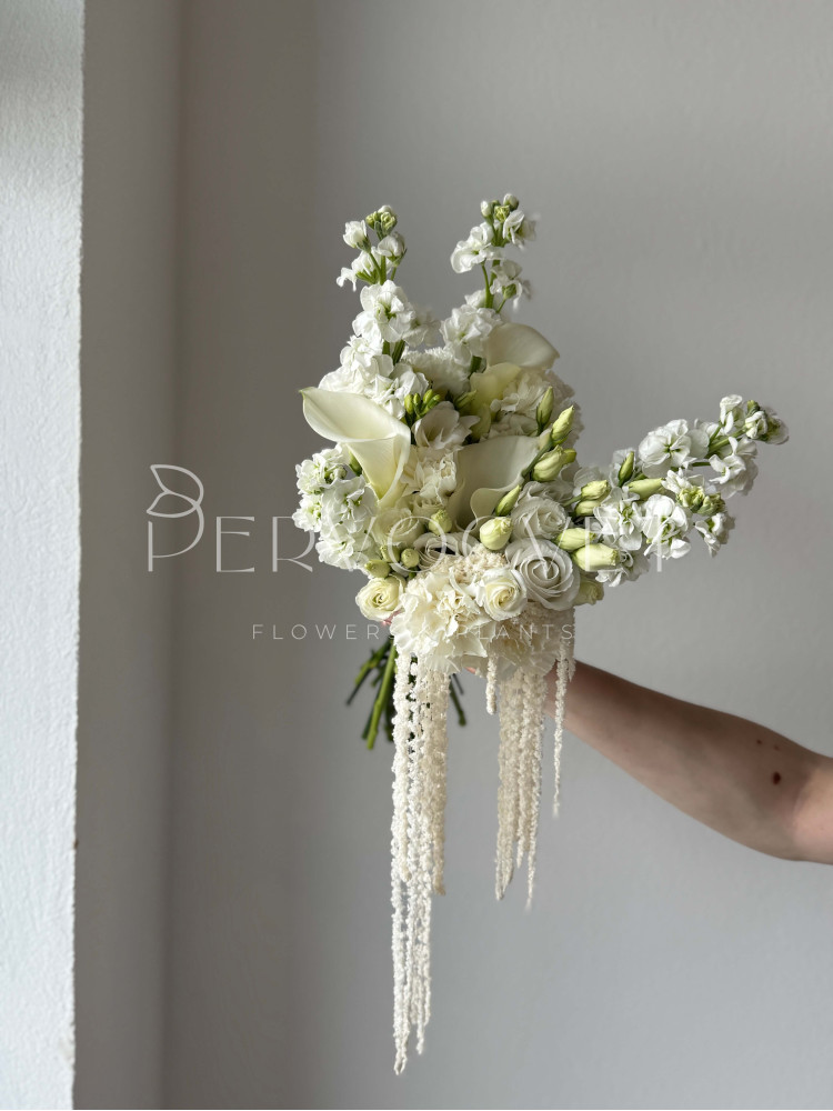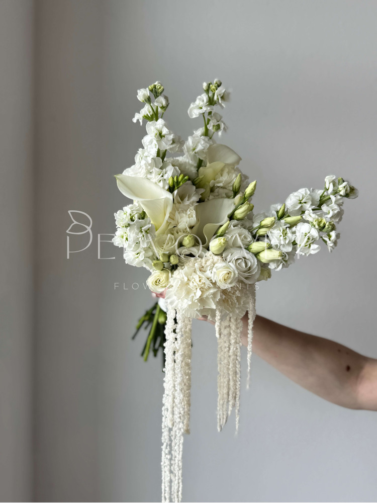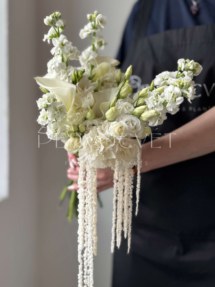 Уникальная форма букета, белые благородные цветы и нежнейшие элегантные Каллы. Совершенный букет, одновременно классический, современный и подойдет практически для любой свадьбы. Красивые восходящие каллы и ароматная маттиола, и ниспадающий амарант - будет очень красиво смотреться в руках невесты!