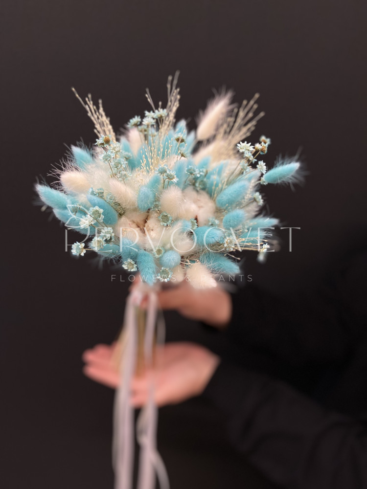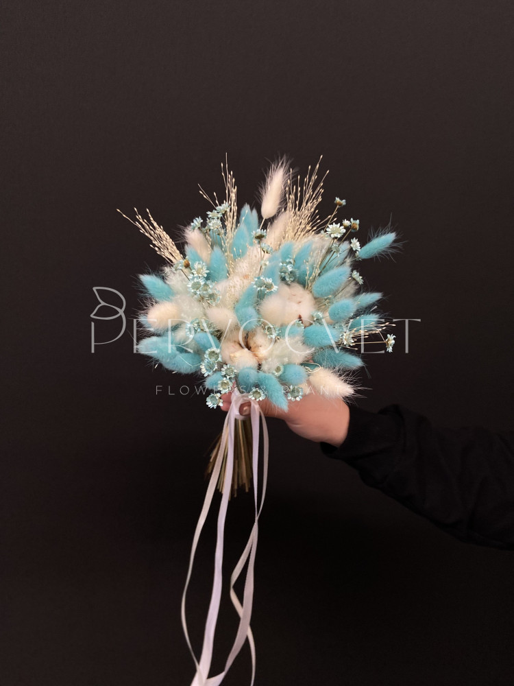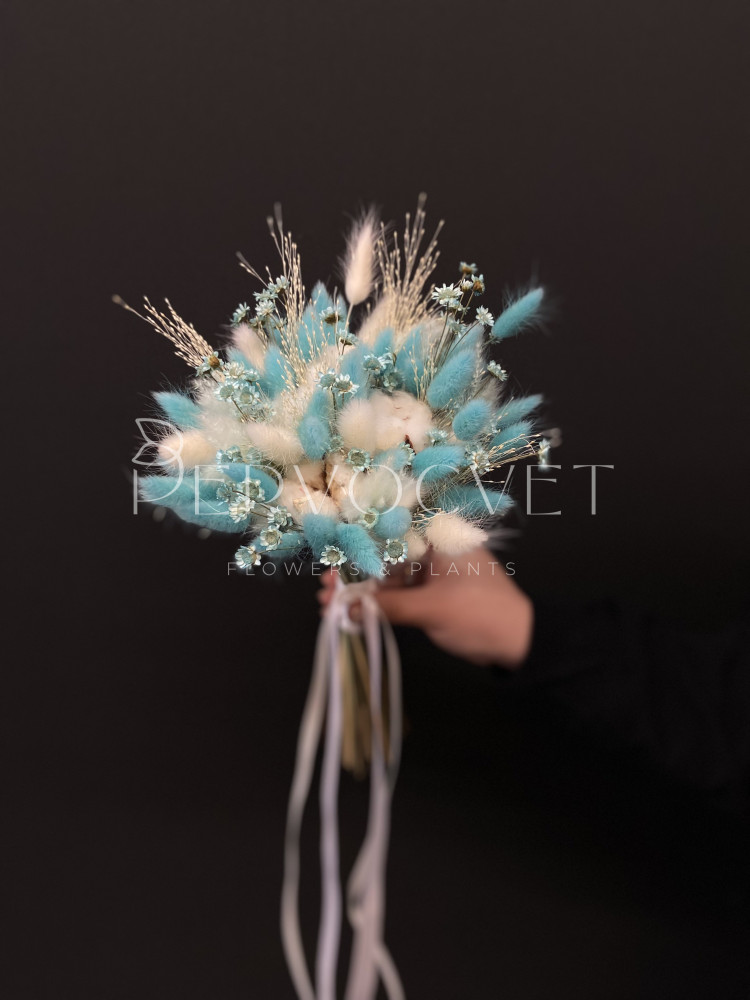 Букет натуральных злаков для уникальной свадьбы: натуральный хлопок, цветки местной гликсии, сухоцветные злаки пушистого лагуруса двух оттенков - в бело-голубых редких оттенках. Для красивой экологичной свадьбы в любое время года!