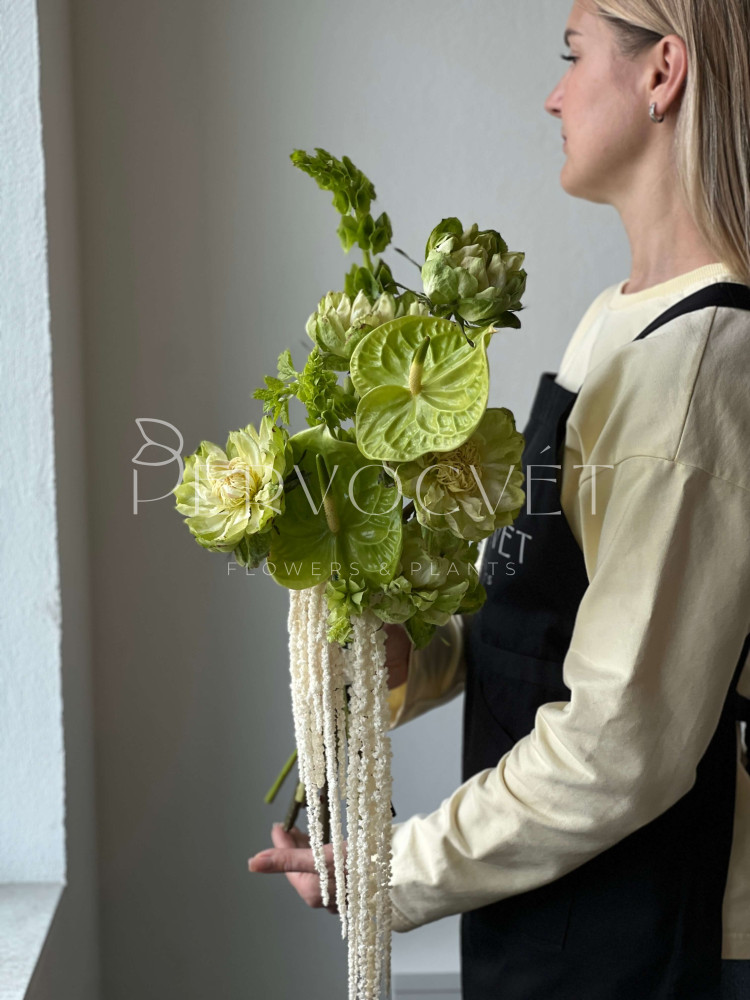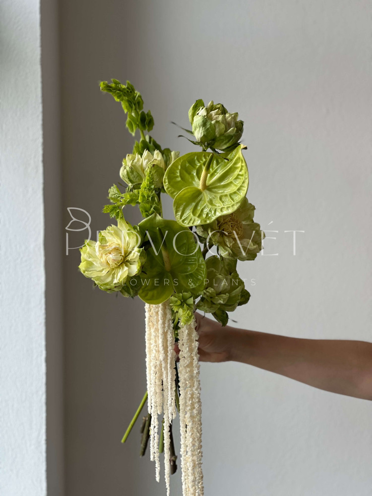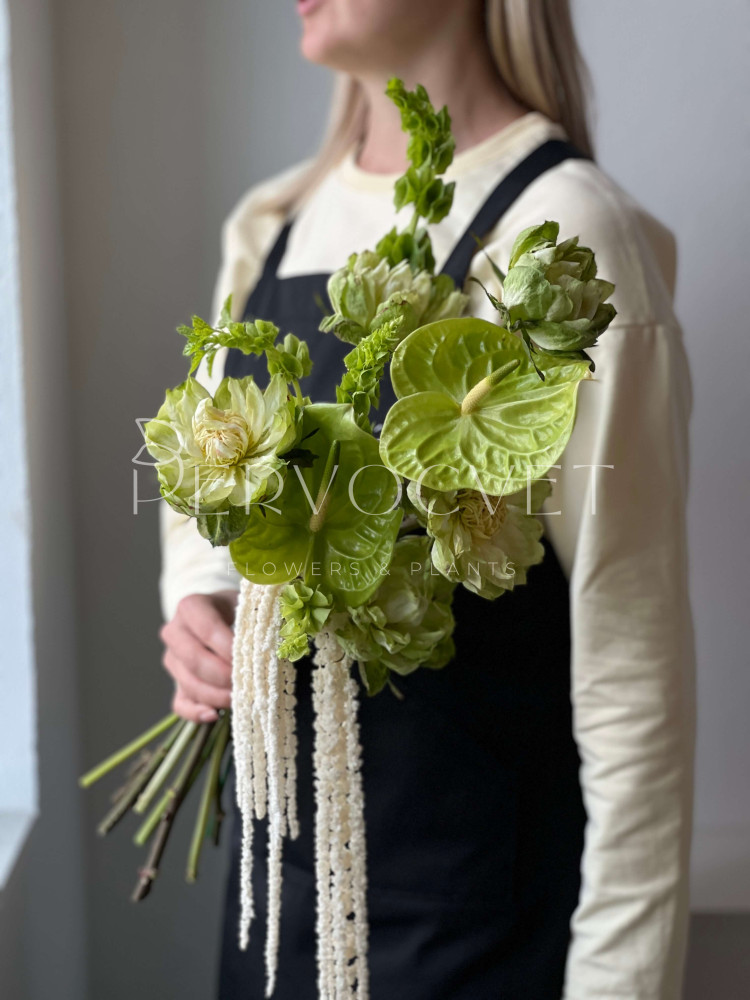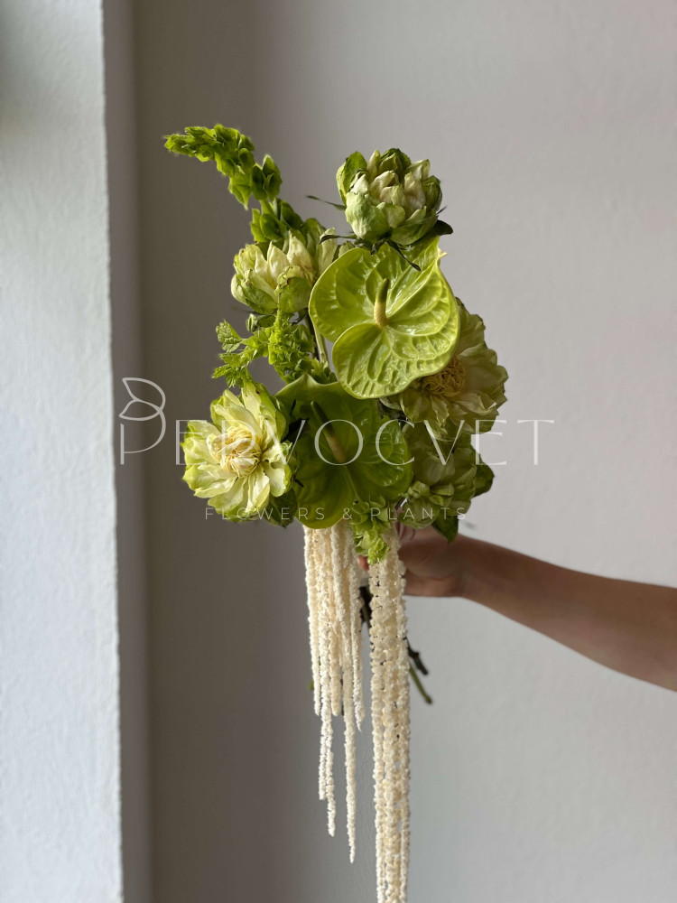 Трендовый букет невесты: зеленые оттенки, редкая роза и акцентная зелень. Ароматная зелень молюцеллы, зеленая роза Вегги, стойкий антуриум и акцентный амарант. Образ невесты может быть как минималистичным, так и полон аксессуаров. Не классическая форма и уникальность - это идеально для такого важного дня !