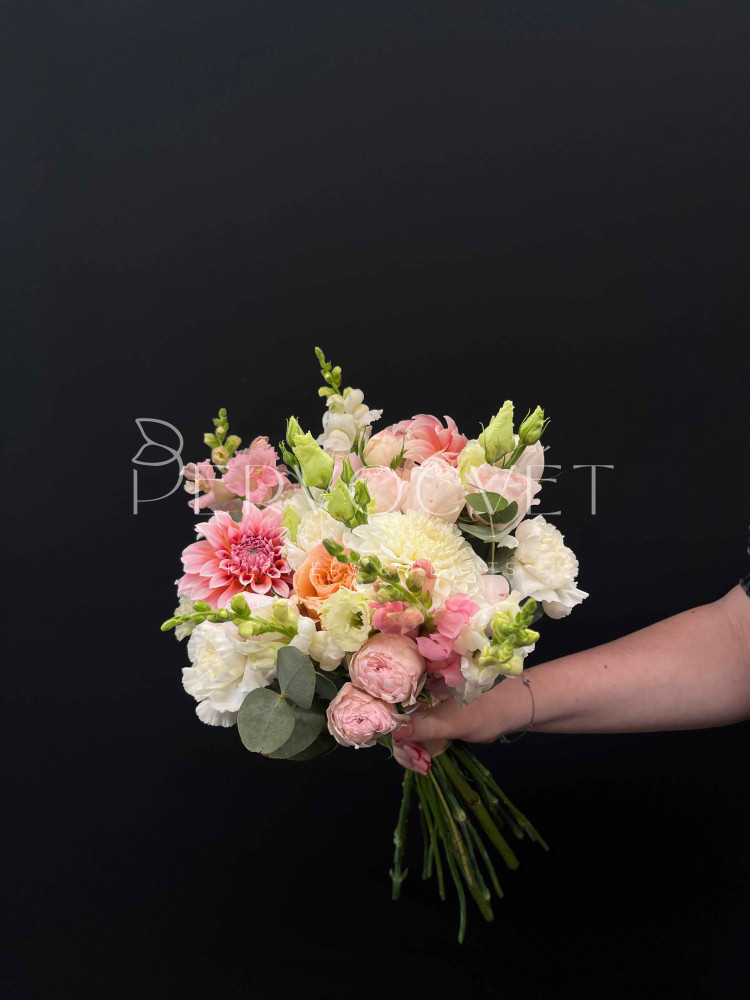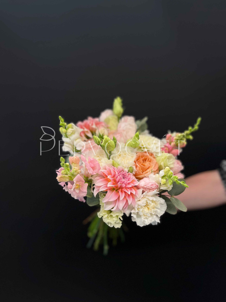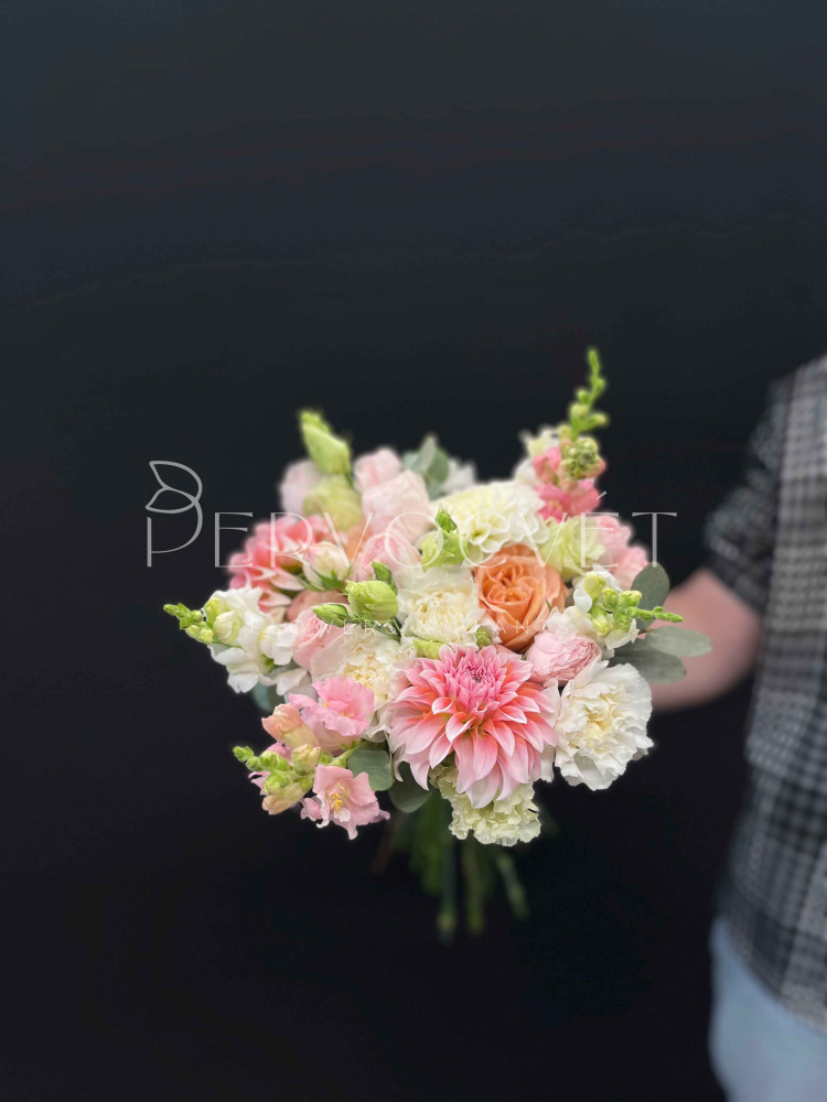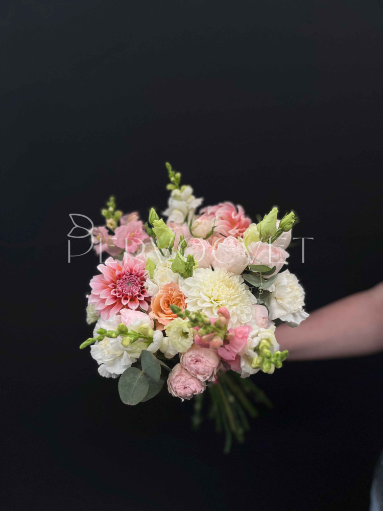 Идеальный летний сад в букете! Для легкой и веселой свадебной церемонии с акцентом на сезон - идеальные георгины и садовые пионовидные сорта роз, классическая эустома и диантусы, и акценты из разноцветных антирринумов. Круглый букет из сезонных летних ароматных цветов, стойких видов с классической зеленью эвкалипта.
