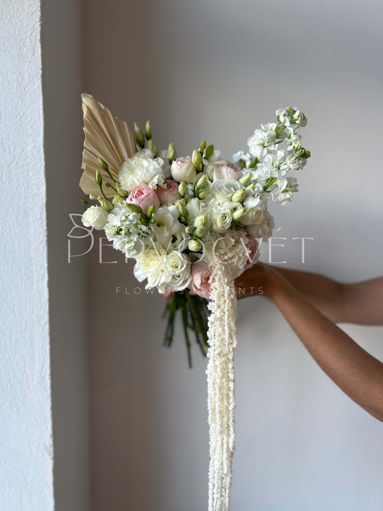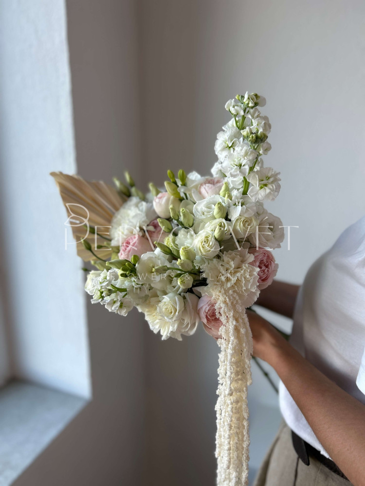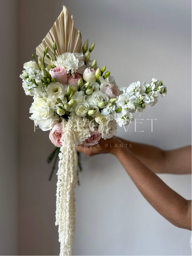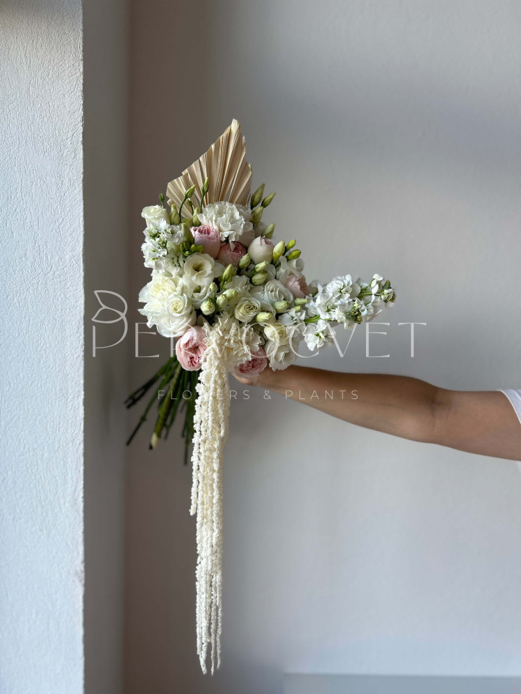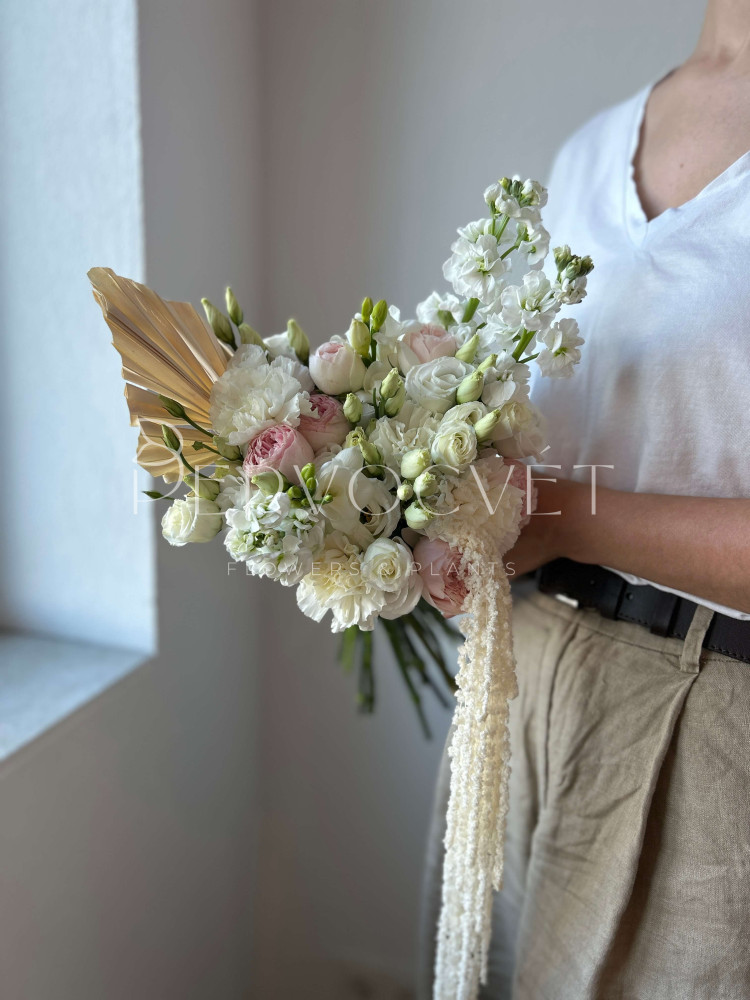 состав: пионовидная кустовая роза, эустома, фрезия, маттиола, диантус, амарант (сухоцвет), пальмовый лист (сухоцвет)