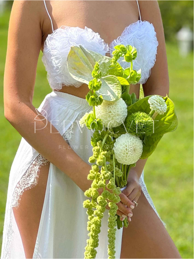 Стильный и современный букет для СВАДЬБЫ-2024! Сочетание белых и зеленых оттенков, свободная форма и только акцентные цветы - антуриум, георгин, диантус Грин Трик и ниспадающий амарант. Красивая форма, которая подчеркнет любое платье, настоящее украшение в руках невесты!