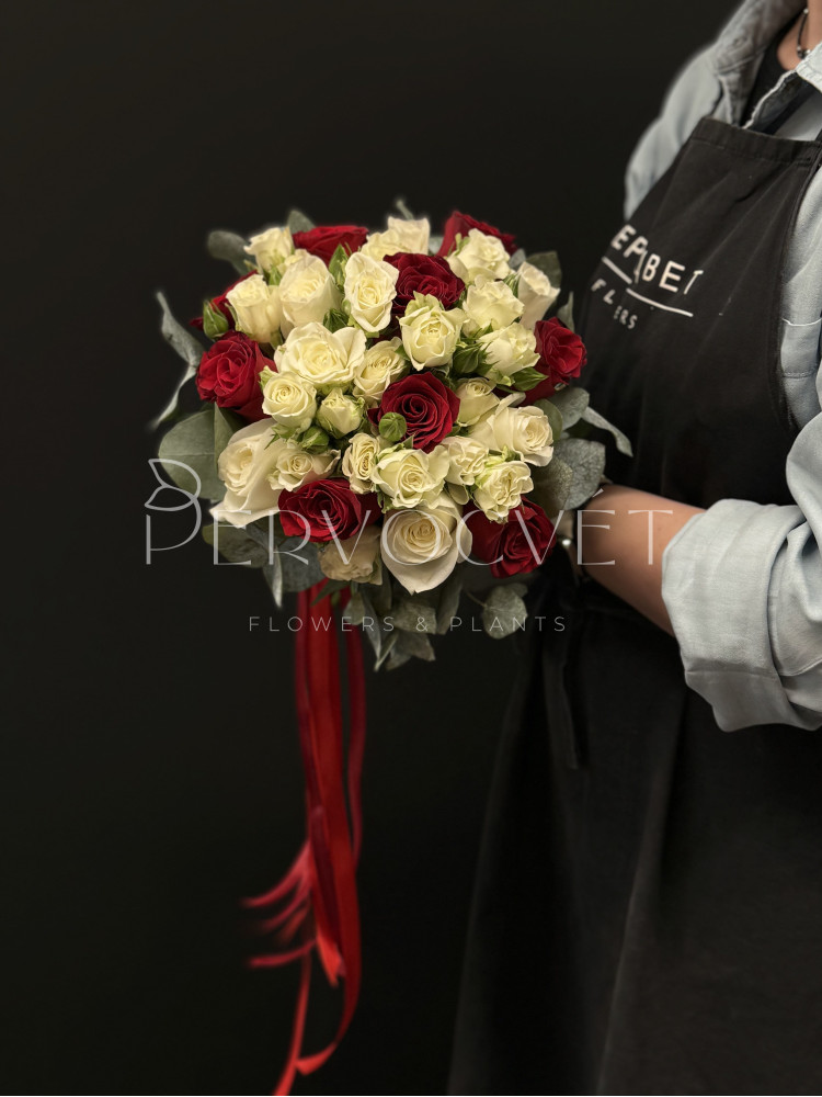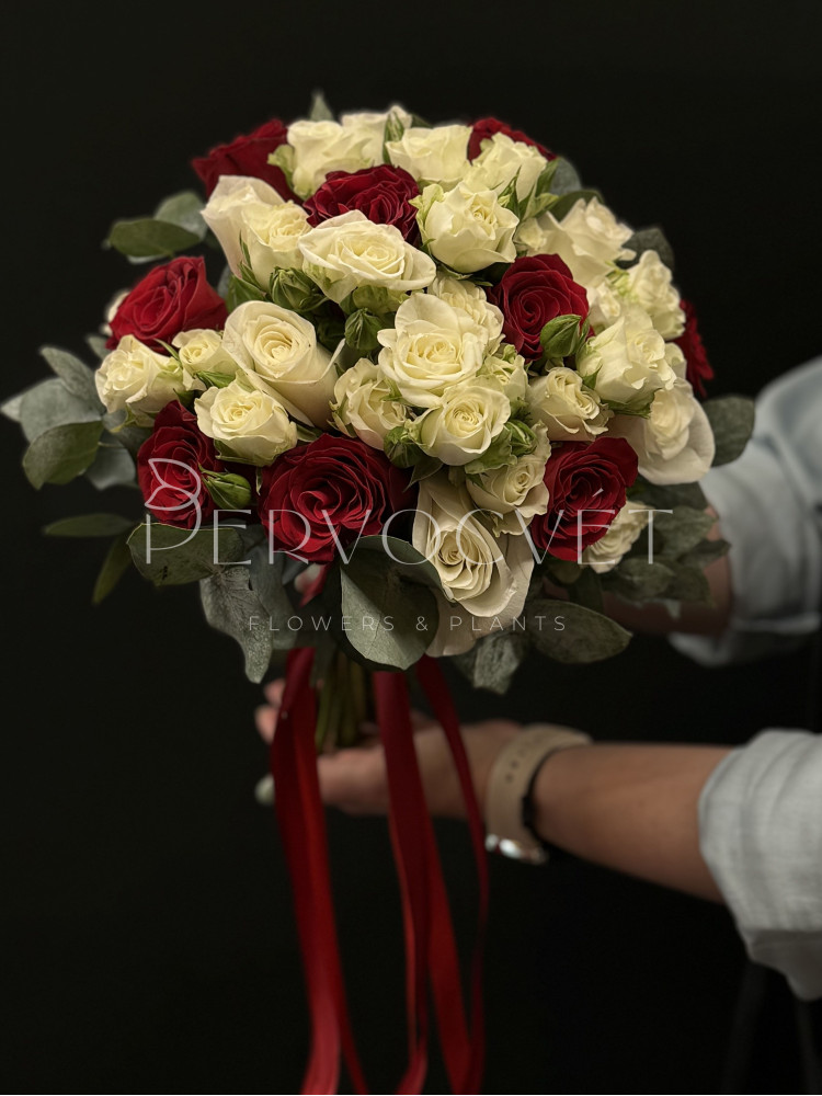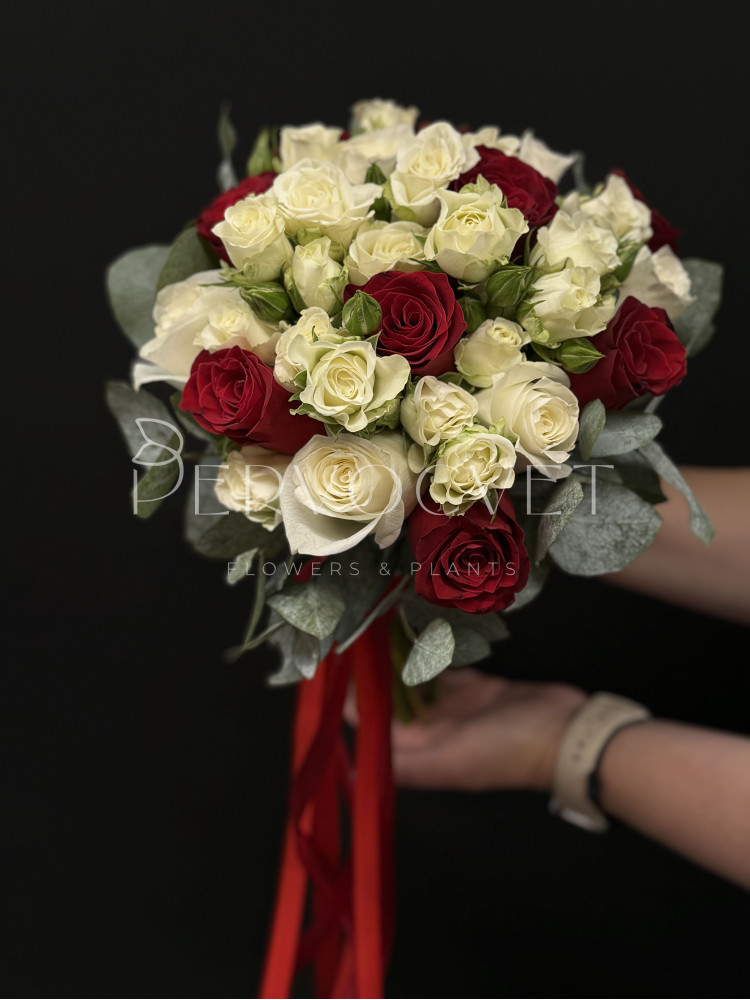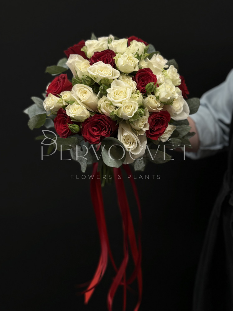 Красивая классика - полусфера из роз с зеленью эвкалипта. А с длинными лентами, букет не только красивое украшение в руках невесты, но и подчеркнет изгибы платья. Идеальный выбор для невесты, которая хочет букет из своих любимых роз и красных оттенков в своем образе!