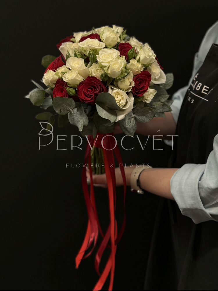 состав: роза Эквадор, роза кустовая, эвкалипт