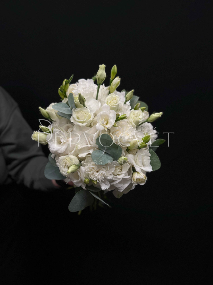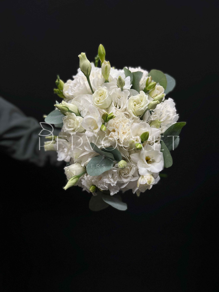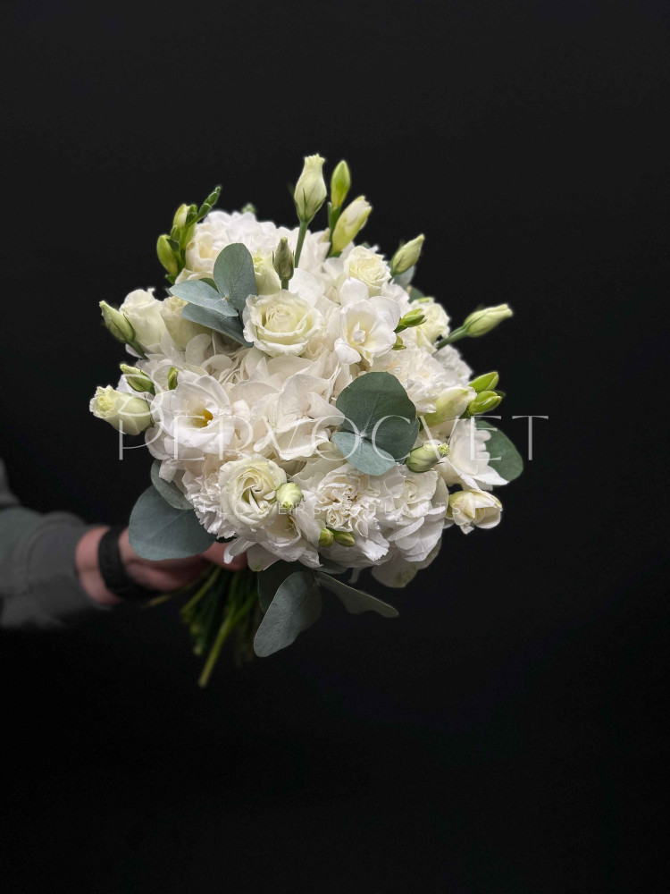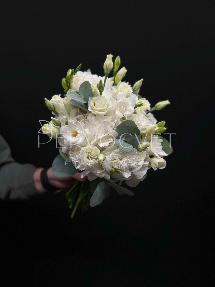 Идеально круглый с белой нежной гортензией, ароматной фрезией и белыми диантусами. Классика в белом цвете, максимально фактурный букет, усеянный цветами, который можно бесконечно рассматривать! Шикарный аксессуар и дополнение к образу невесты в важный день блеска ее красоты!