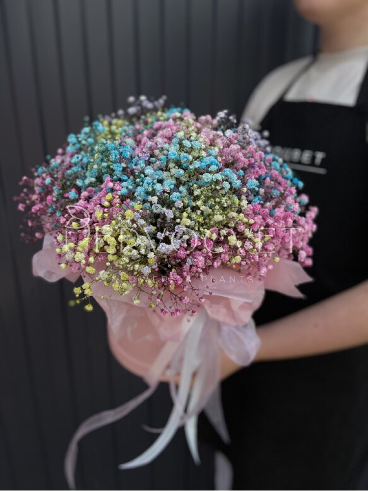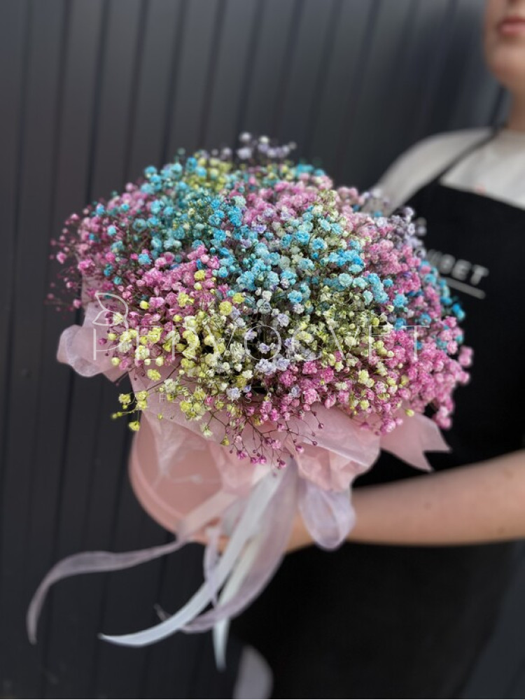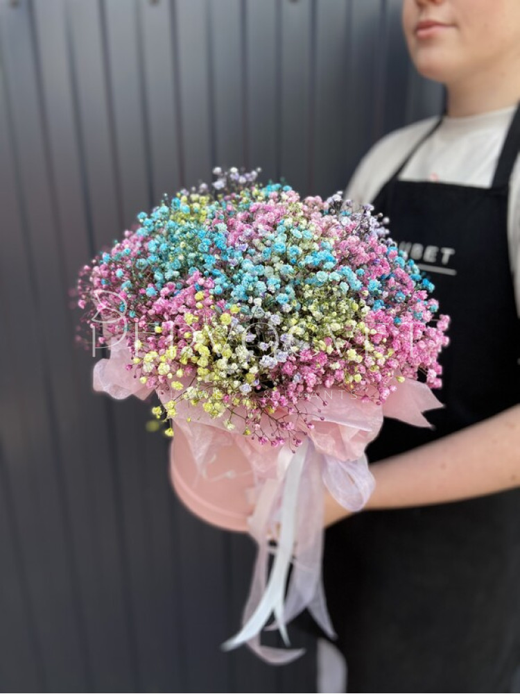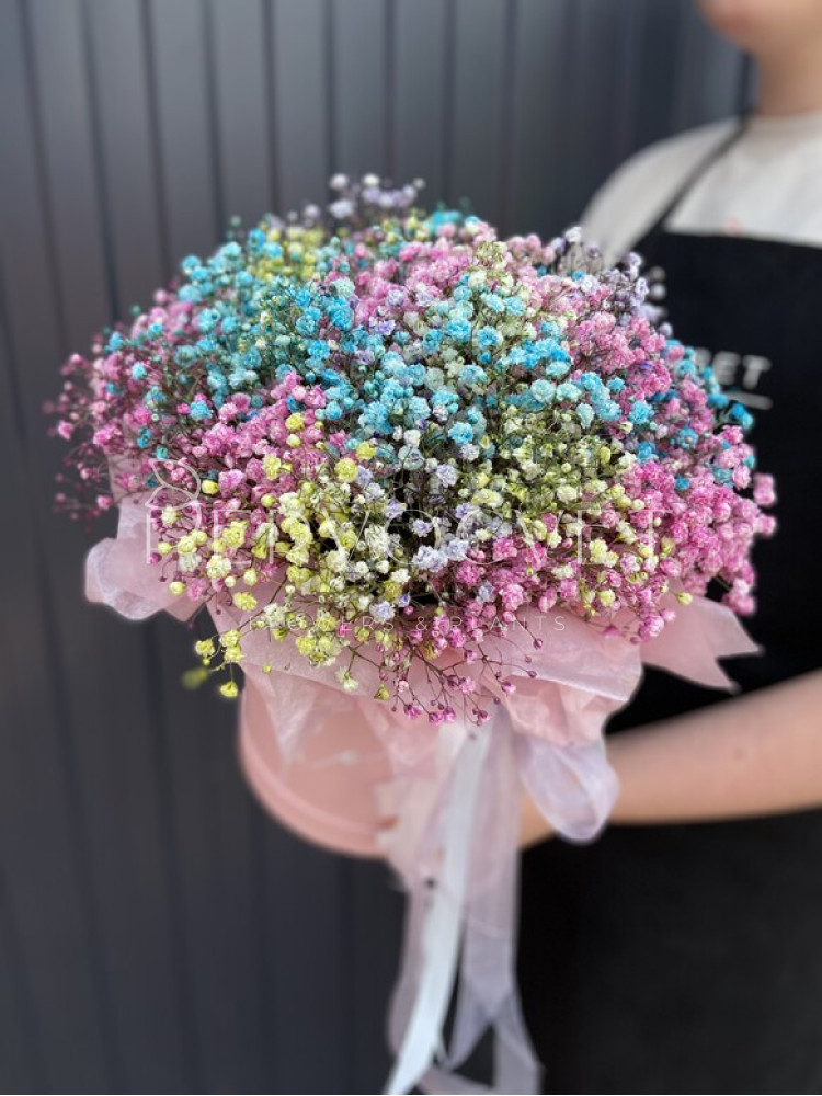 Микс гипсофилы в шляпной коробке: яркое сочетание нежных мелких пышных цветочков: голубой, зеленый, розовый, сиреневый, белый, желтый и другие оттенки!