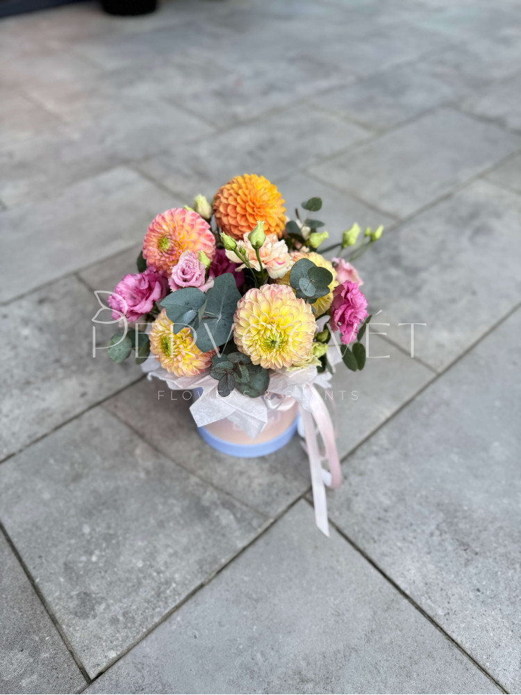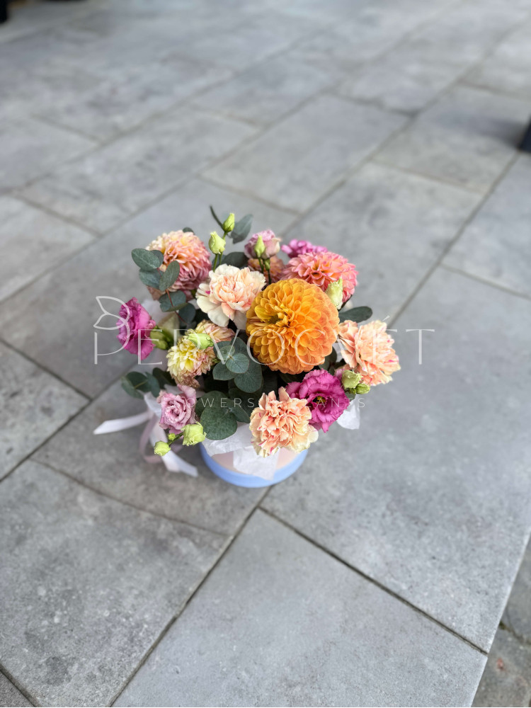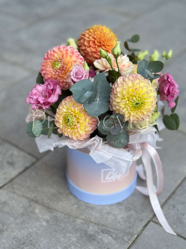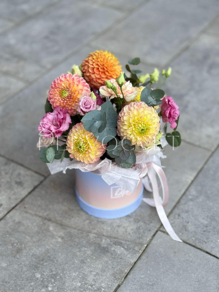Сезонное сочетание для настроения с оранжевым георгином и эустомой! Солнце, лето и вдохновение в коробке, и радость на целый день и каждое следующее утро.