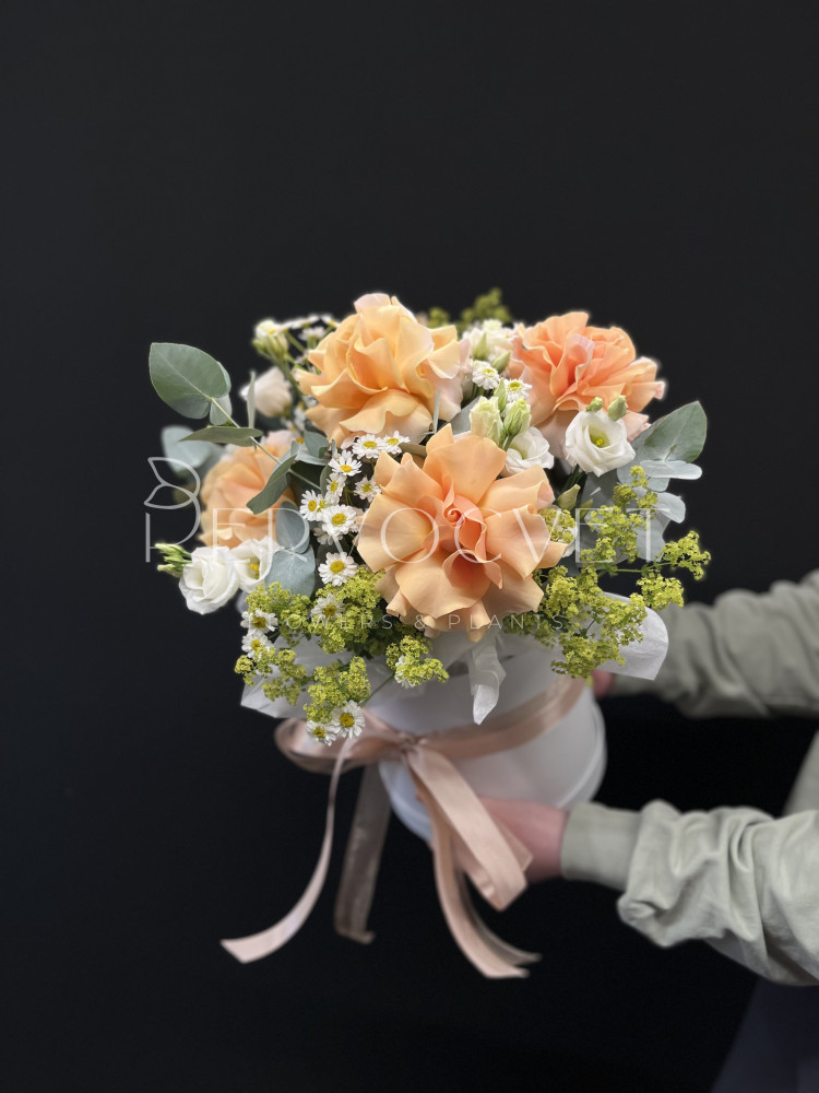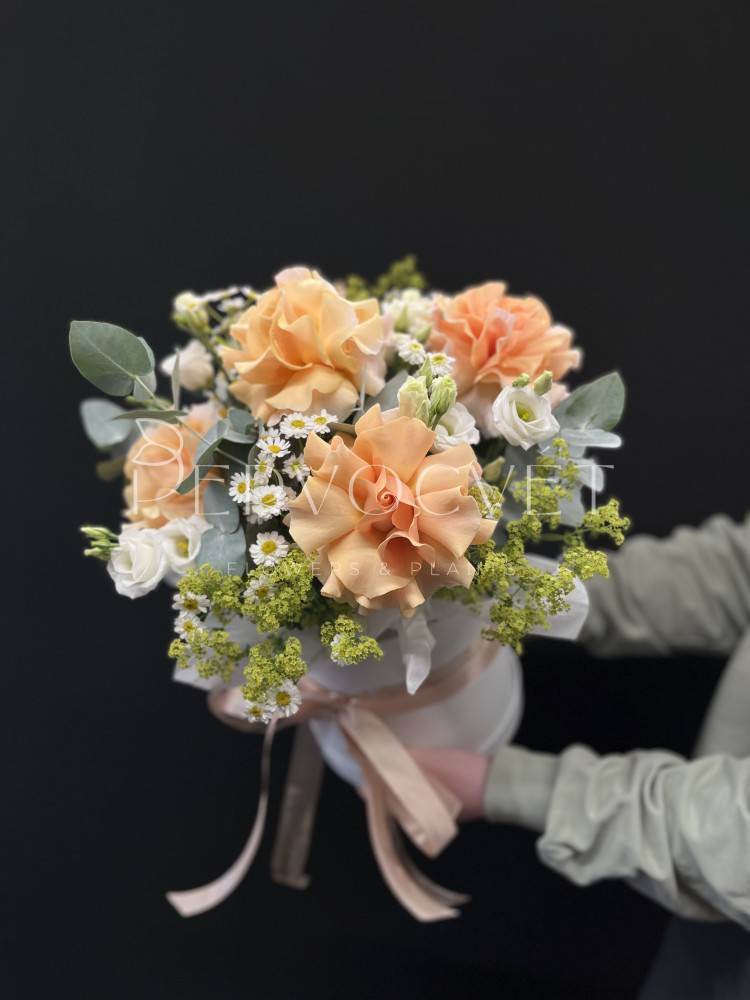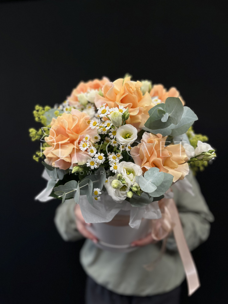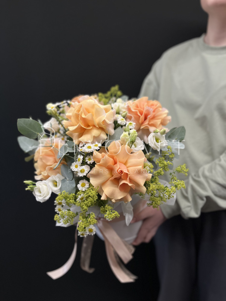 Нежная композиция из цветов трогательного лета: с ромашкой танацетума, белой эустомой и различной зеленью, где главная роль отведена - французской персиковой розе, которую наши флористы идеально формируют сами!