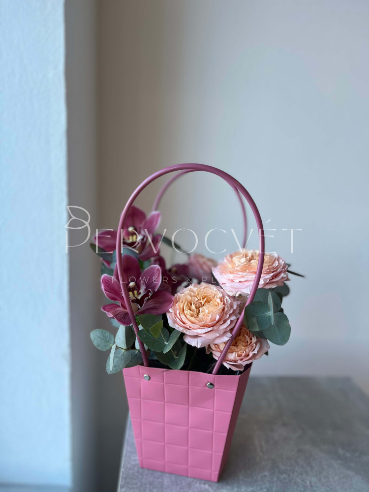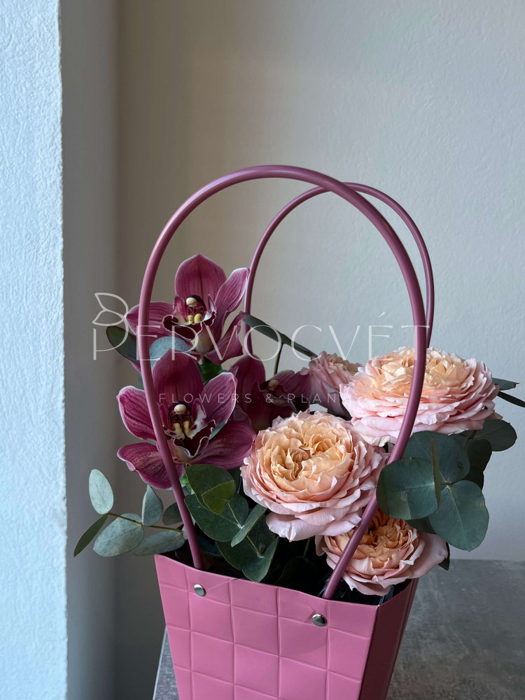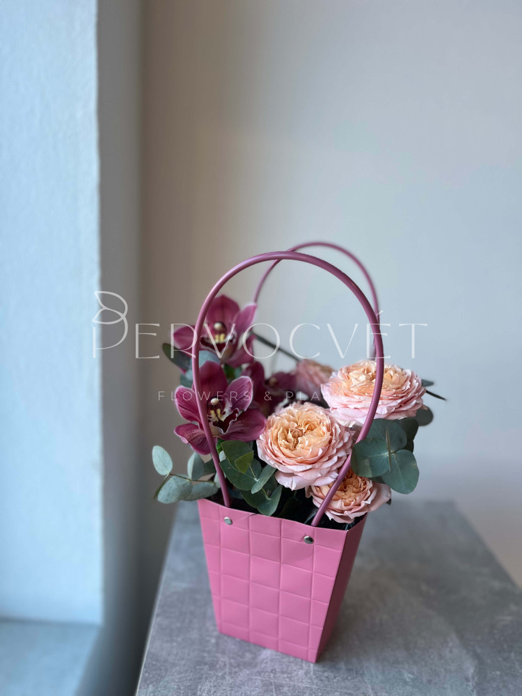 состав: кустовая пионовидная роза 1, орхидея Цимбидиум 3, эвкалипт
