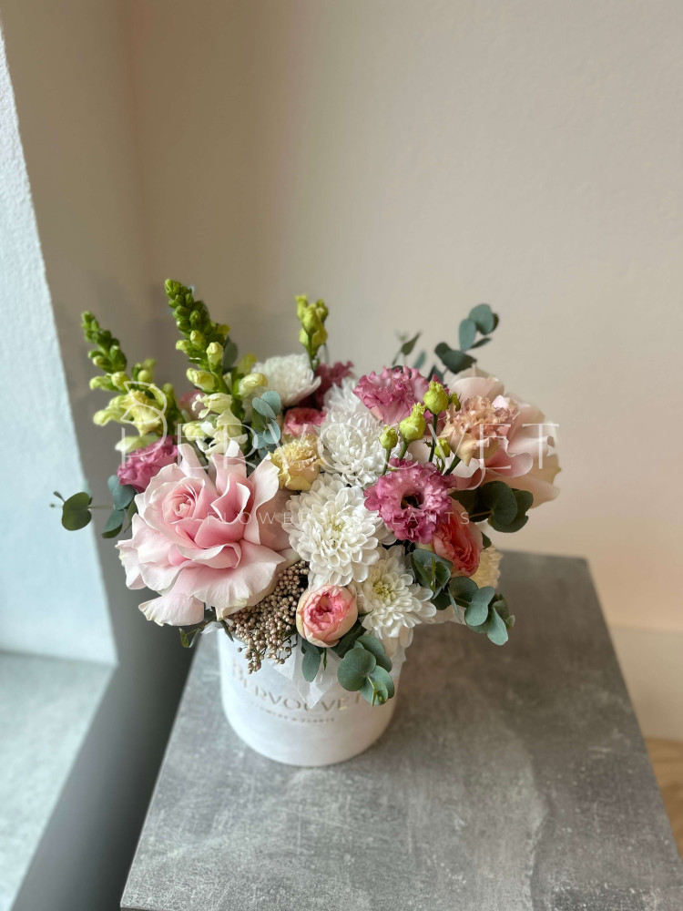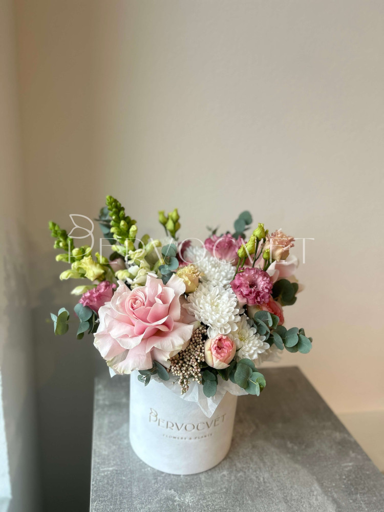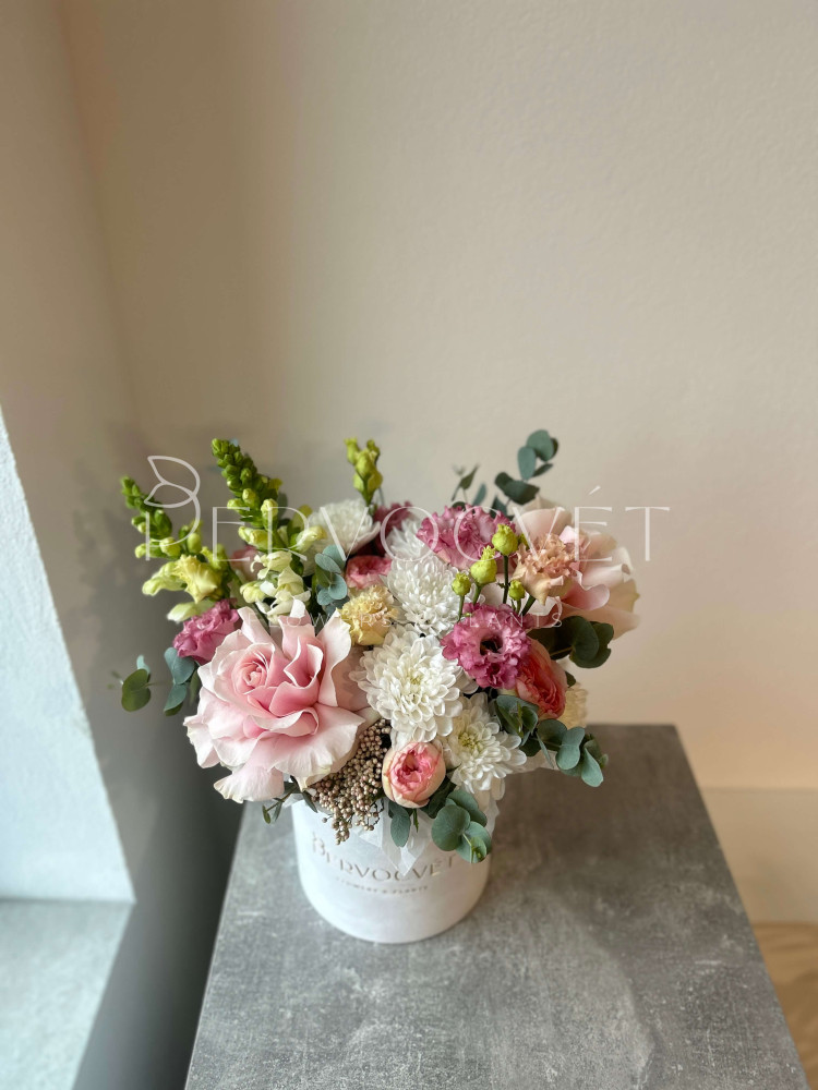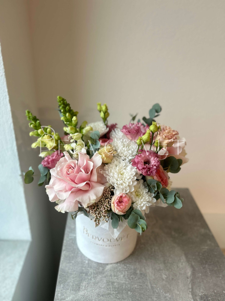 Цветы в бархатной коробке! Розовое и нежное сочетание с французской розой, хризантемой и эустомой. Красивая и стойкая композиция, подойдет и для Дня рождения, и для свадеб, и как подарок-сюрприз!