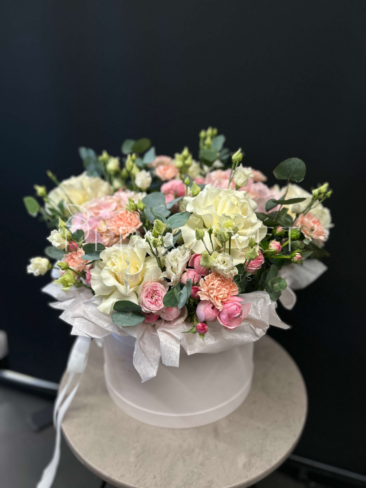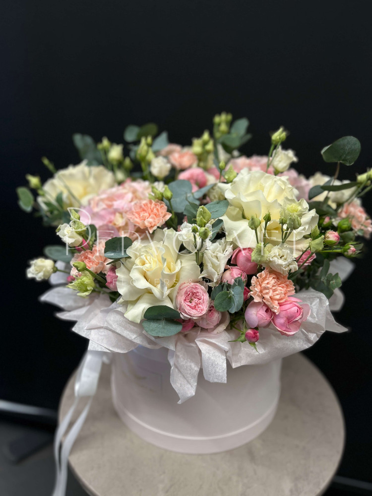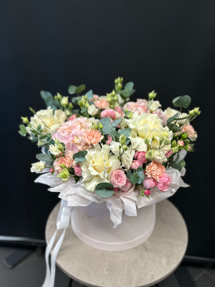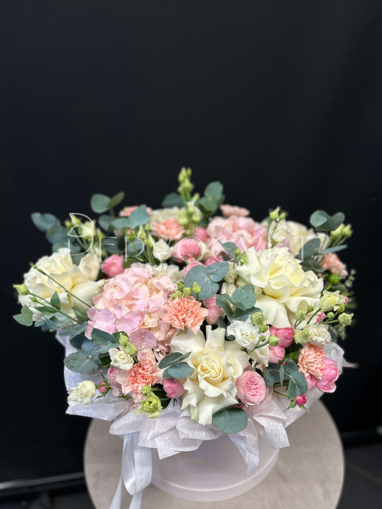 состав: гортензия импорт 2, французская роза 5, пионовидная кустовая роза 5, гвоздика (диантус) 7, эустома 3, эвкалипт