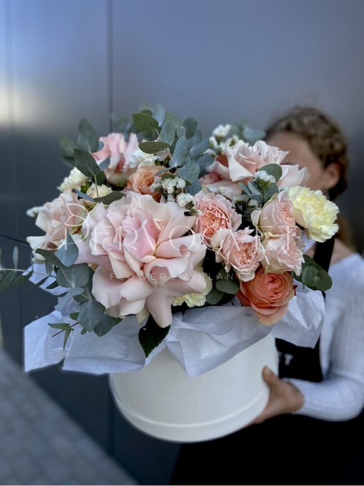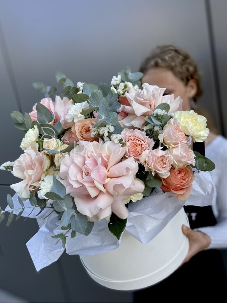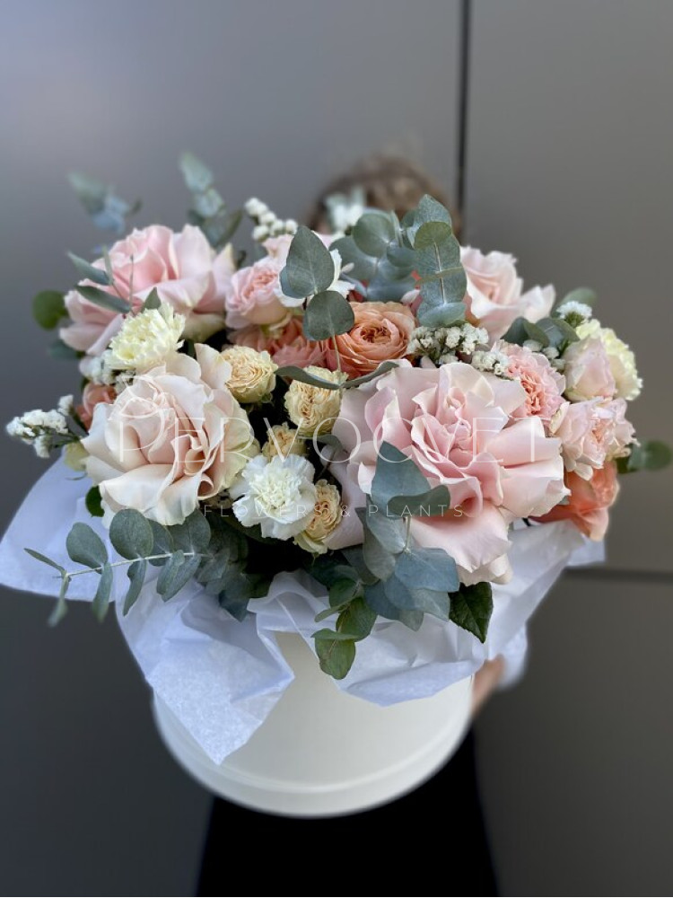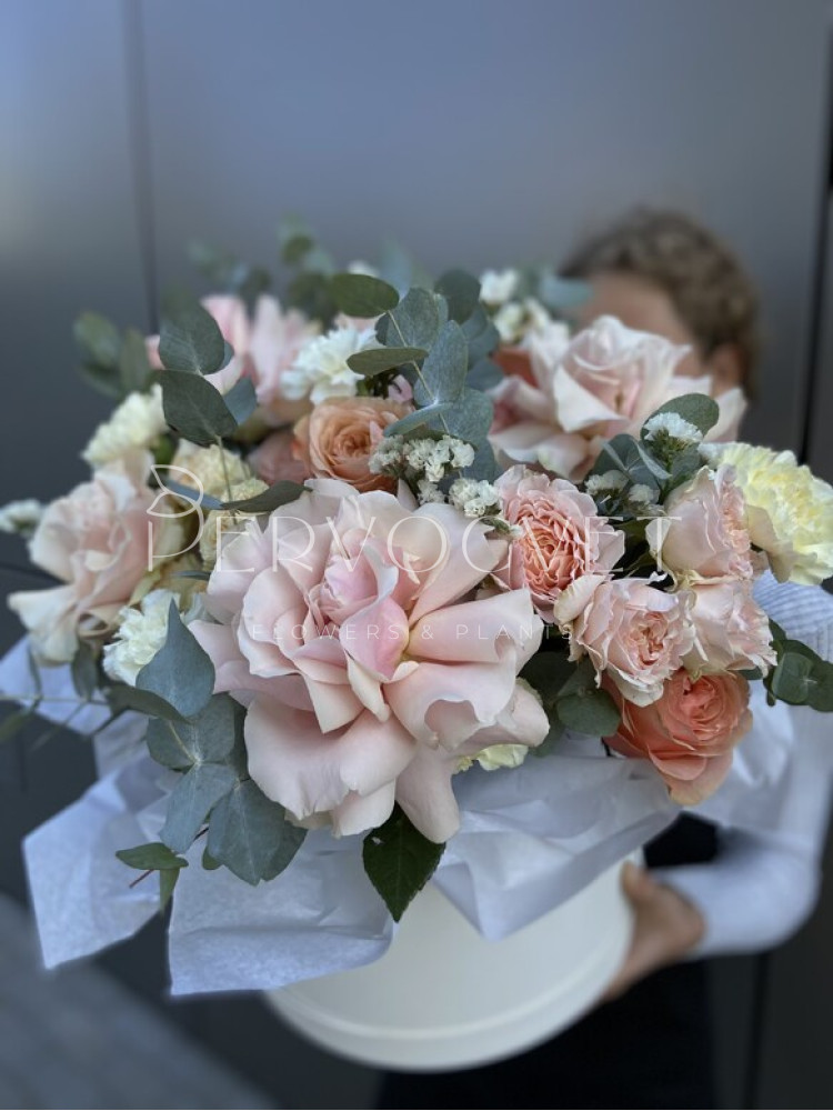 Пышная композиция из самых красивых роз: пионовидная персиково-розовая Кахала, французская роза нежно-розового оттенка сорта Пинк Мондиаль, кустовая розовая роза Бомбастик, кустовая пионовидная двухцветная роза Джульетта, и, конечно, сортовые диантусы и статица, с серым благородным эвкалиптом Цинерая.