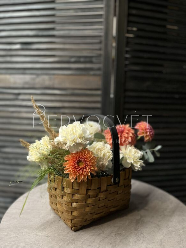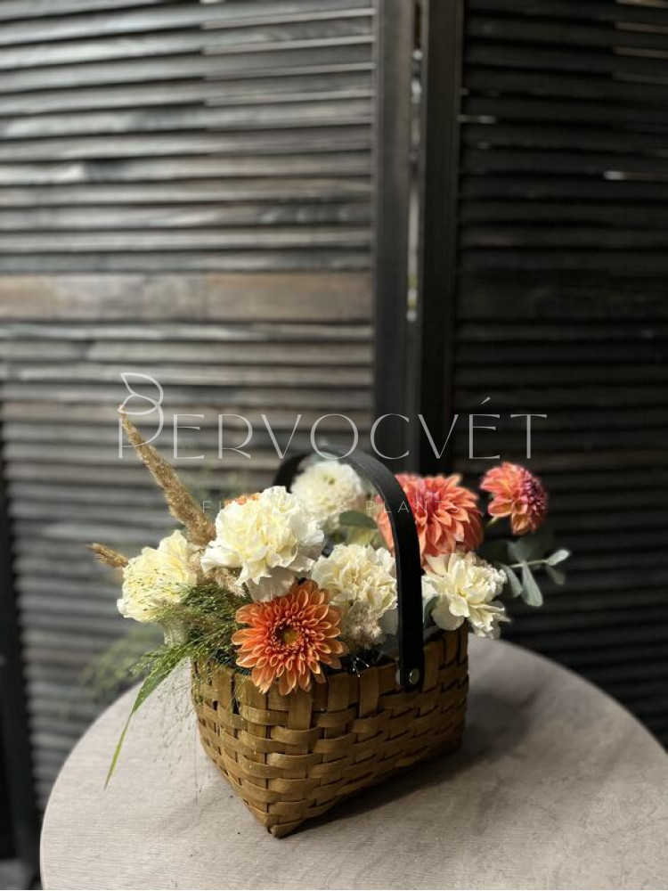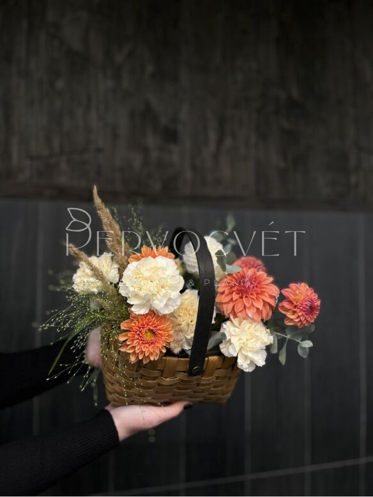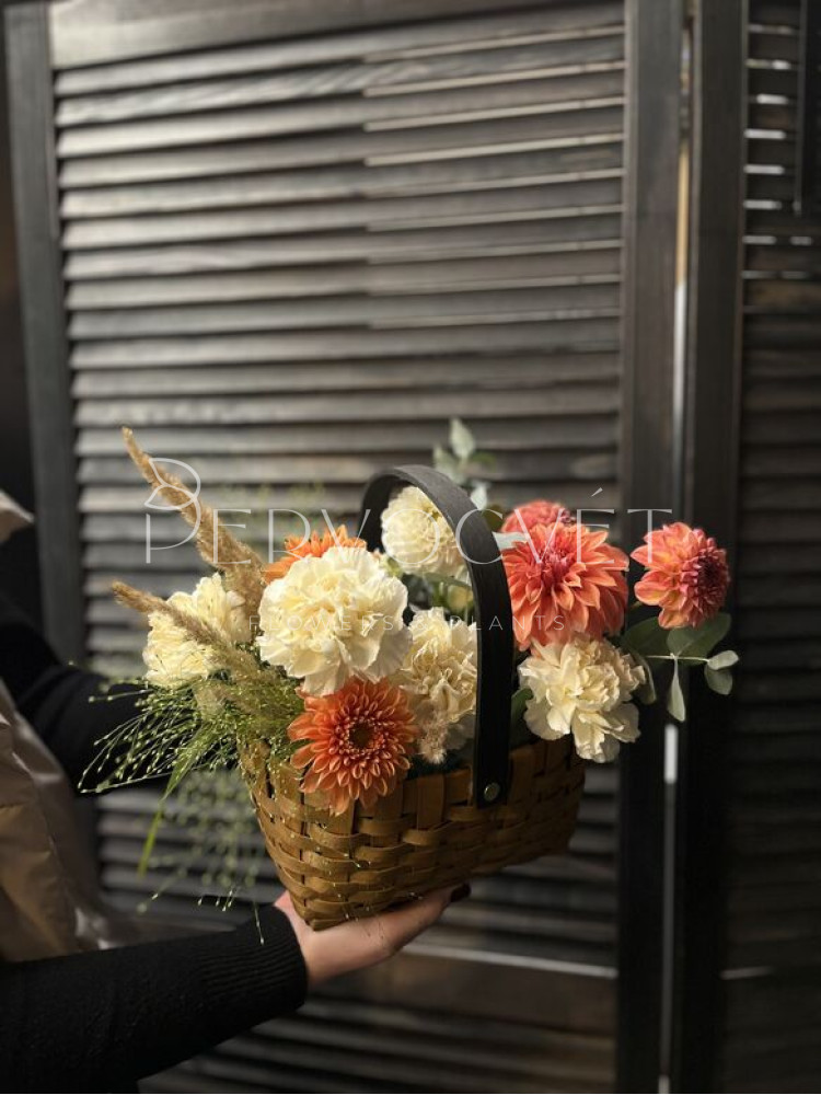Осенняя композиция в корзине с георгинами, пушистым паникумом, розами и сортовыми гвоздиками, сухоцветами и эвкалиптом. Самые стойкие яркие цветы, в оттенках осени в единой композиции!