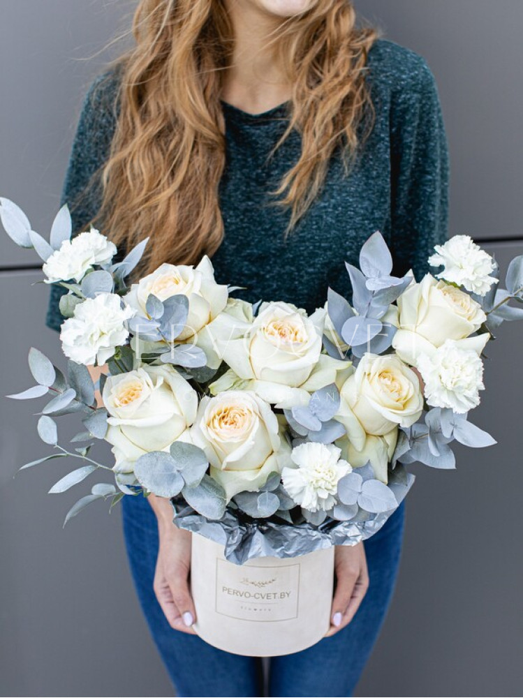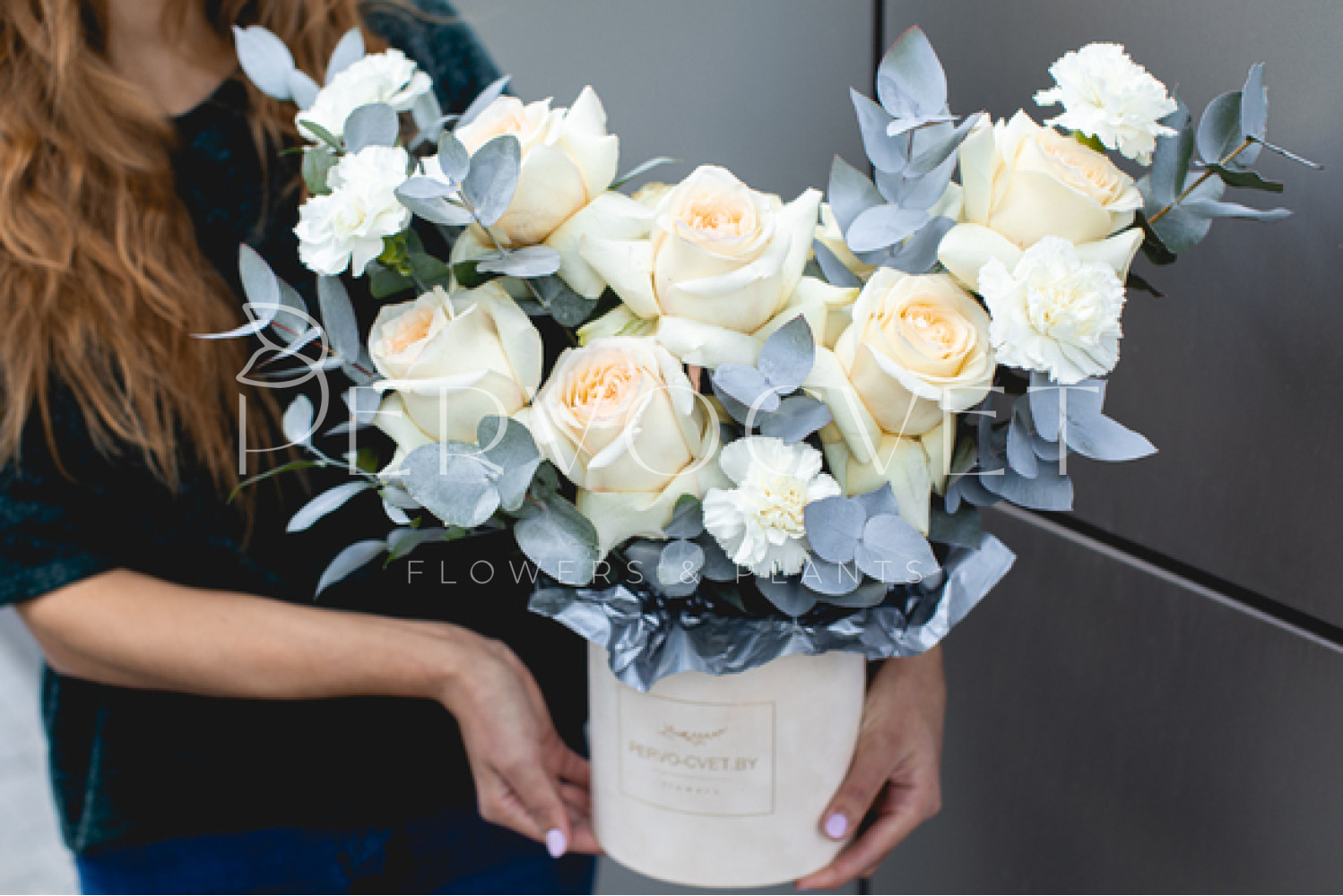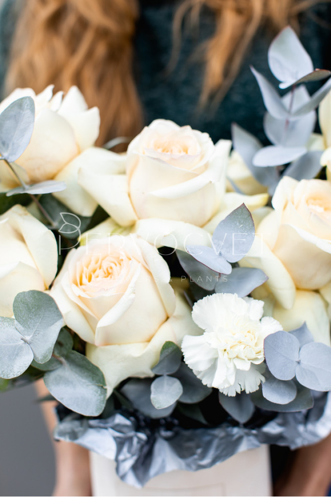 состав: роза пионовидная ароматная (сорт Вайт Охара, Эквадор), гвоздика, эвкалипт