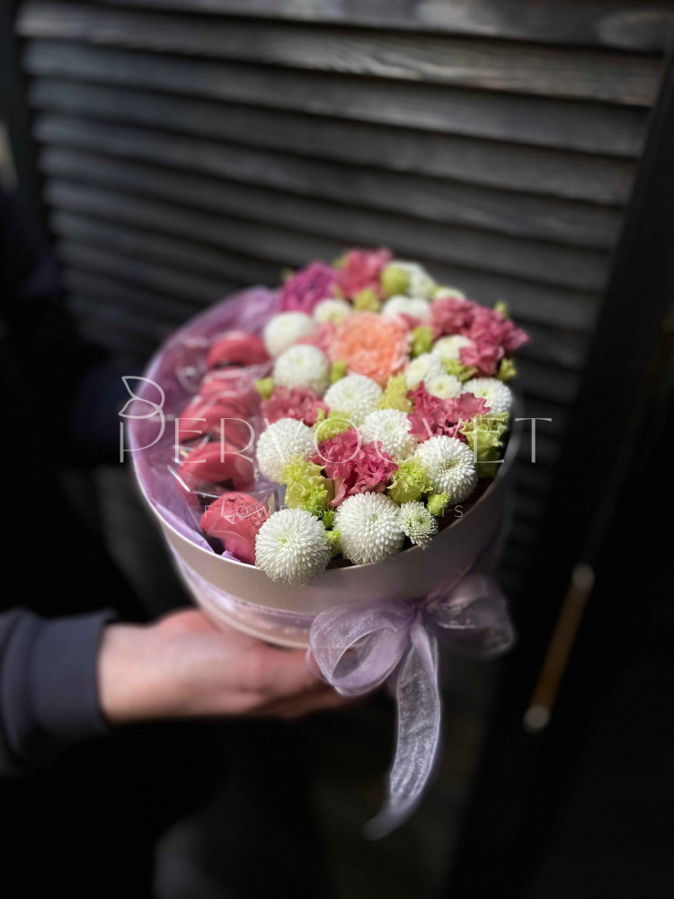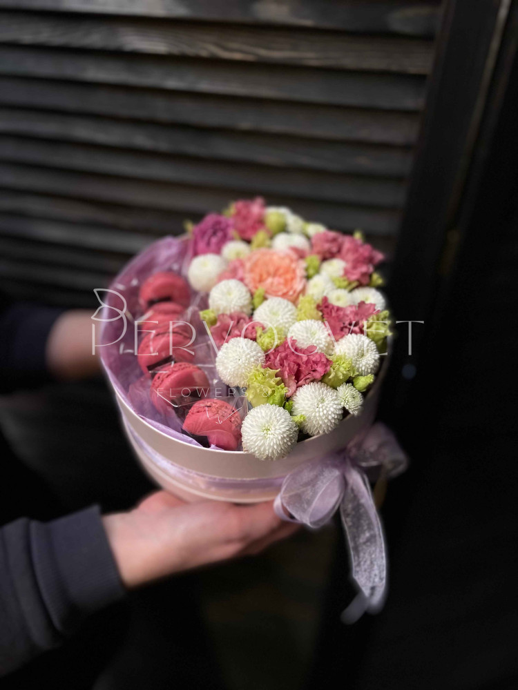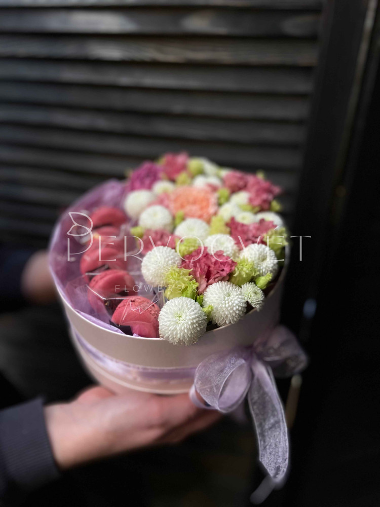 Нежная коробочка с цветами и макарунами: хризантемы светлых оттенков и эустома. Стойкое красивое сочетание и определенно сюрприз!