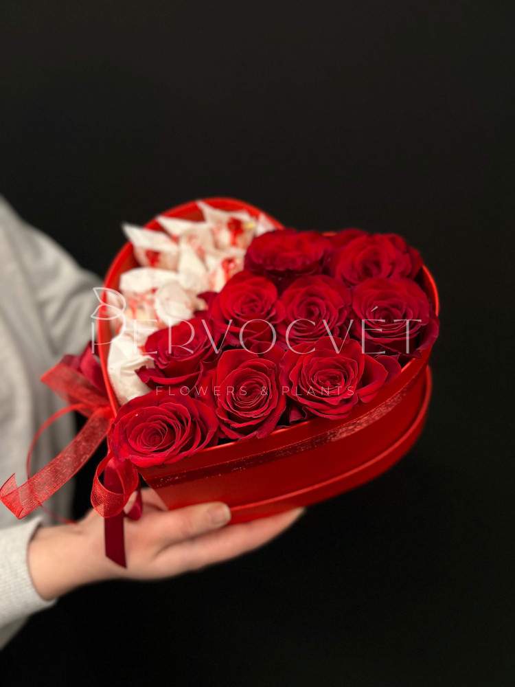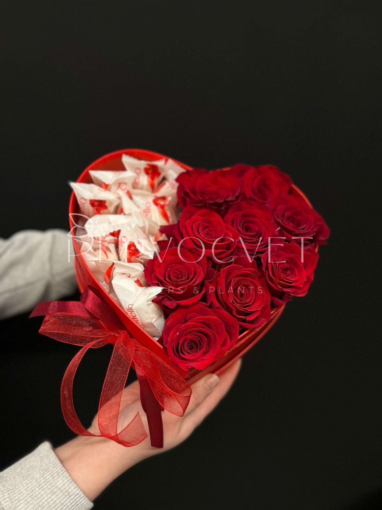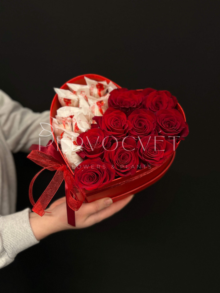 Композиция из красных роз и всеми любимых конфет Рафаелло в коробке-сердечке - идеально для признания в любви!