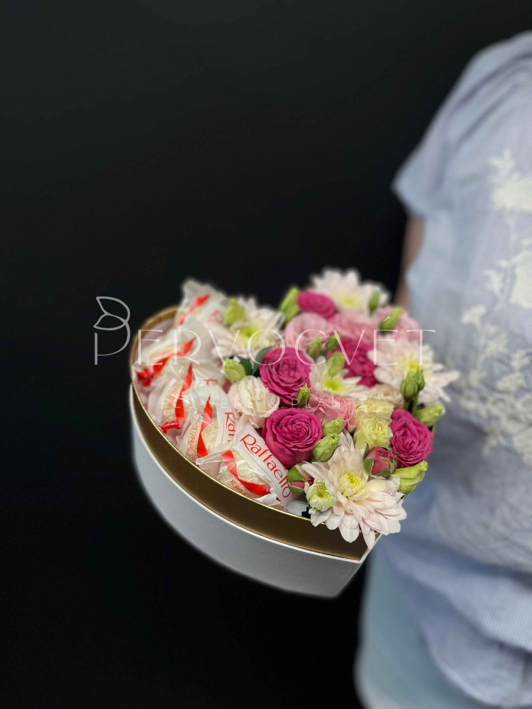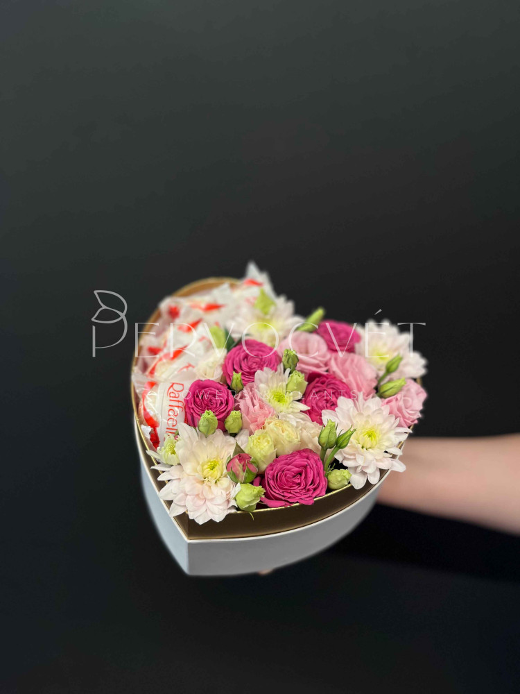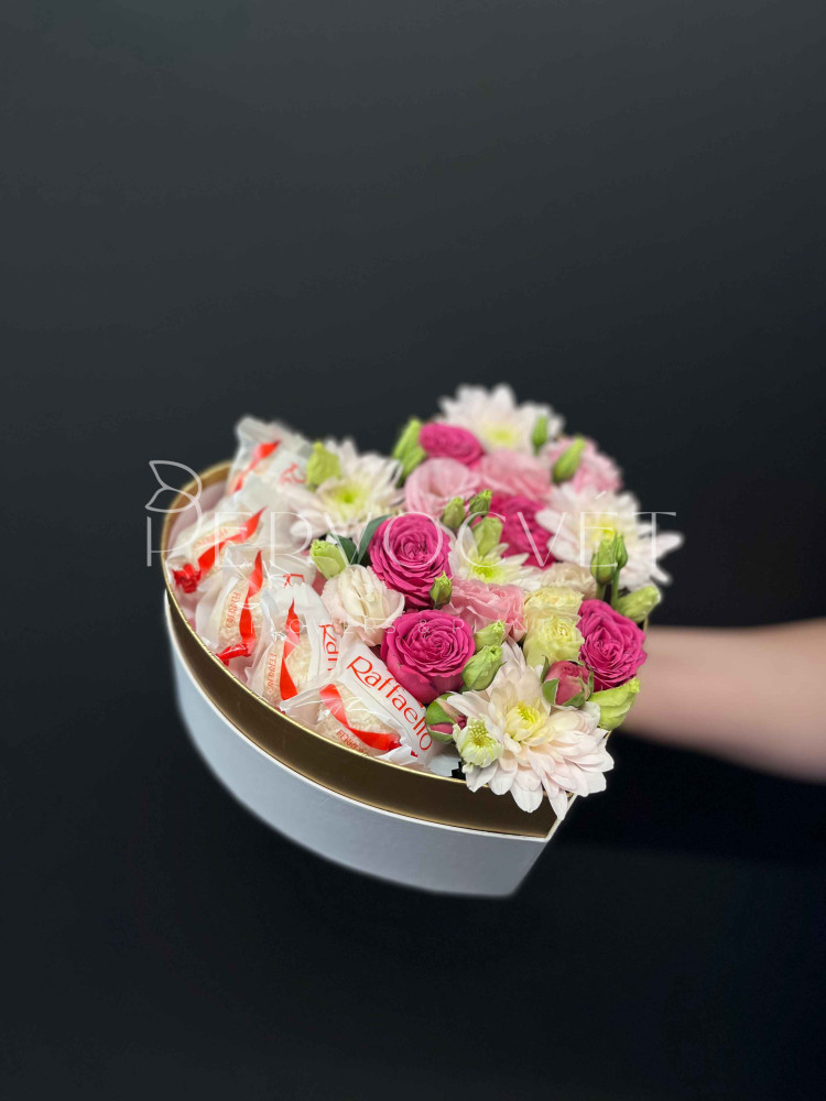 Вкусное сердечко с конфетами Рафаэлло и яркой цветочной композицией в розовых оттенках. Красивый сюрприз - коробочка закрывается и перевязывается бантом из атласной ленты, поэтому то что внутри остается загадкой до самого момента открытия!