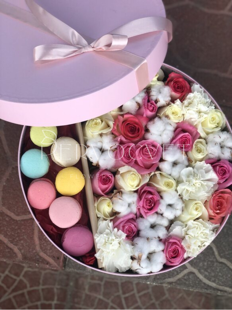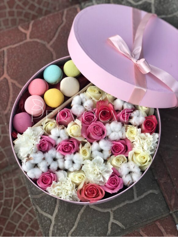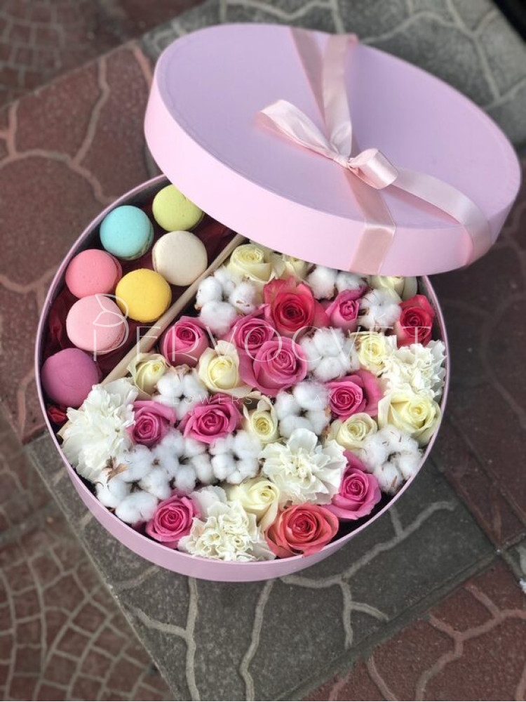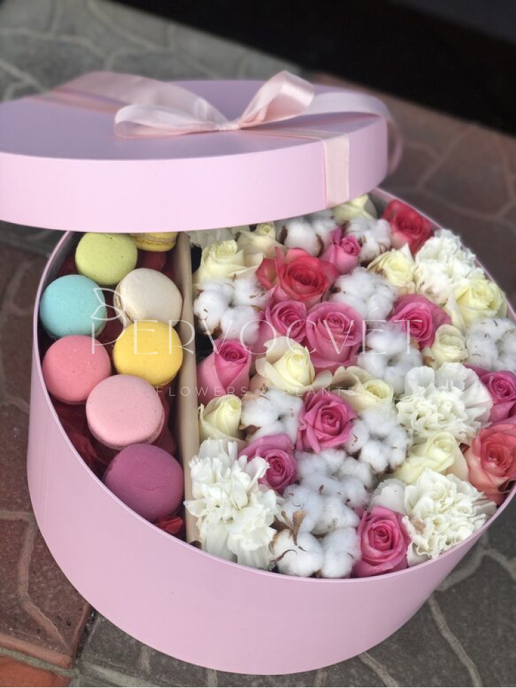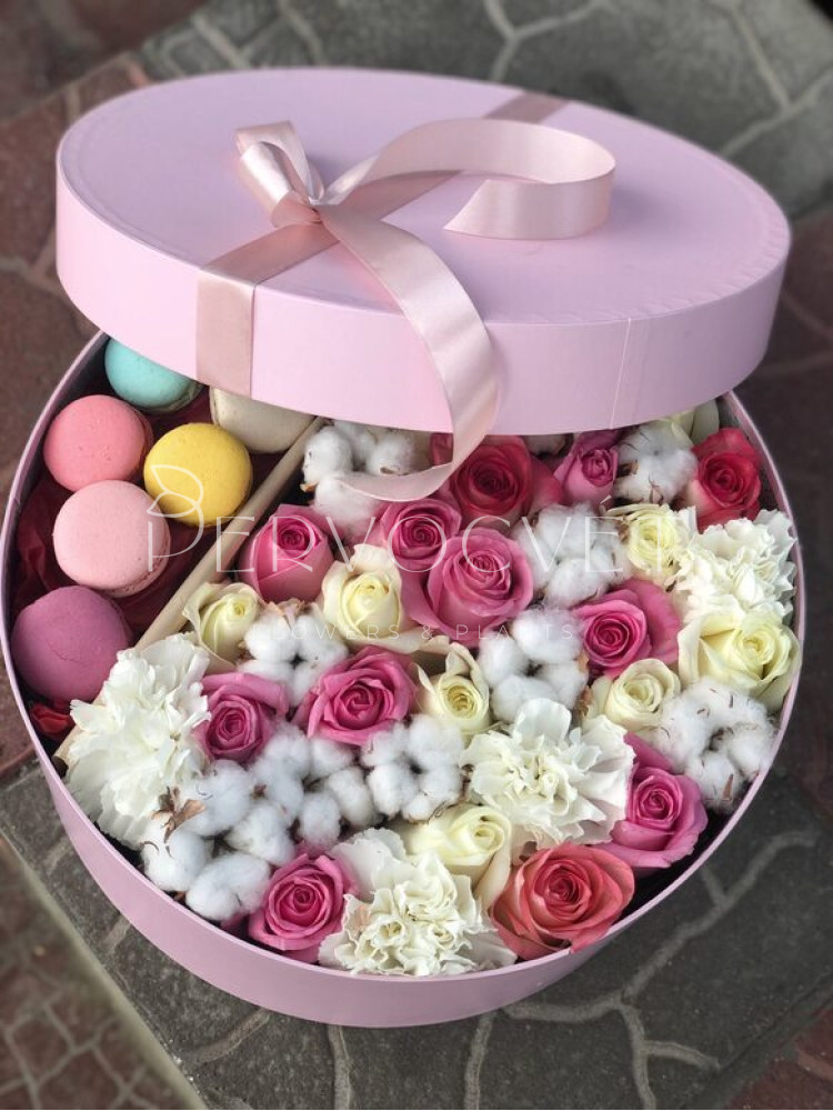 Композиция из нежных оттенков роз и сортовых диантусов с коробочками хлопка, которые в дальнейшем можно использовать в оформлении интерьера многие годы, с пирожными Макаронс - шикарный утонченный сюрприз.