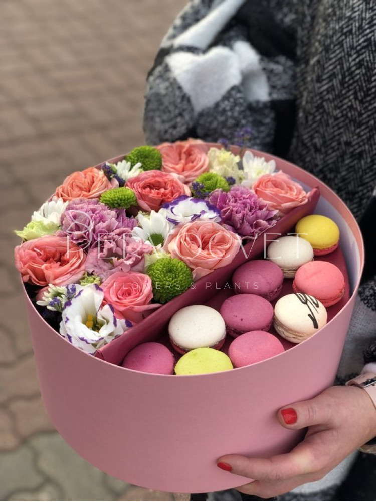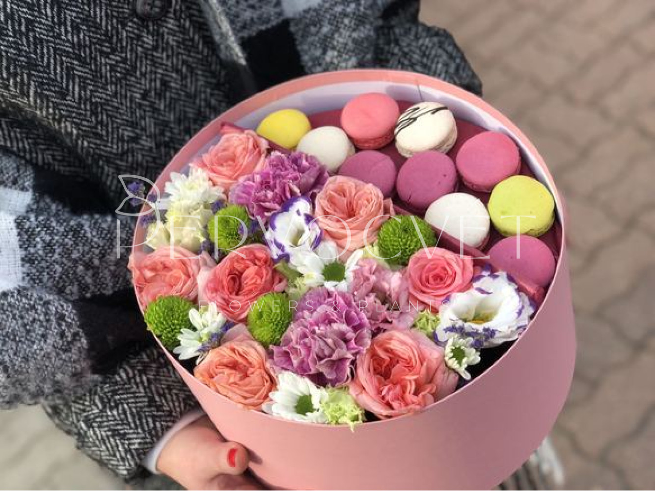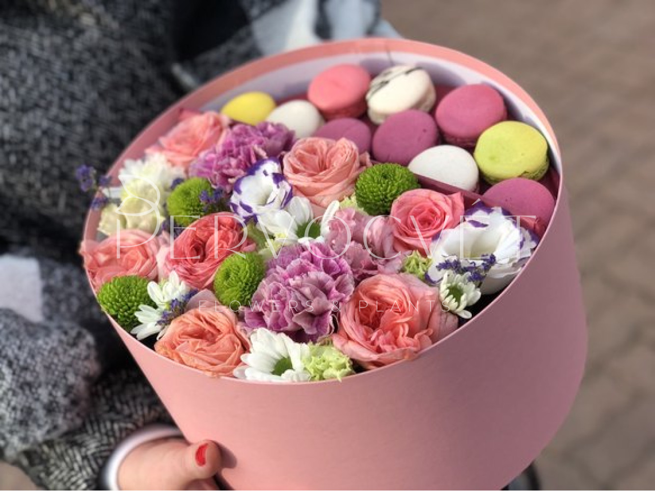 Яркая композиция в малиново-персиковых оттенках роз, диантусов и эустомы с макарунами - "вау-эффект" в коробке.