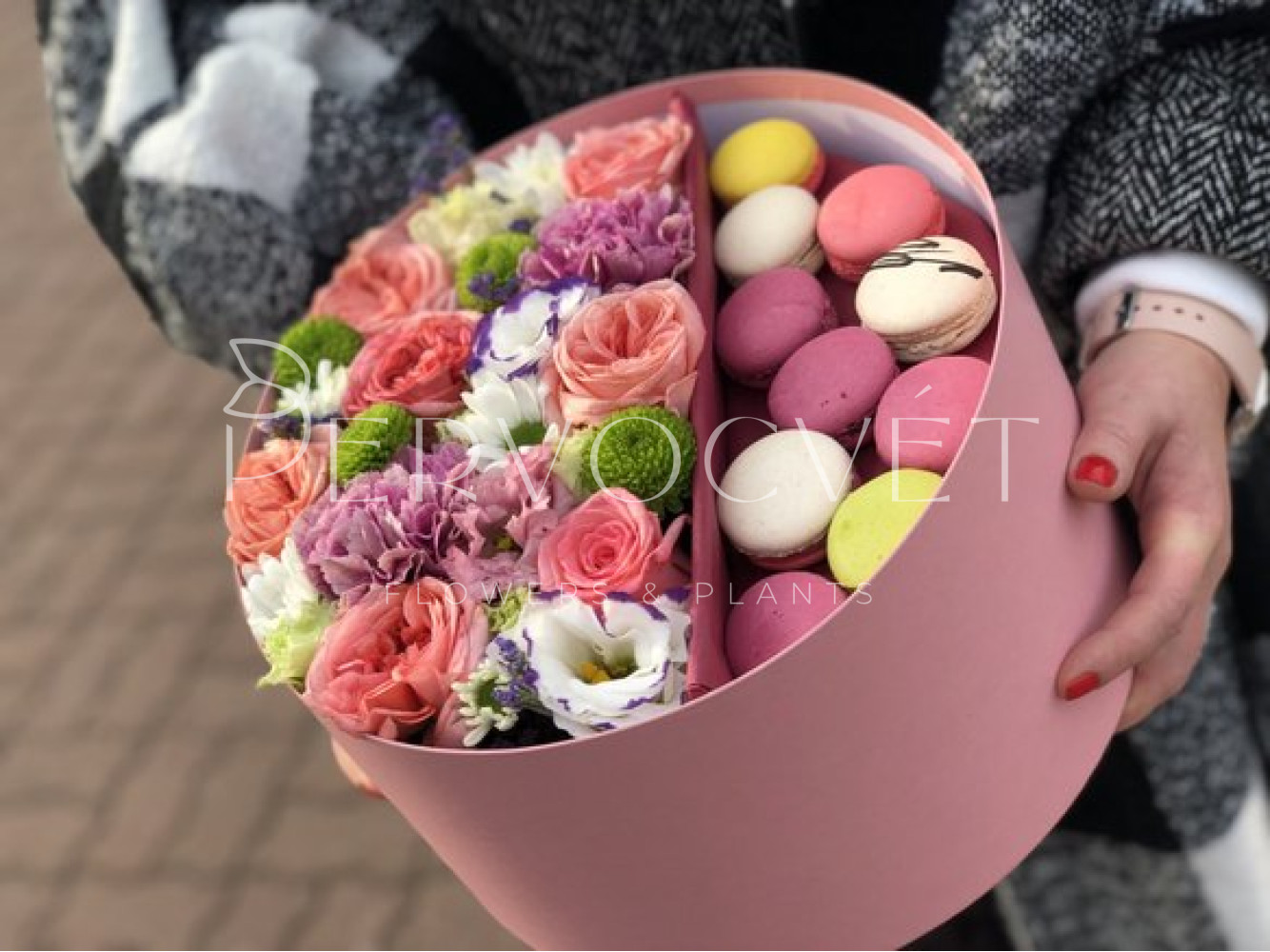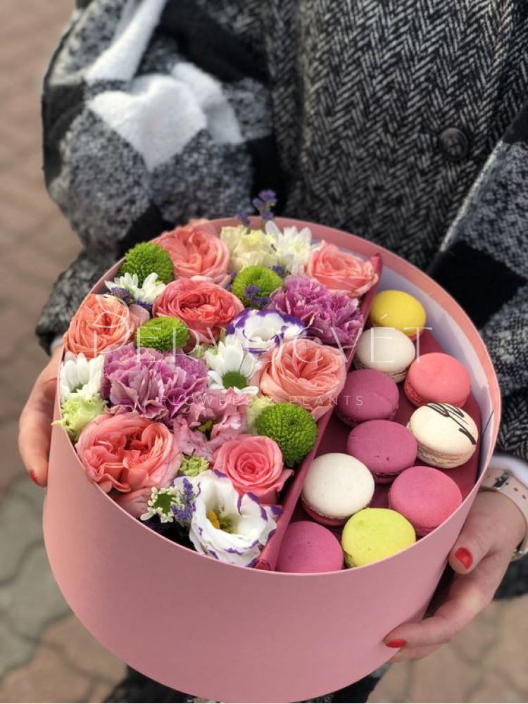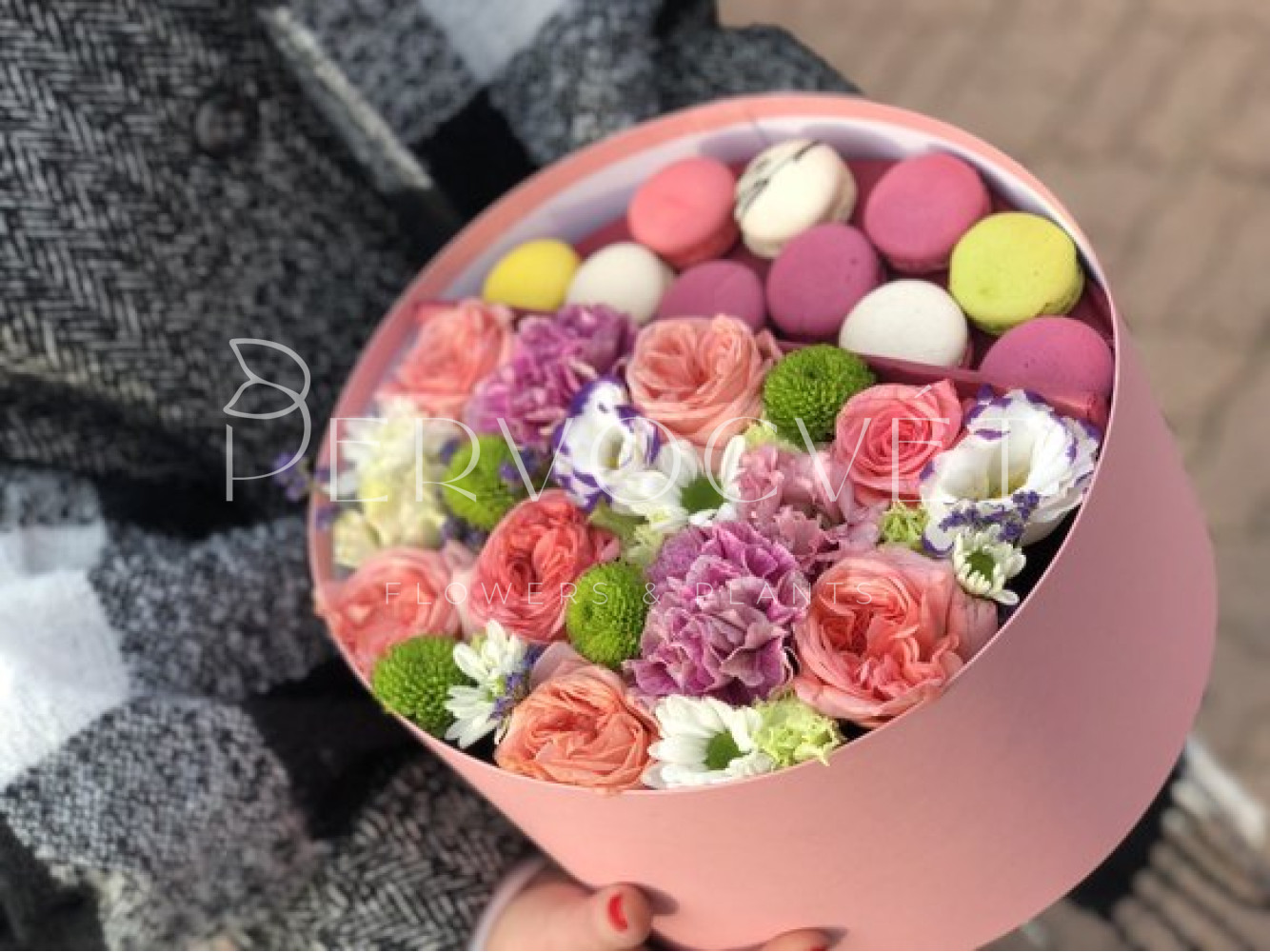 Яркая композиция в малиново-персиковых оттенках роз, диантусов и эустомы с макарунами - "вау-эффект" в коробке.