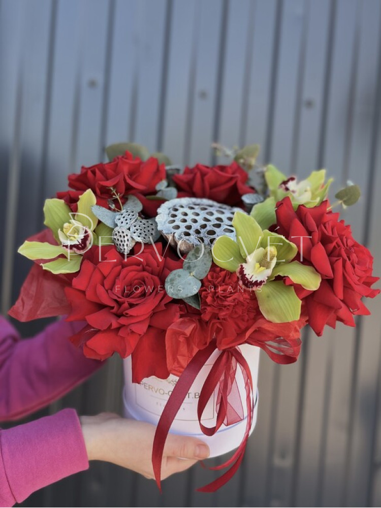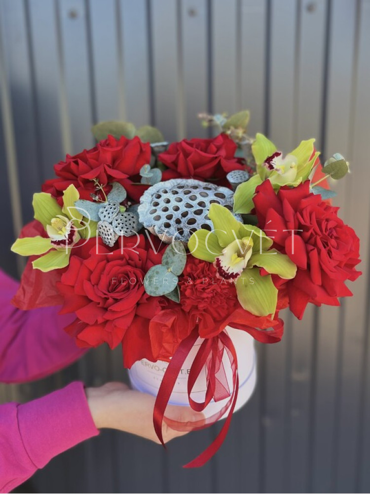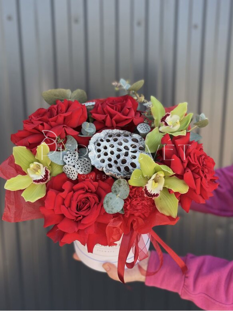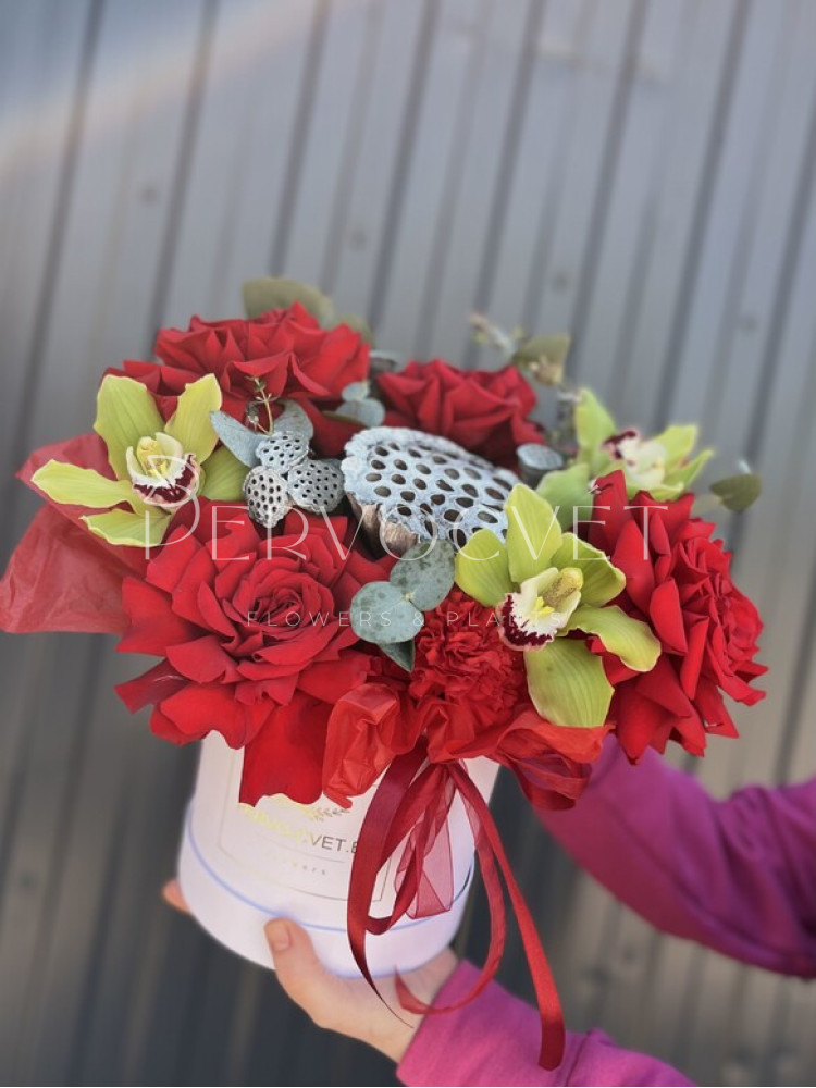 Экзотическая композиция с французской красной розой, орхидеями и крашеным лотосом! Яркость и необычность привлекающая внимание.