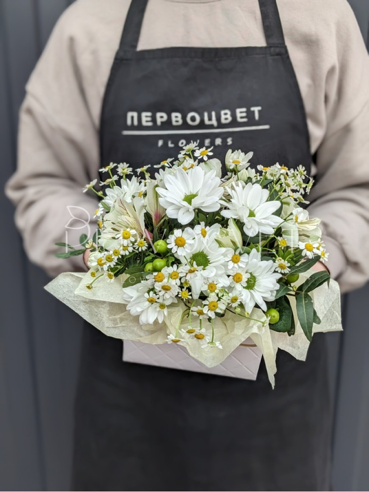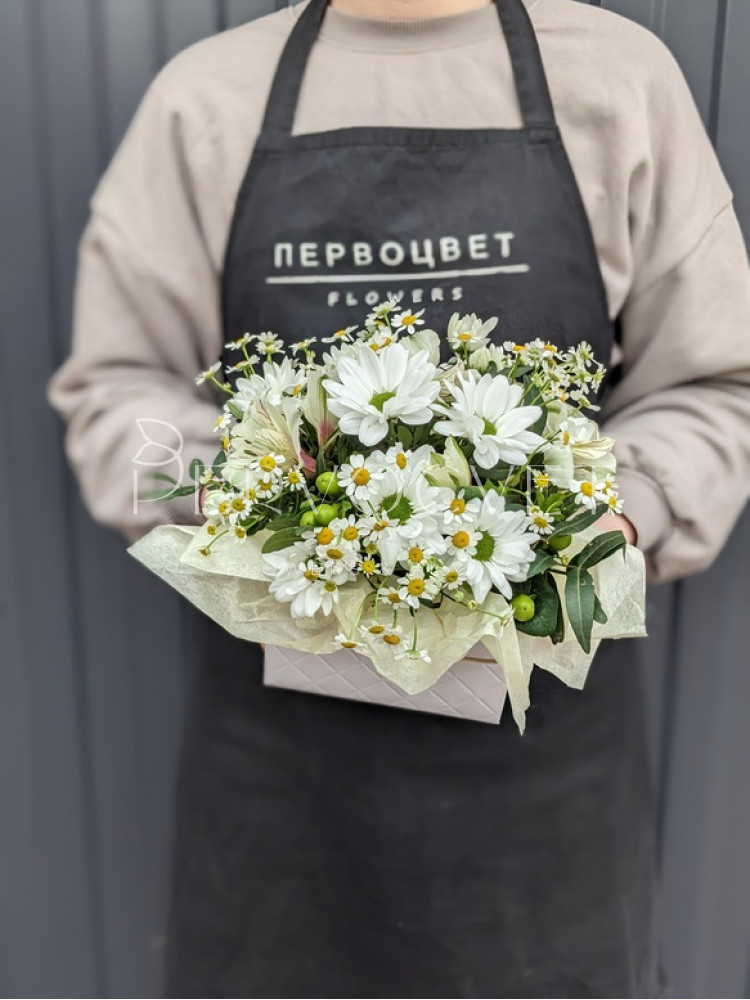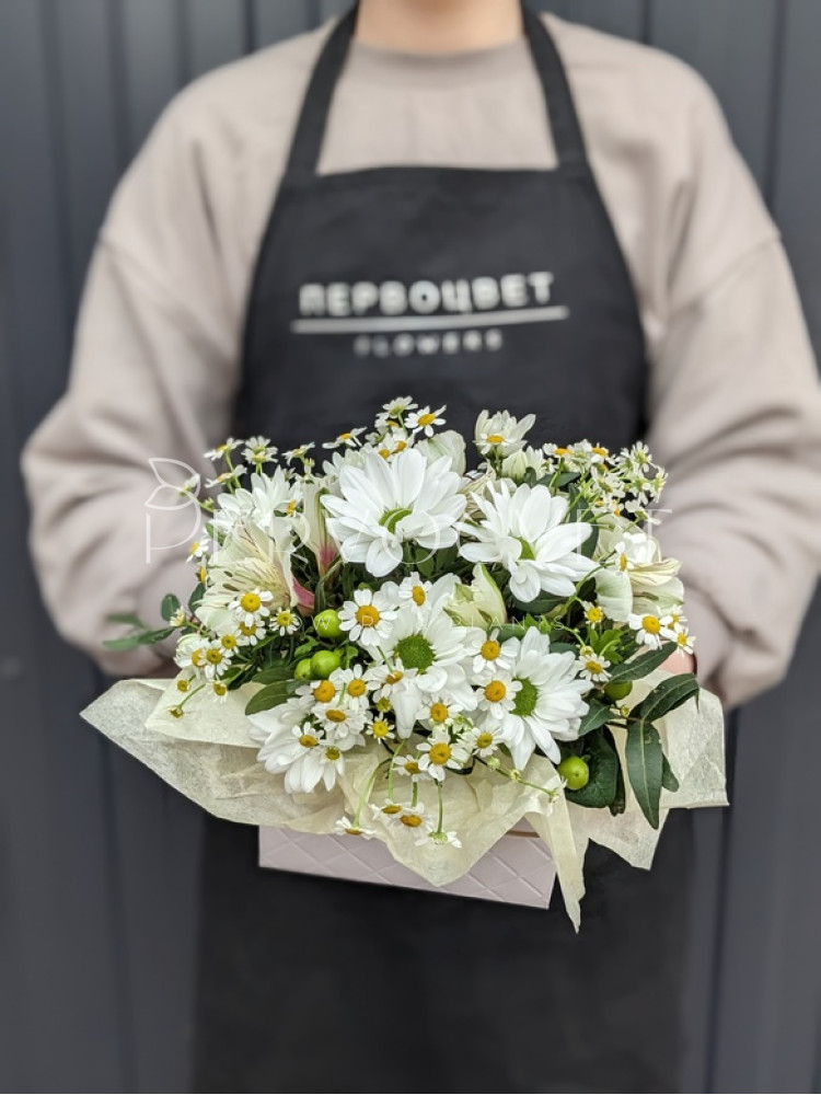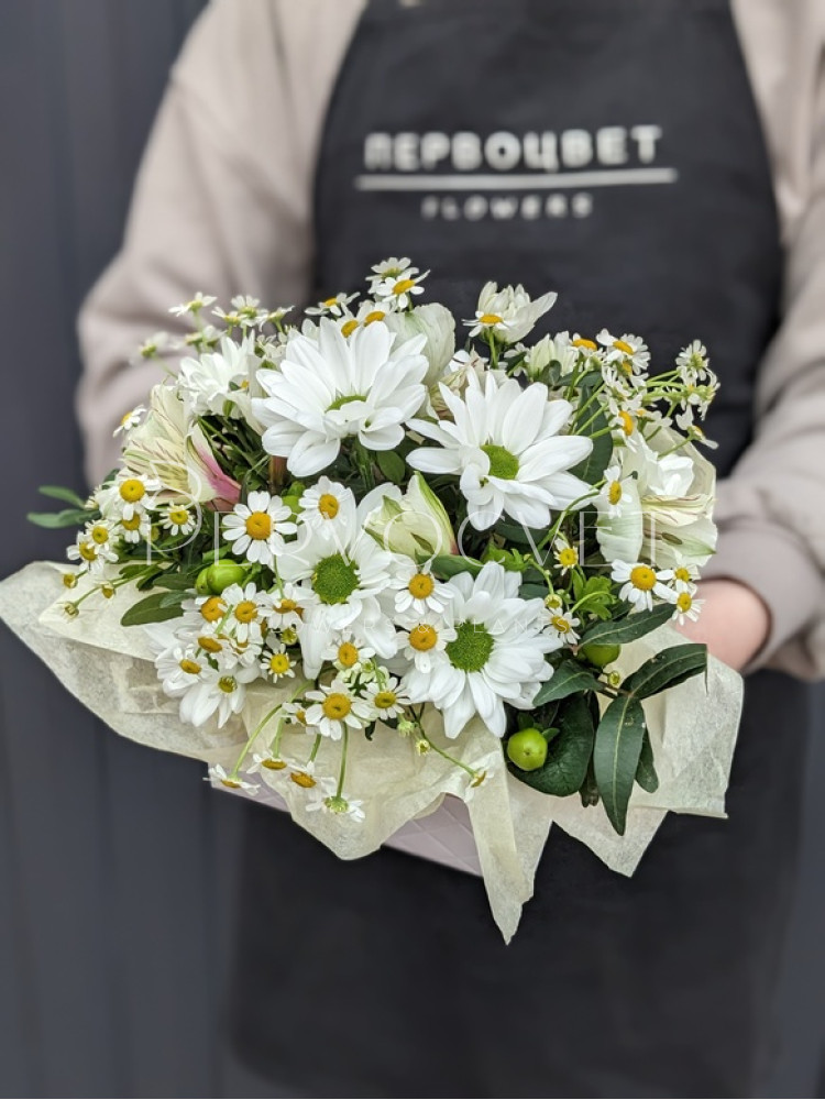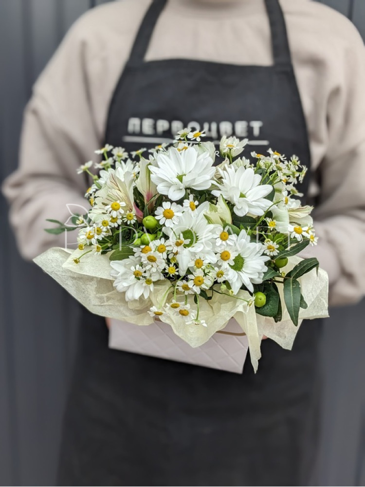 Летняя композиция как поле из ромашек: ромашковая хризантема, танацетум, ягоды гиперикума, альстромерия и фисташка. Игривая и стойкая композиция в сумочке.