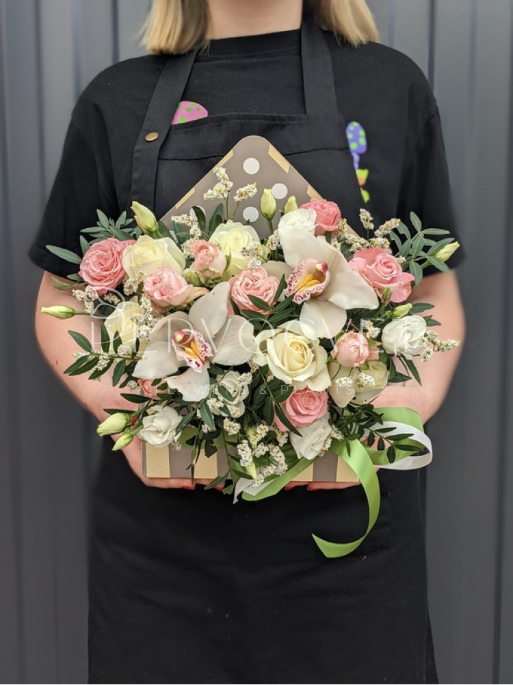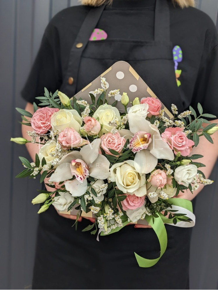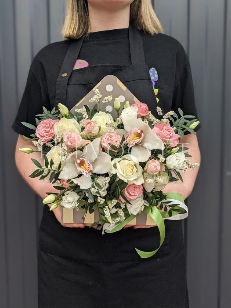 Нежная композиция в конверте с белыми орхидеями Цимбидиум, кустовой розой, эустомой, розами и лимониумом. Пышная и стойкая композиция для подарка!