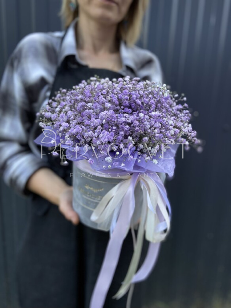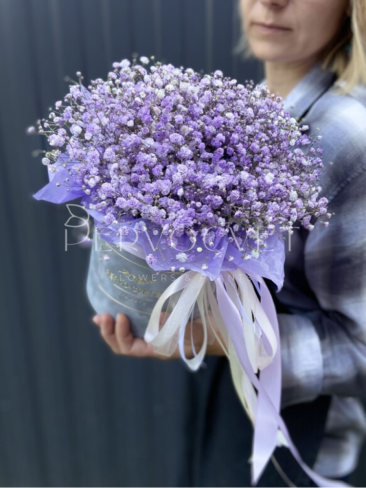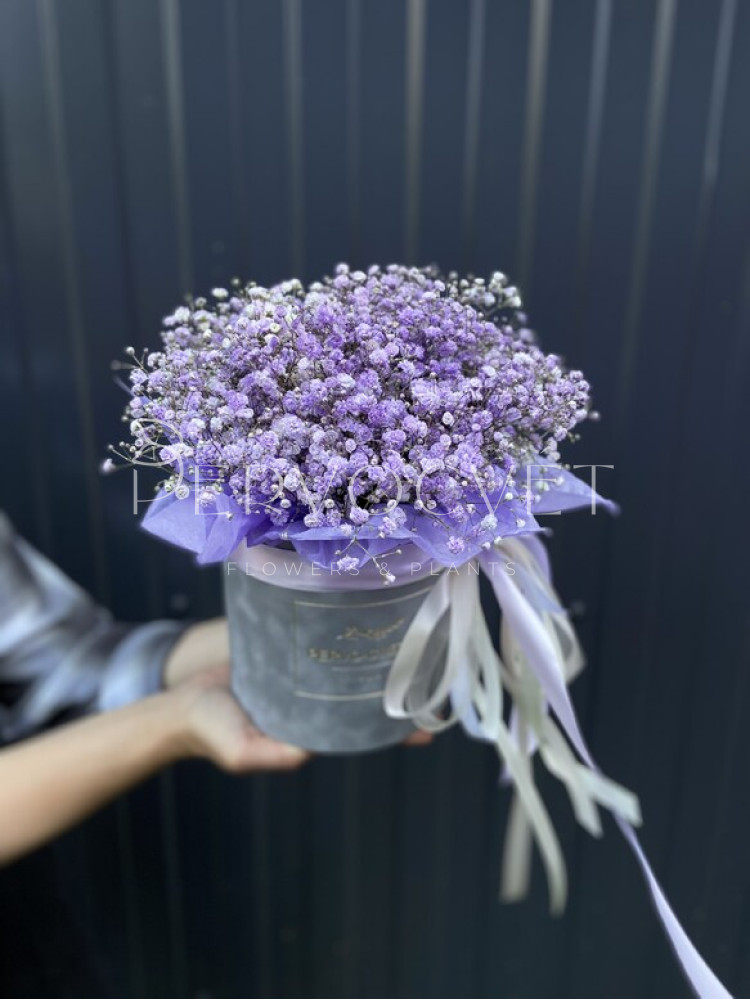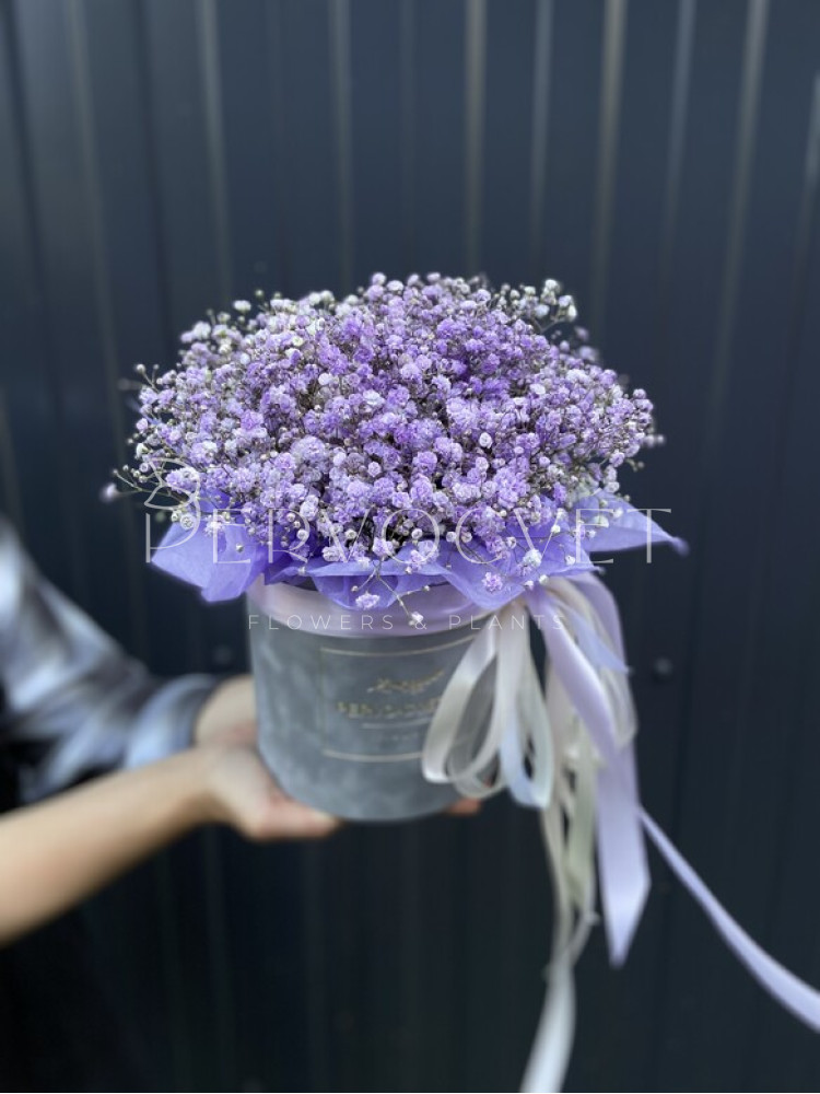 Композиция из сиреневой гипсофилы в бархатной серой коробке - самые стойкие цветы, в любимом многими сиренево-фиолетовом цвете, который так часто предпочитают творческие персоны!
