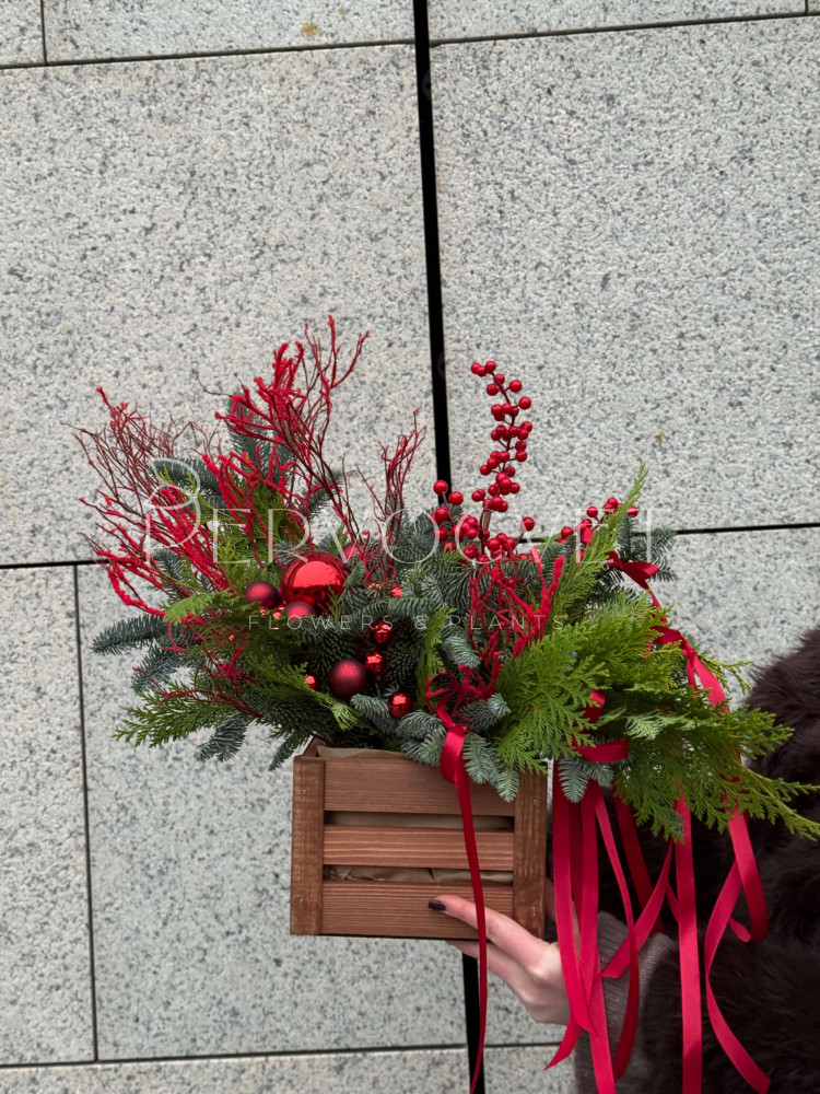 Всегда актуальный красный декор на рождественской, новогодней композиции! Красиво, ярко и настроением праздника и волшебства. Два вида хвои в деревянном ящике и декор - идеальная композиция для дома, в подарок, когда идешь в гости или для украшения рабочего пространства!