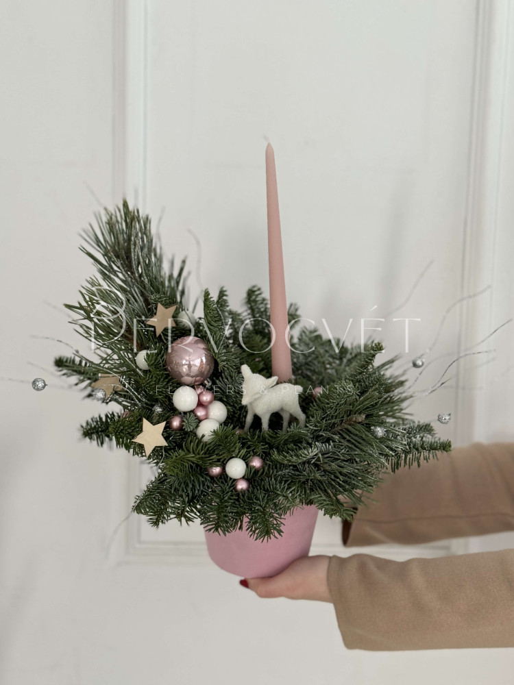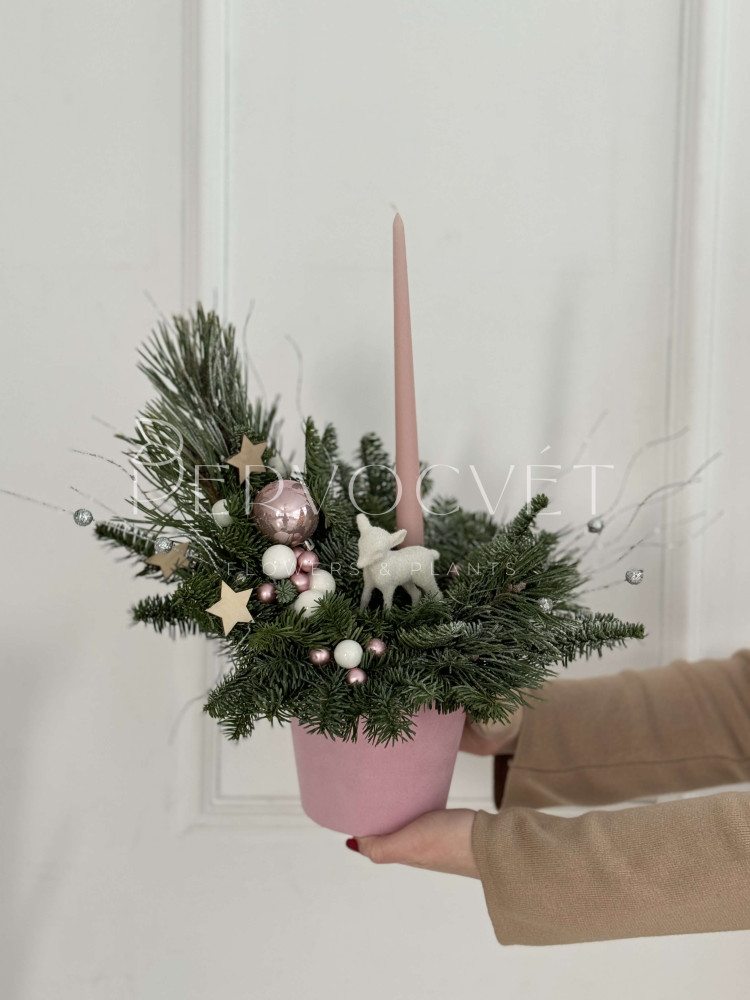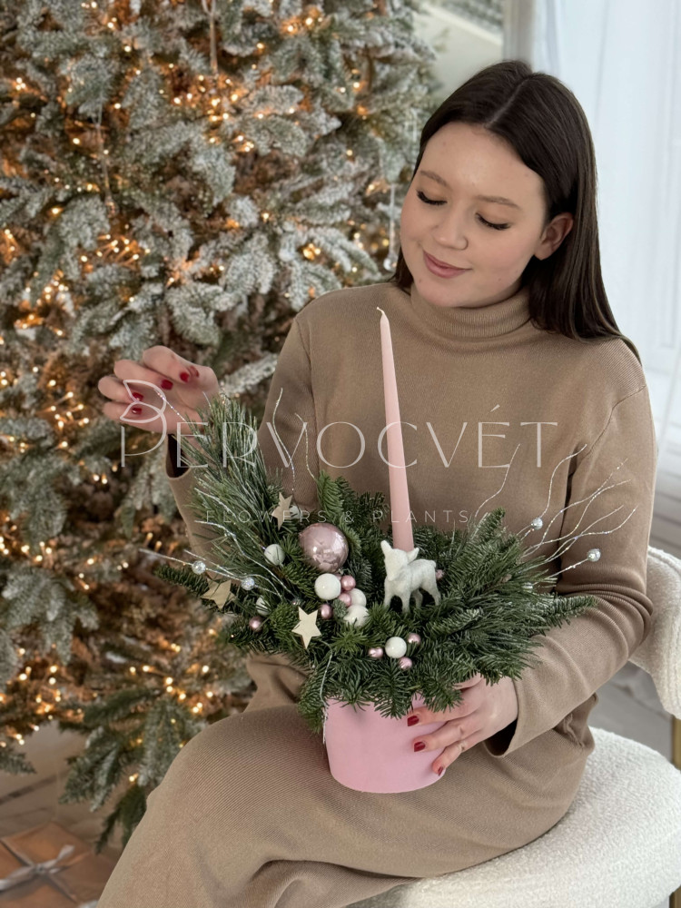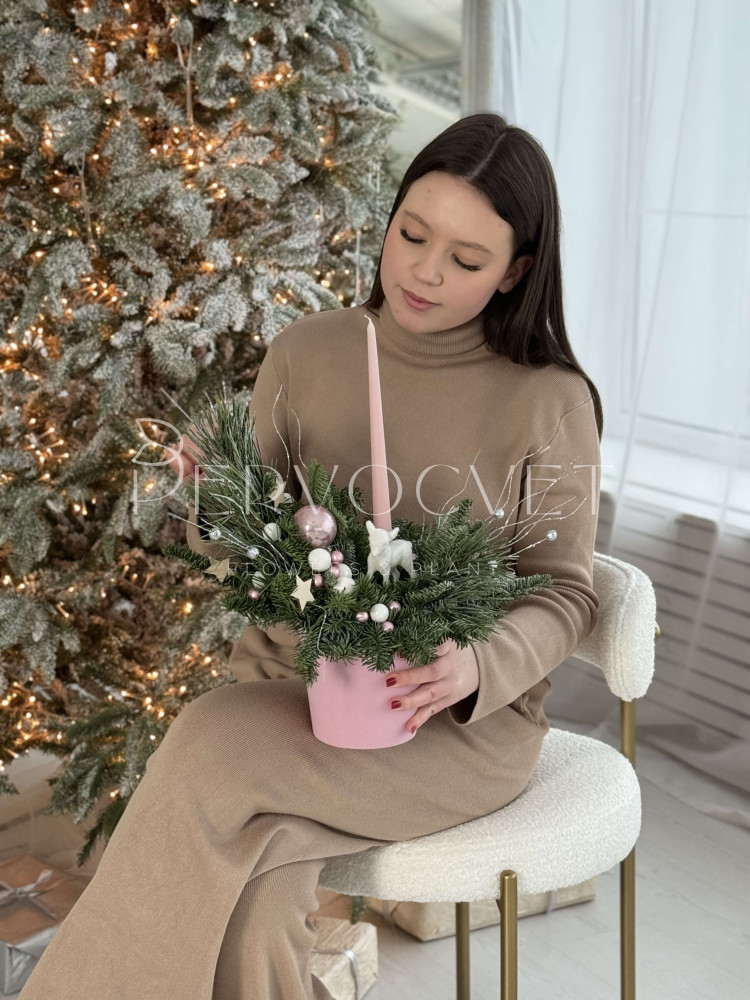 Новогодняя композиция в ящике на основе натуральной пихты Нобилис с праздничным декором, шариками и статуэткой олененка в розовых оттенках. Нежная композиция подходит как для оформления праздничного стола, так и в качестве декора в интерьере. Красивый и нежный подарок для похода в гости на праздники!