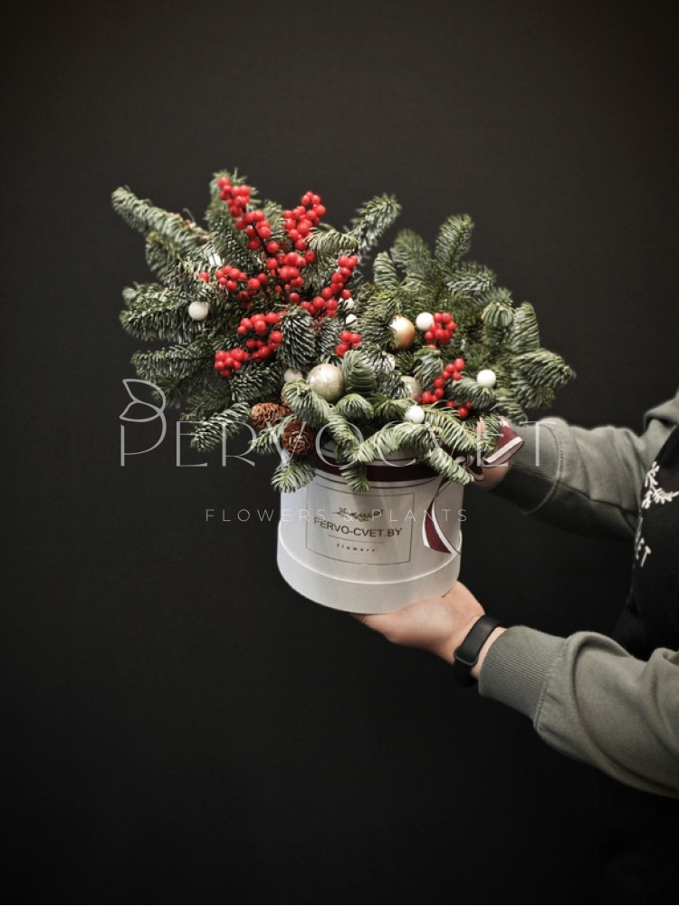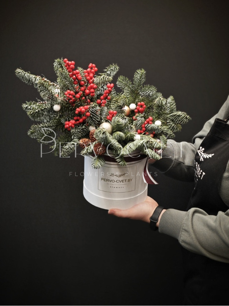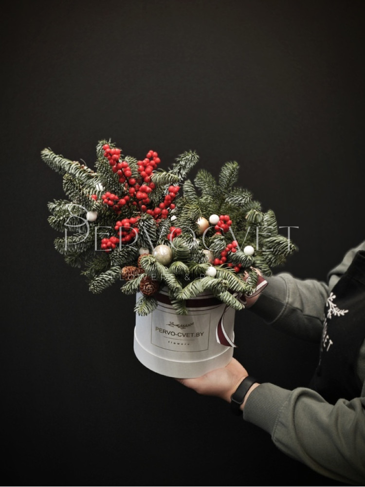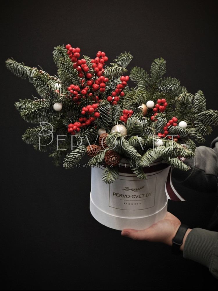 Новогодняя асимметричная композиция в шляпной коробке из натуральной пихты Нобилис и ягод сочного красного Илекса, с декором из шариков, шишек и снега! Яркие ягоды и зелено-серая хвоя - аромат пихты и праздничные оттенки для оформления Вашего Нового года!