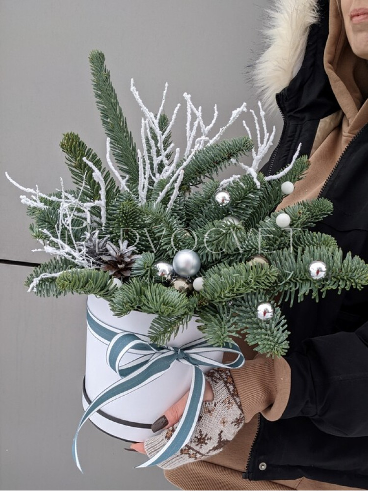 Рождественская композиция в шляпной коробке на основе натуральной пихты Нобилис в серебряно-белом цвете: заснеженные ветки (серебристые веточки), елочные жемчужно-серебрянные шарики, натуральные шишки. Идеальная композиция к новогоднему столу, в качестве подарка!