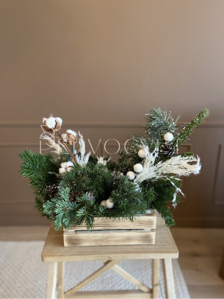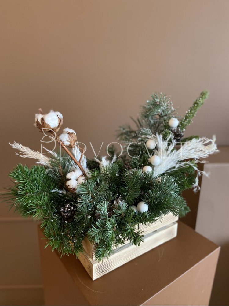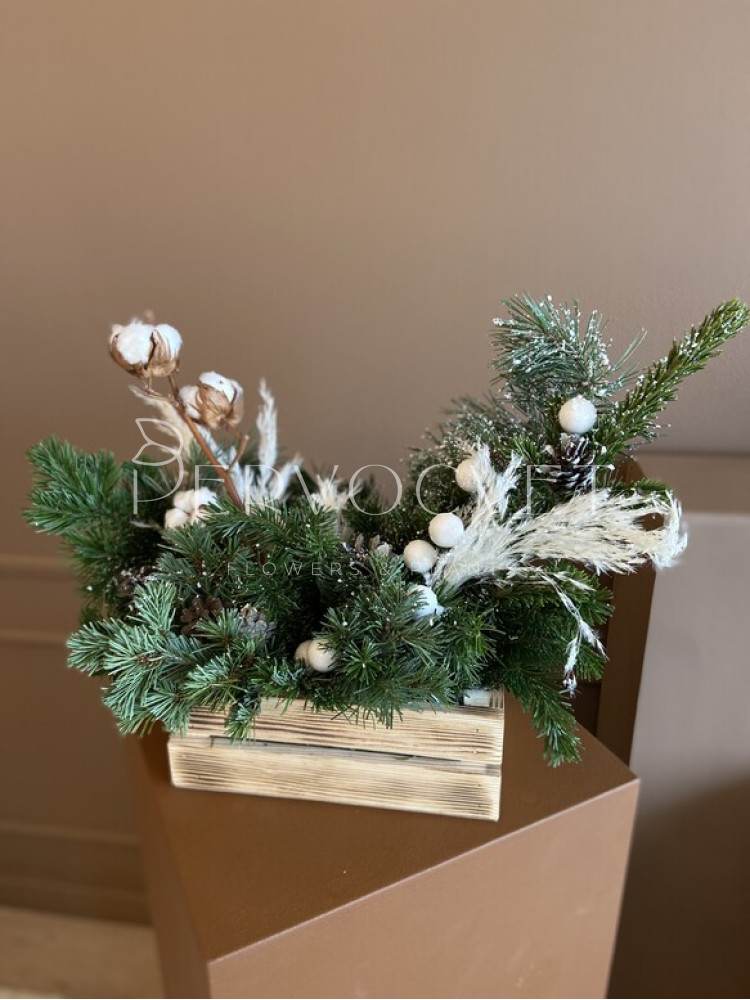 Новогодняя стильная композиция в ящике на основе натуральной пихты Нобилис, с зеленью Кониферн, веткой хлопка с декором: шишки, шарики, сухоцветы, искусственный снег. Иделальна для завершения любого интерьера: дом, ресепшена в офисе, и, конечно, в качестве подарка.