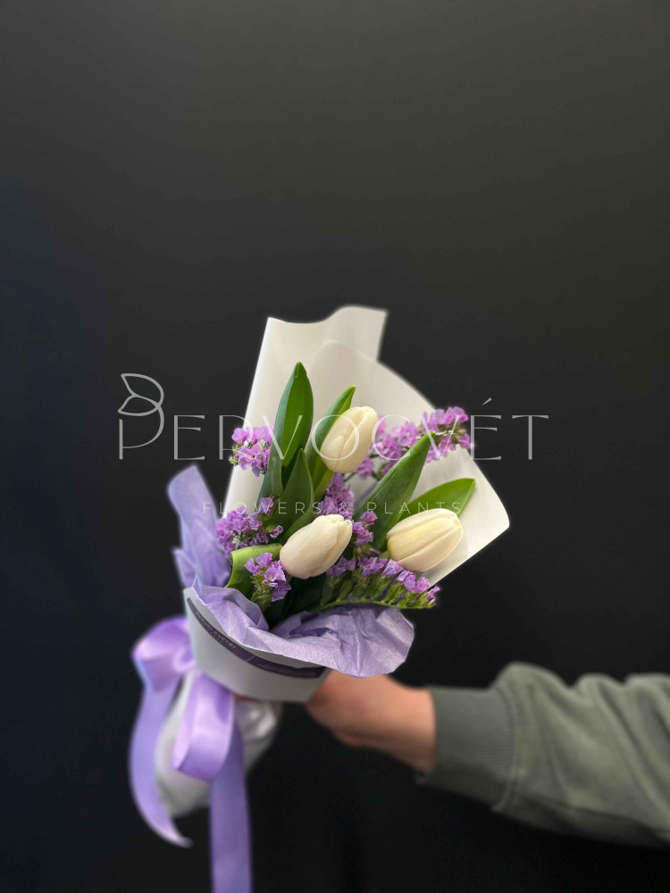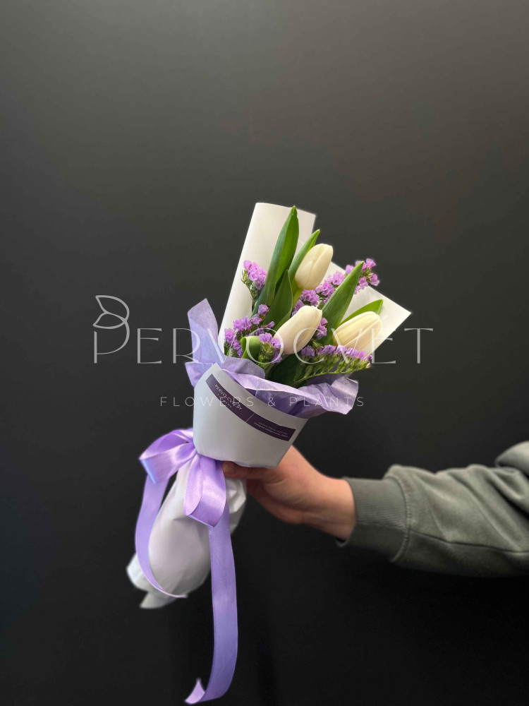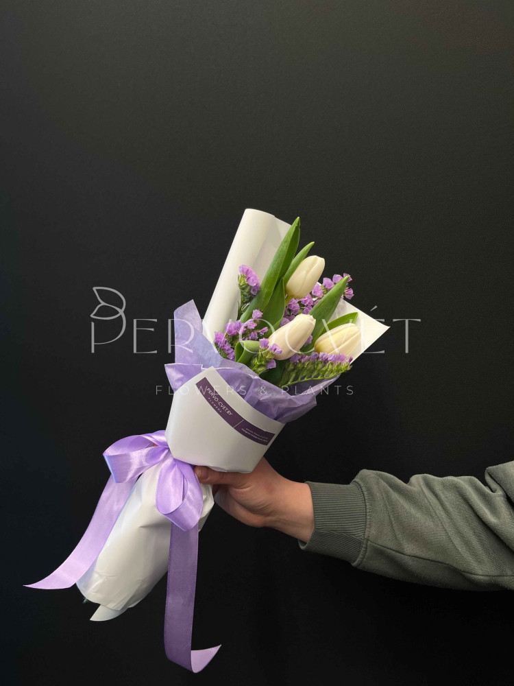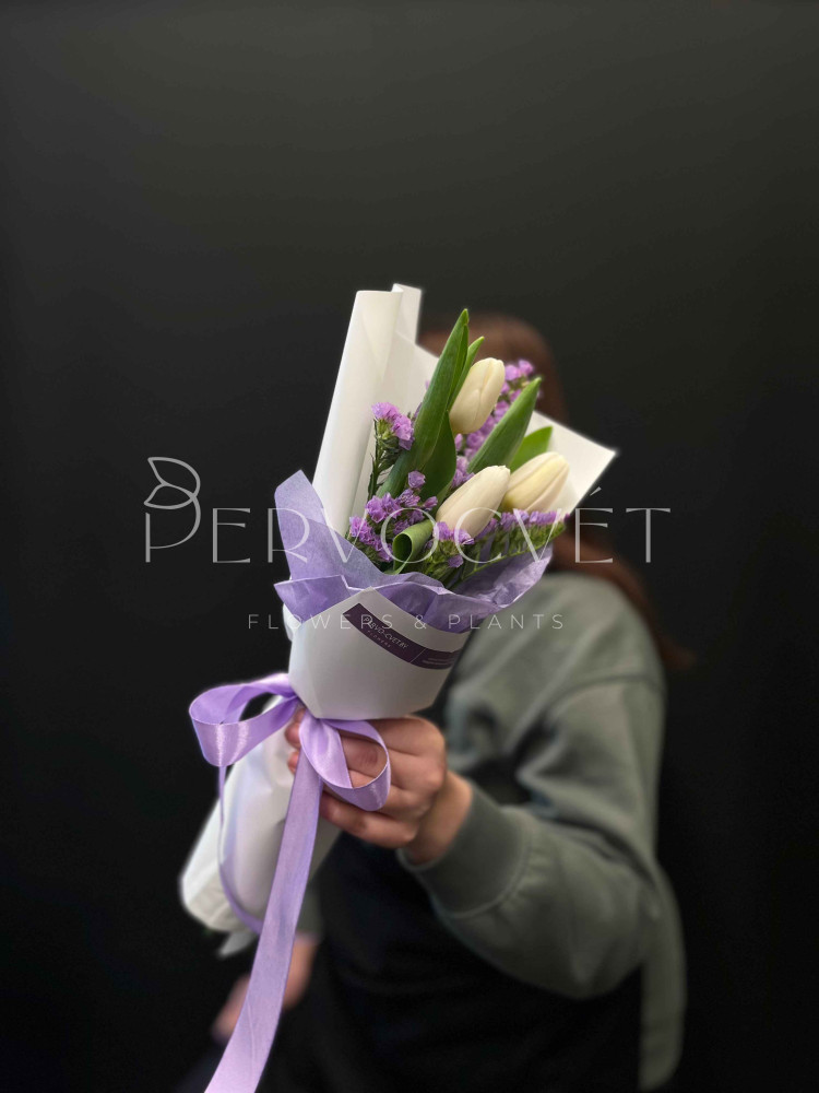 Букет из белых тюльпанов с веточкой статицы в стильной упаковке - прекрасный комплимент к 8 марта!