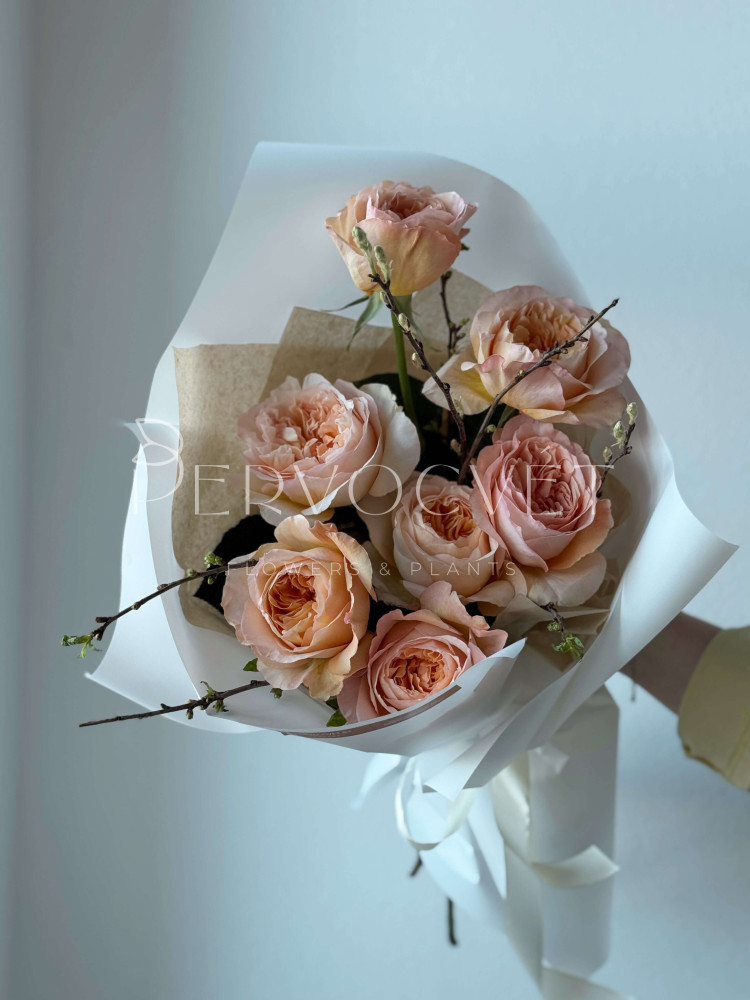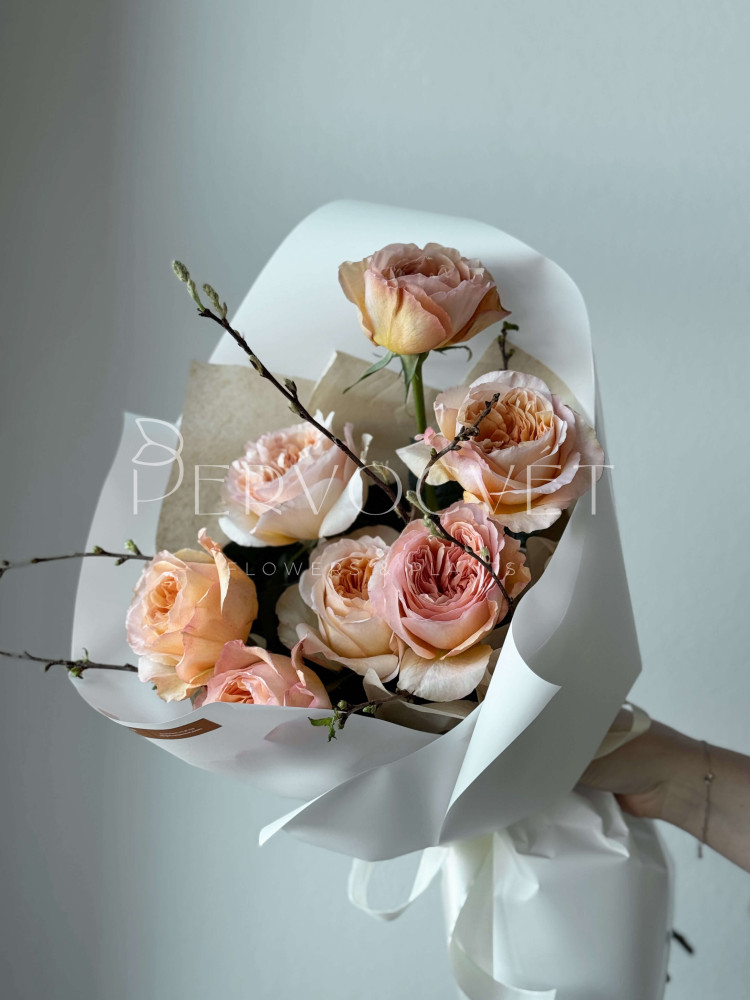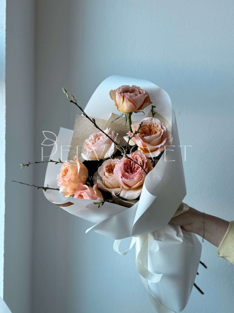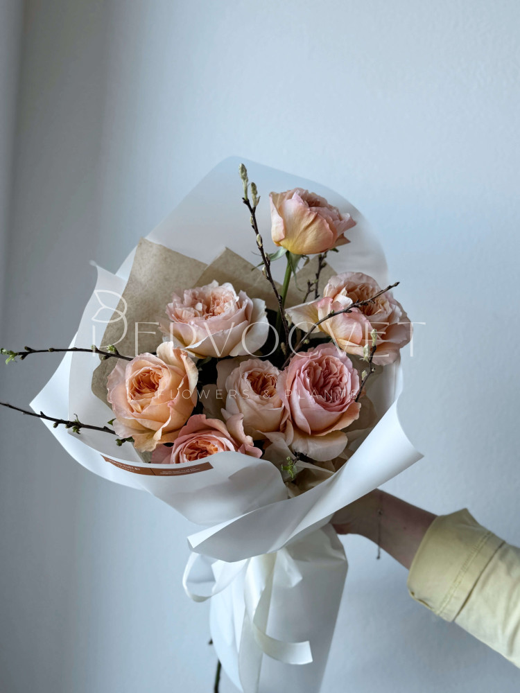 Весна и ее любимые розы! Фактура и раскрытие пионовидной розы не сравнить ни с чем. Красота, элегатность в сочетании с цветущими веточками, которые наполнят весной ее дом и будут поднимать настроение каждое утро, раскрываясь новым бутоном. Каждый сезон - выбирайте сезонные букеты!