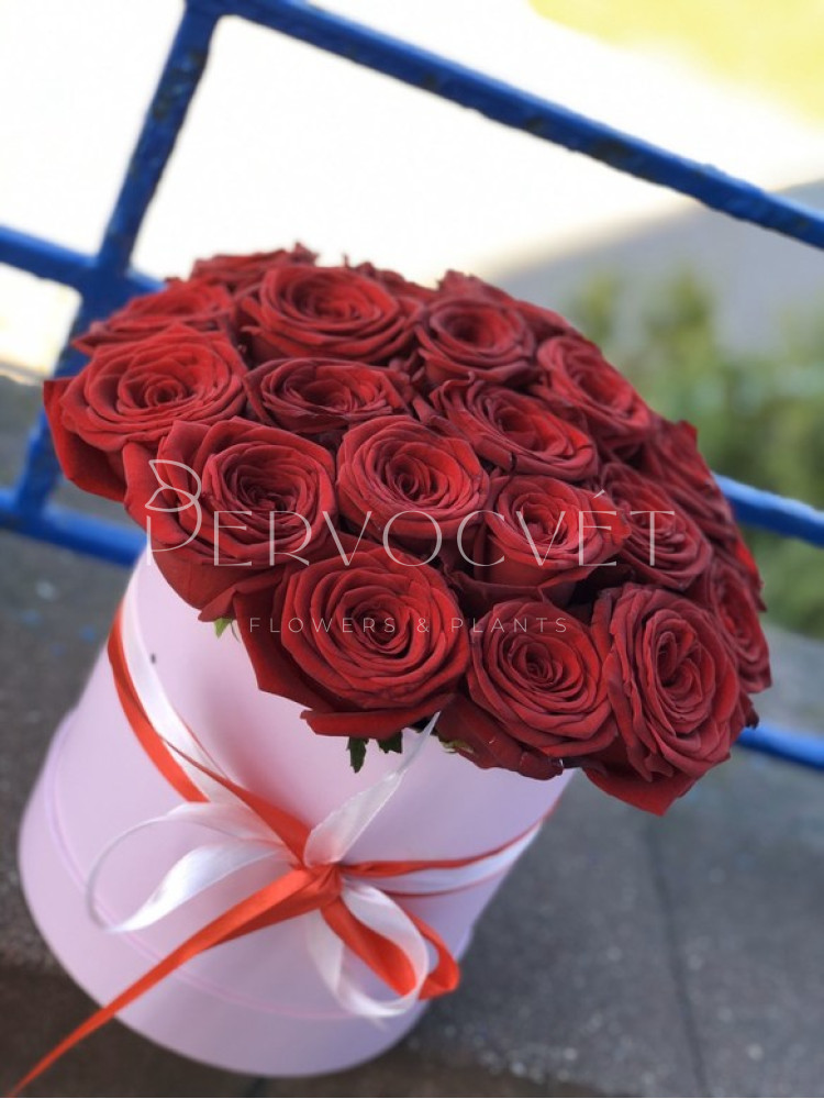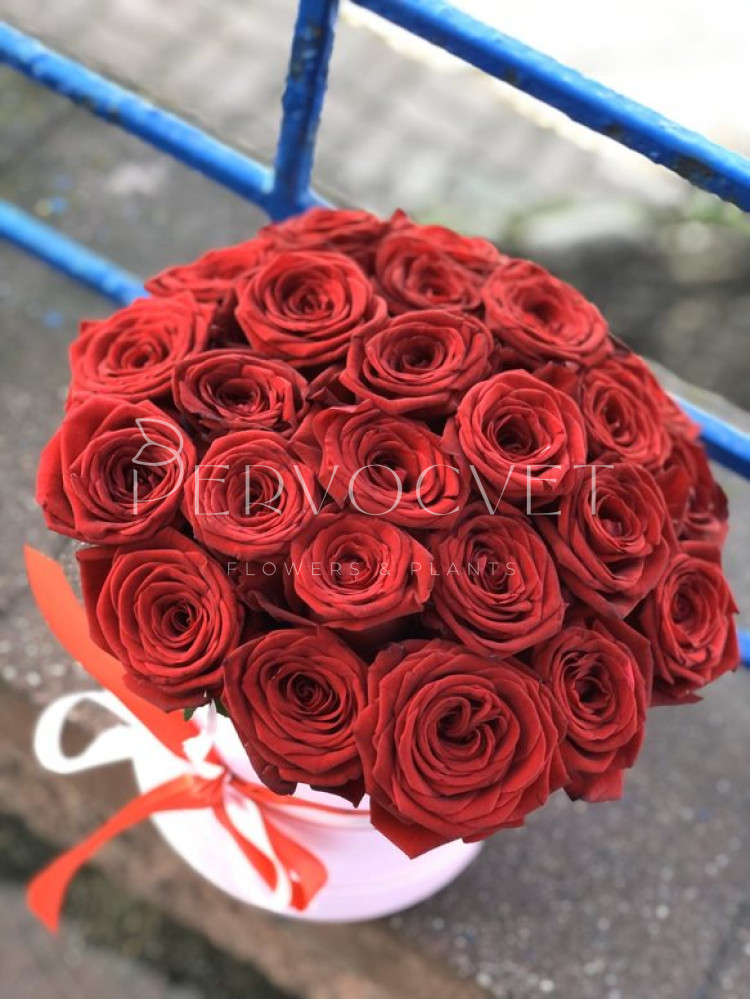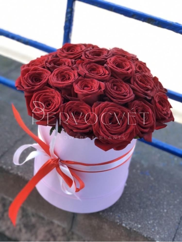 Двадцать пять красных (алых) бутонов роз в шляпной коробке - незабываемый подарок для дорогого человека!