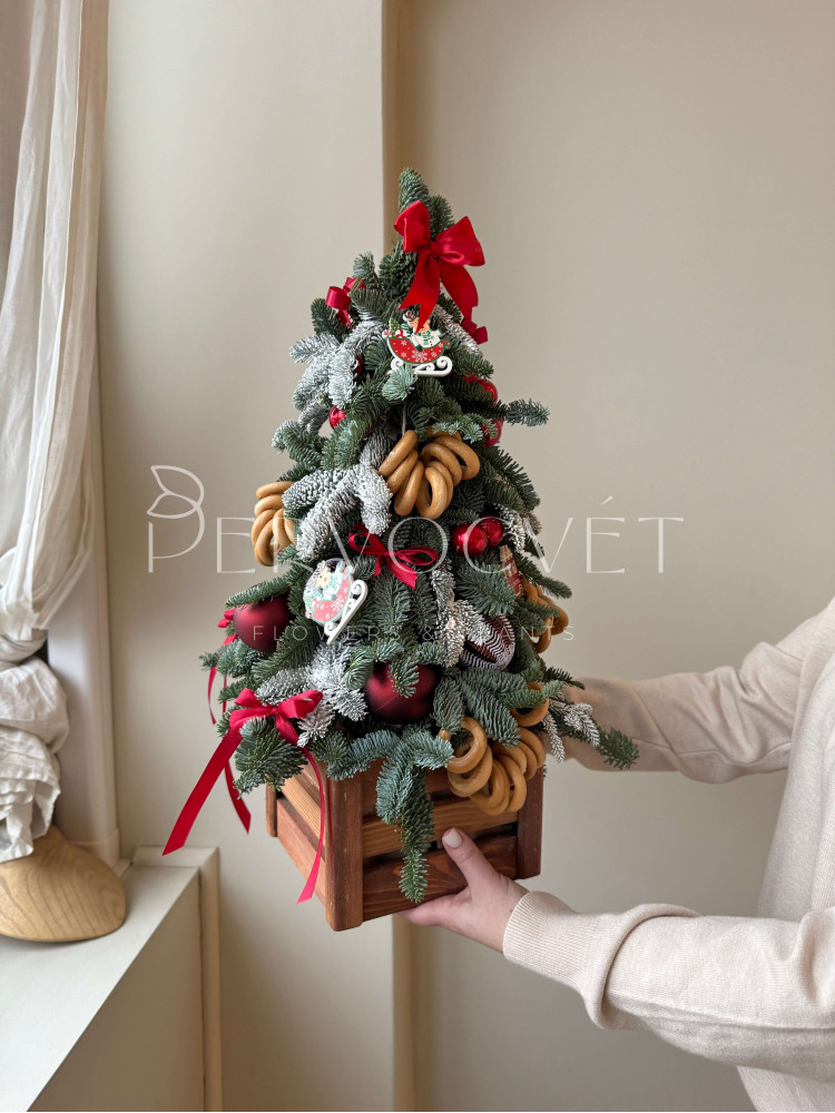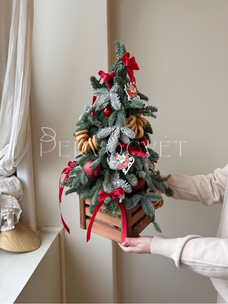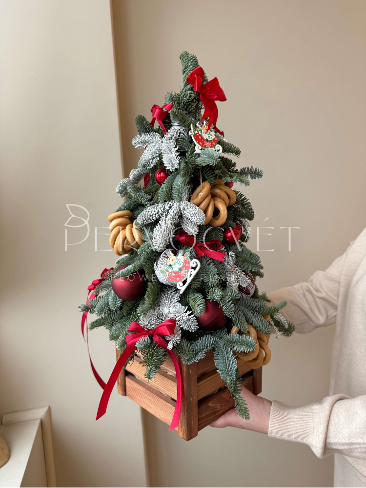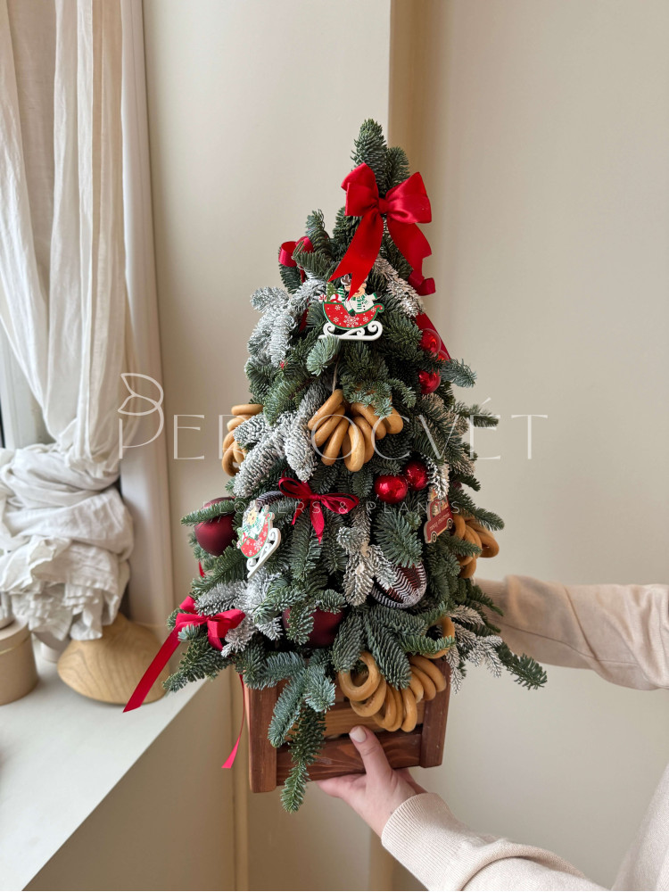 состав: нобилис (елка), шарики, деревянные фигурки, сушки (баранки), бантики, деревянный ящик, искусственный снег